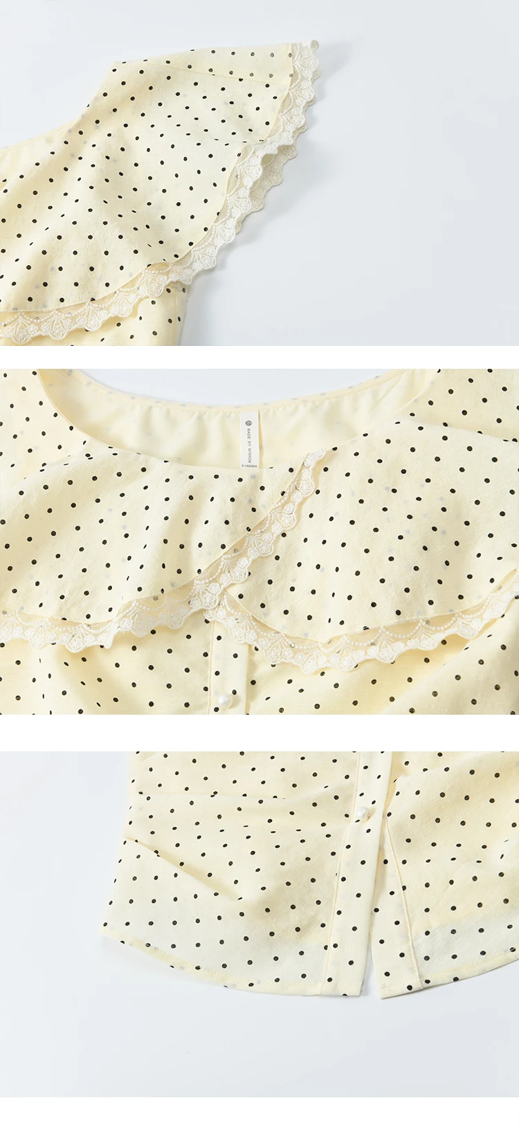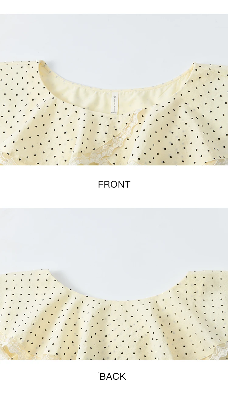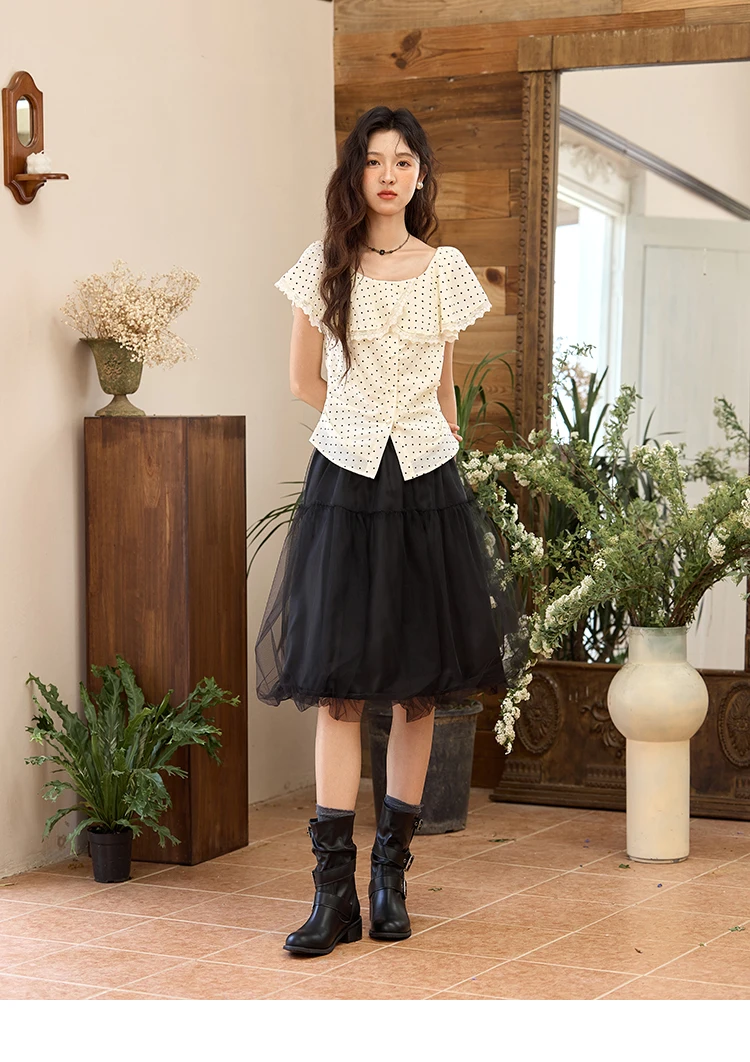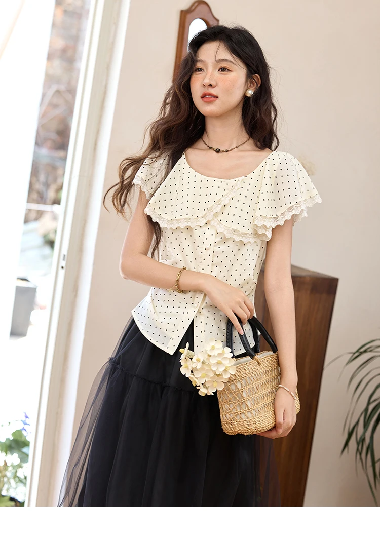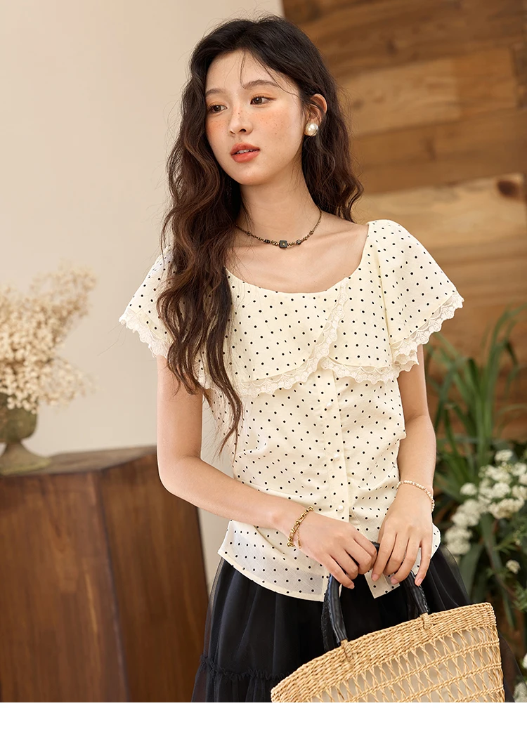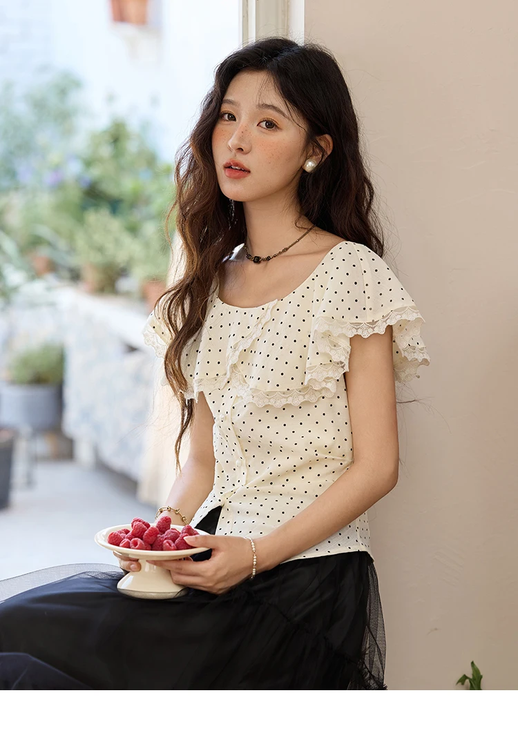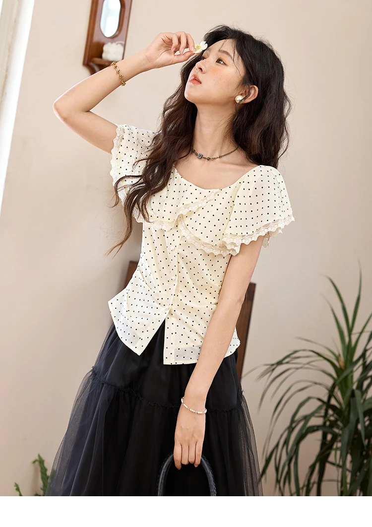 MISHOW Women's Apricot Polka Dot Shirt 2025 Summer French Ruffle Edge Patchwork Lace Shirts Short Sleeved Slim Top MXE34X1783