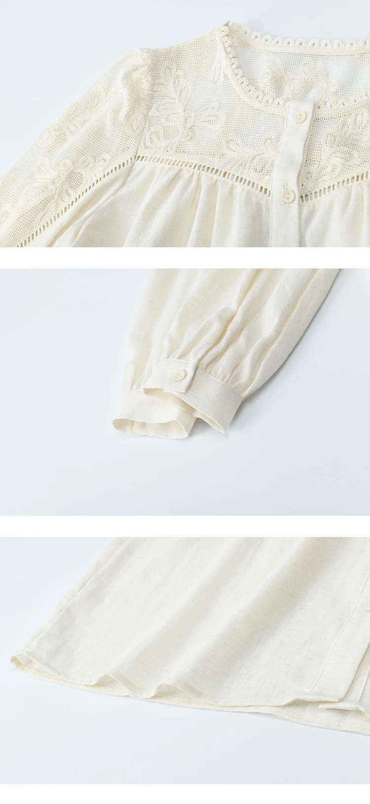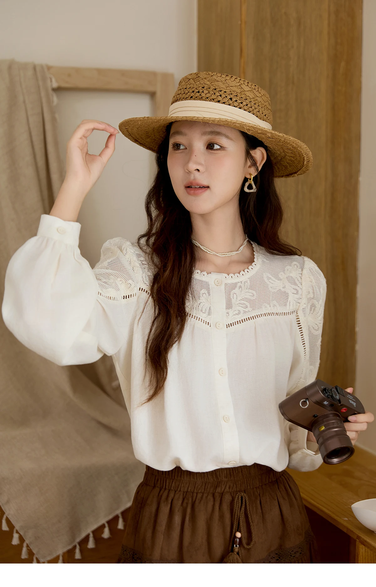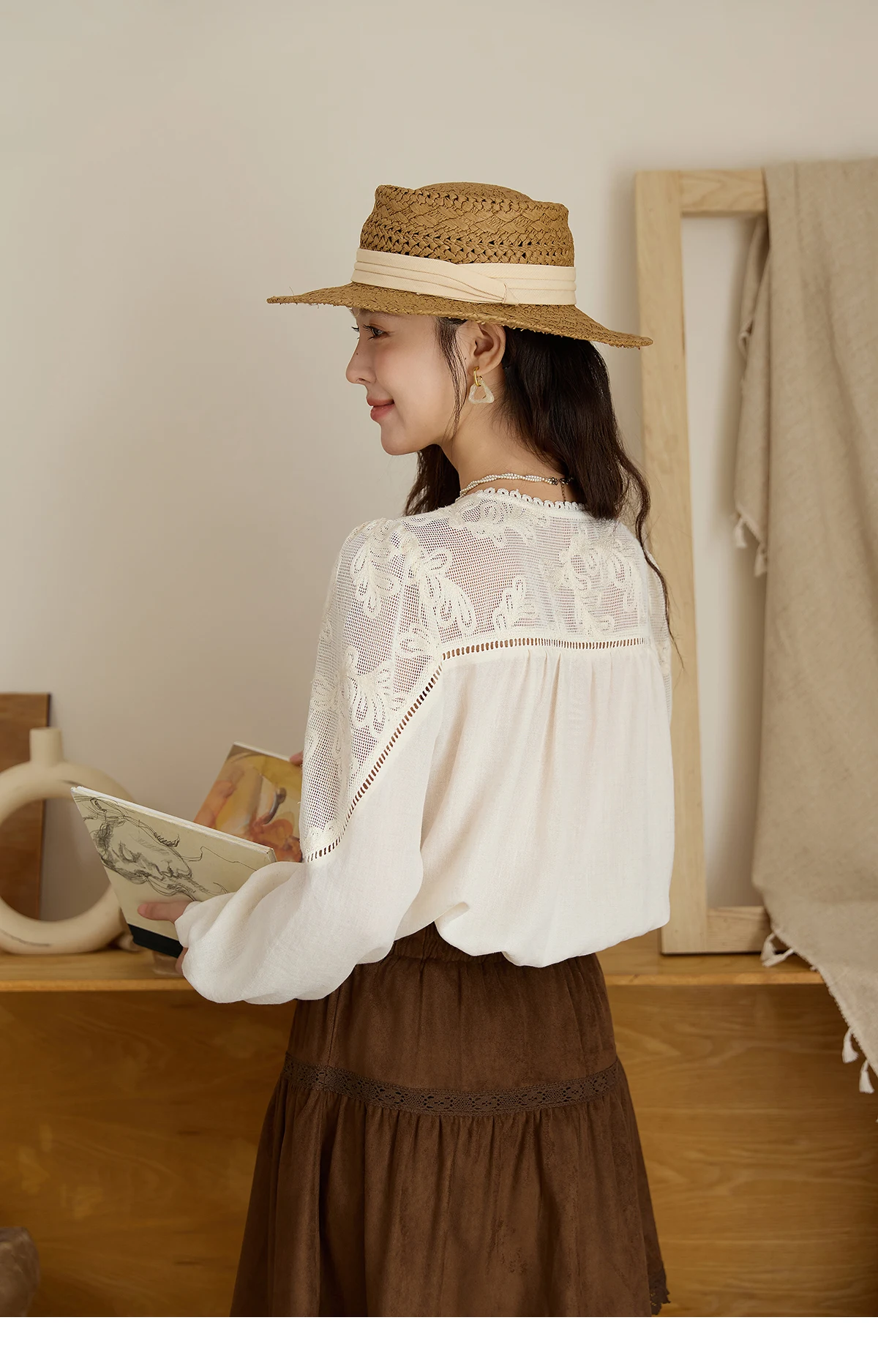 MISHOW Women's Beige Hollow Out Embroidery Shirt Autumn French Elegant Long Sleeve O-Neck Shirts Retro Commute Tops MXE44X2498