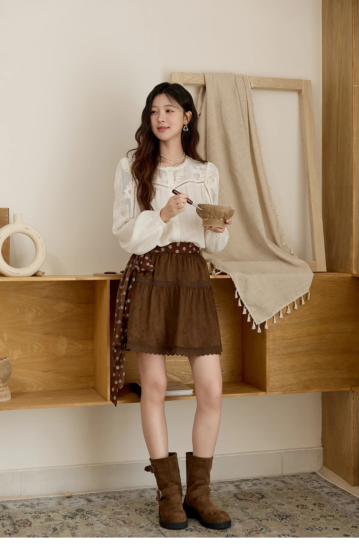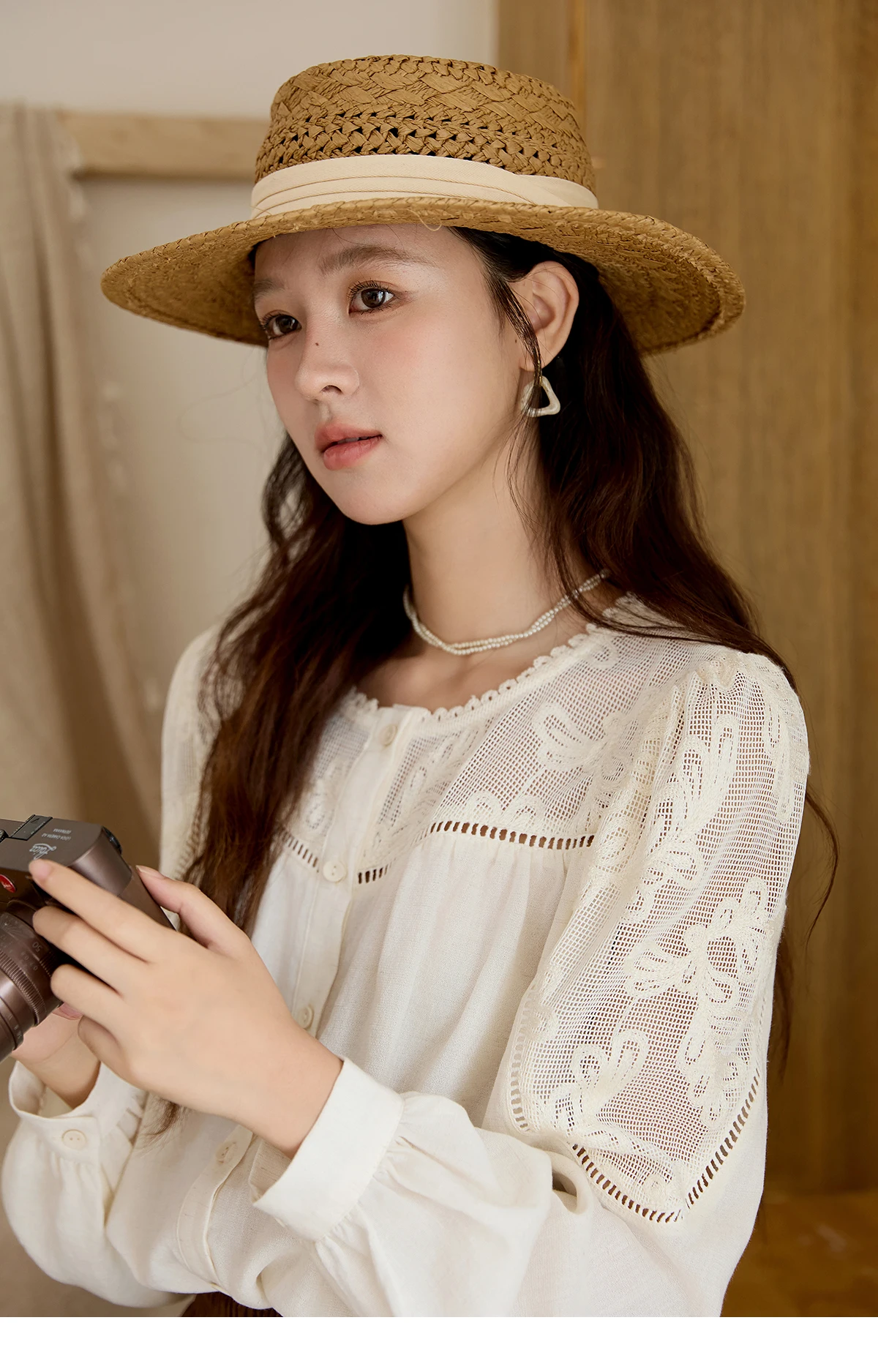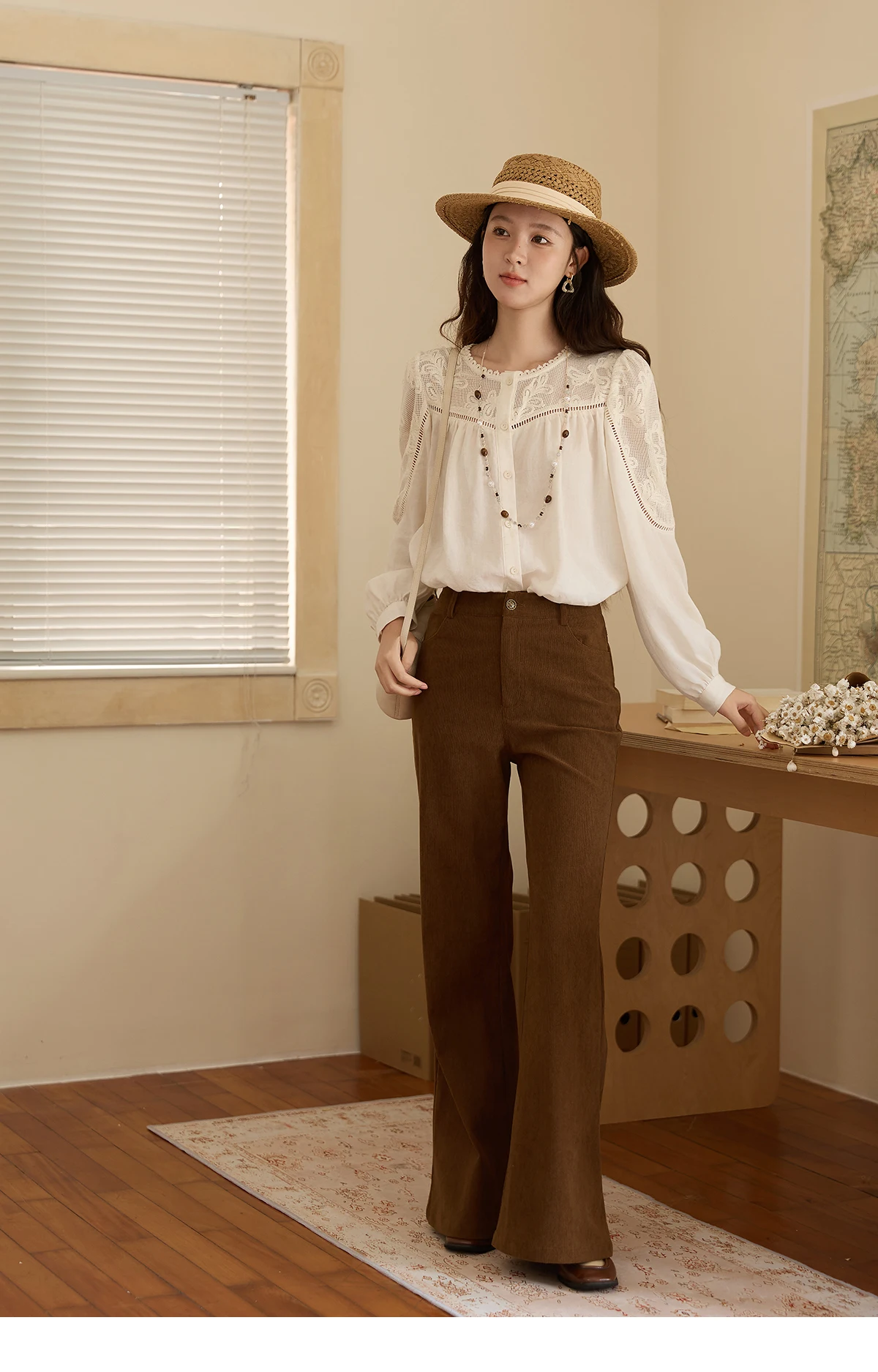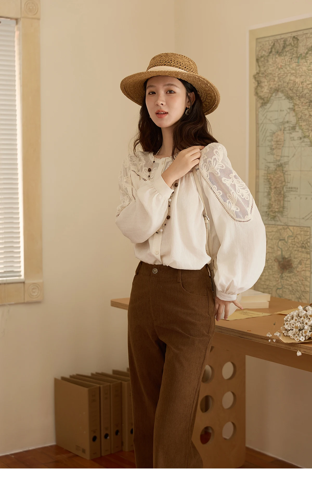 MISHOW Women's Beige Hollow Out Embroidery Shirt Autumn French Elegant Long Sleeve O-Neck Shirts Retro Commute Tops MXE44X2498