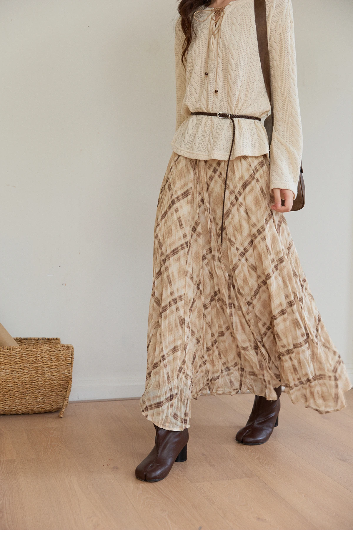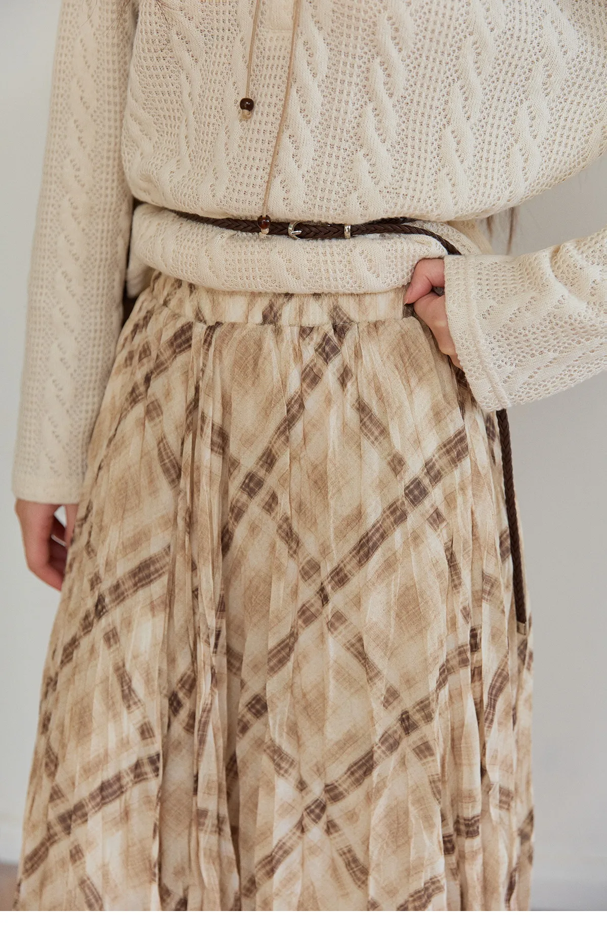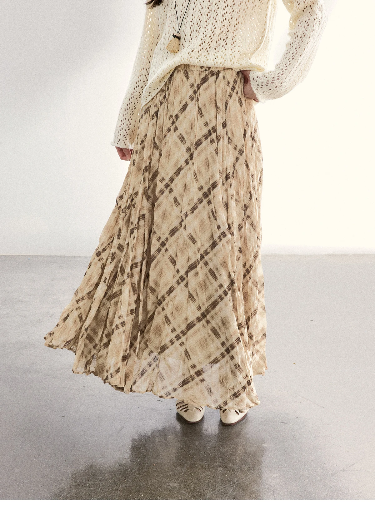 MISHOW Women's Beige Plaid Maxi Skirt 2026 Spring High Waist Flowy A-Line Skirts Elastic Waist Casual Chiffon Skirt MXF108B0769