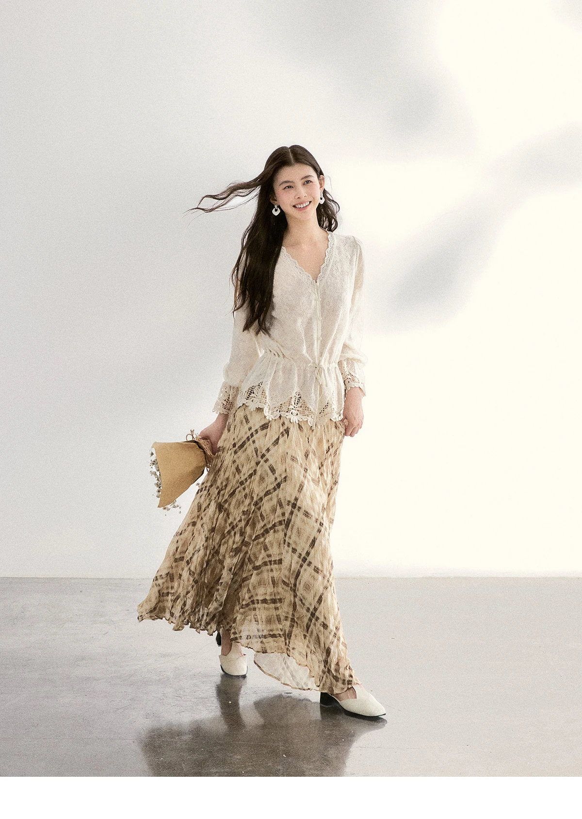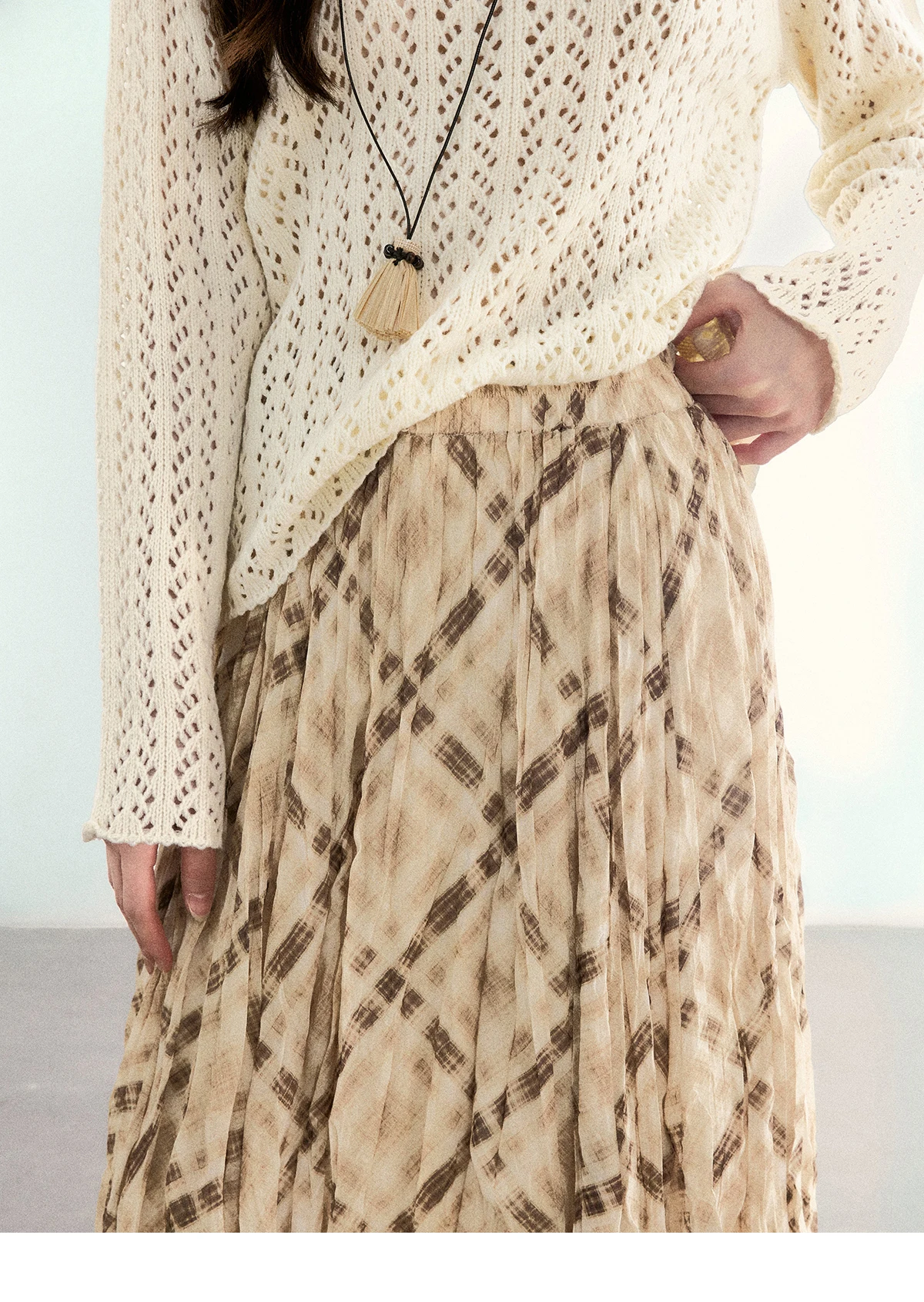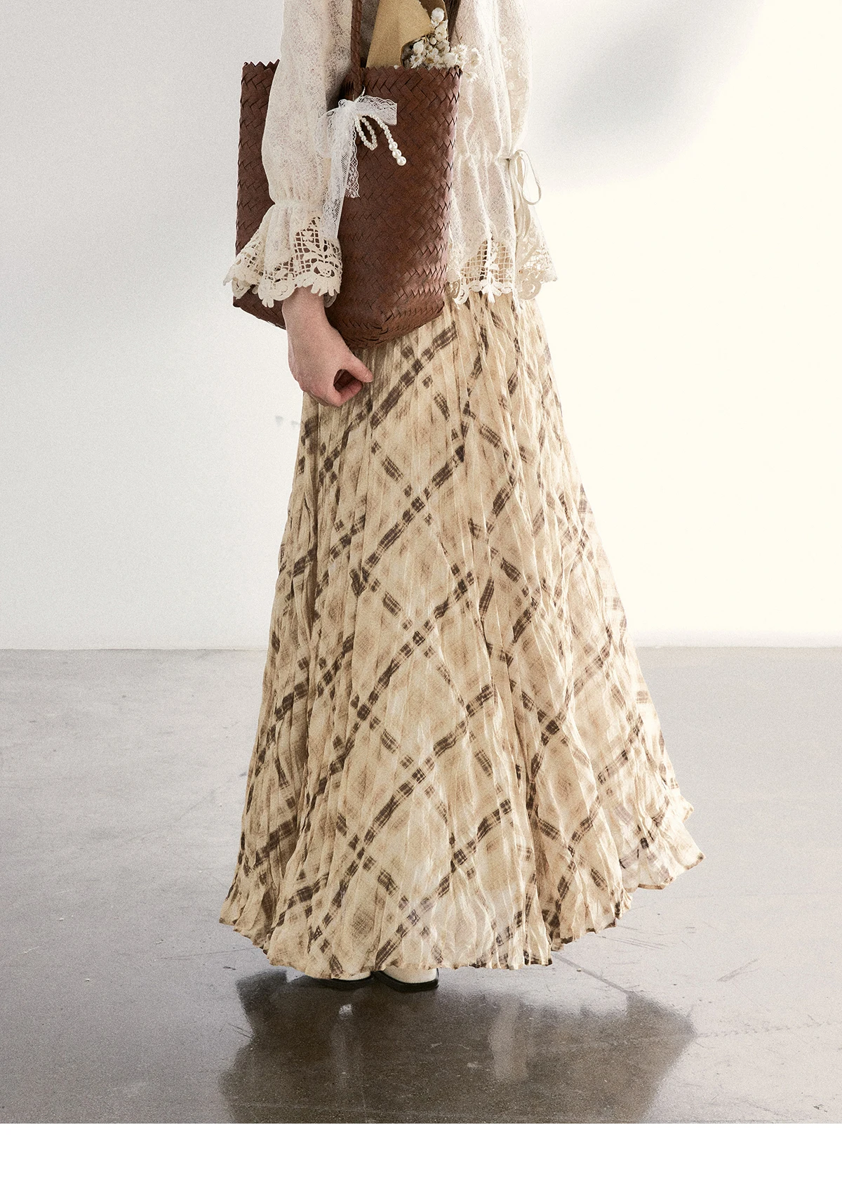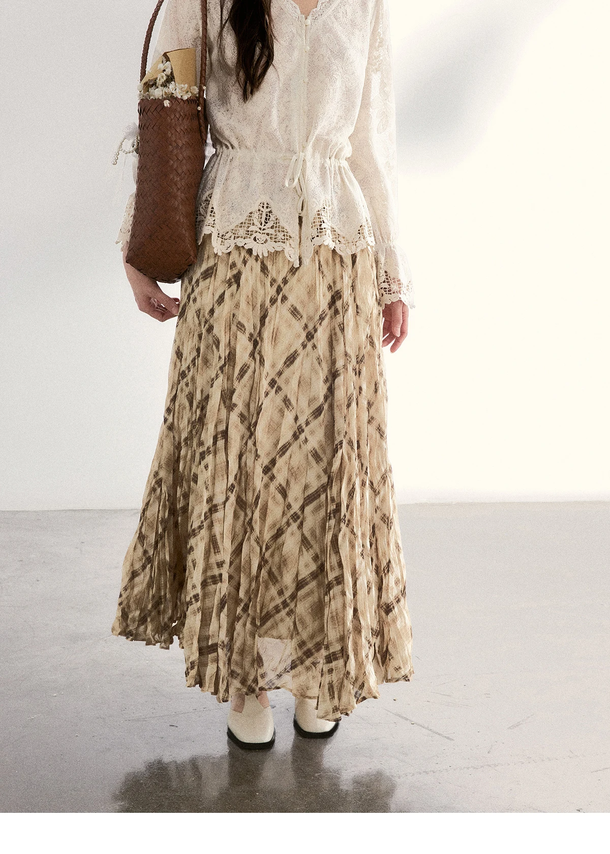 MISHOW Women's Beige Plaid Maxi Skirt 2026 Spring High Waist Flowy A-Line Skirts Elastic Waist Casual Chiffon Skirt MXF108B0769