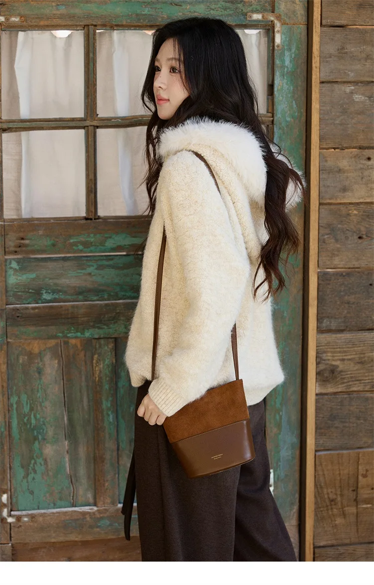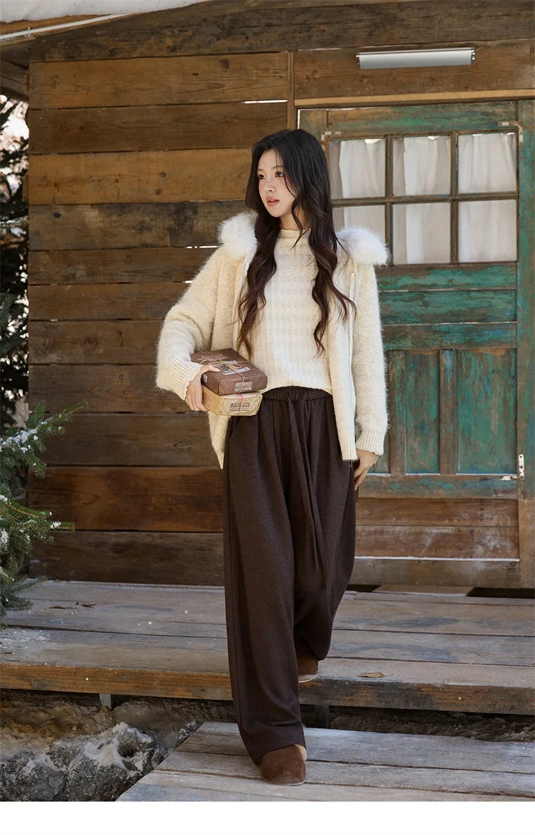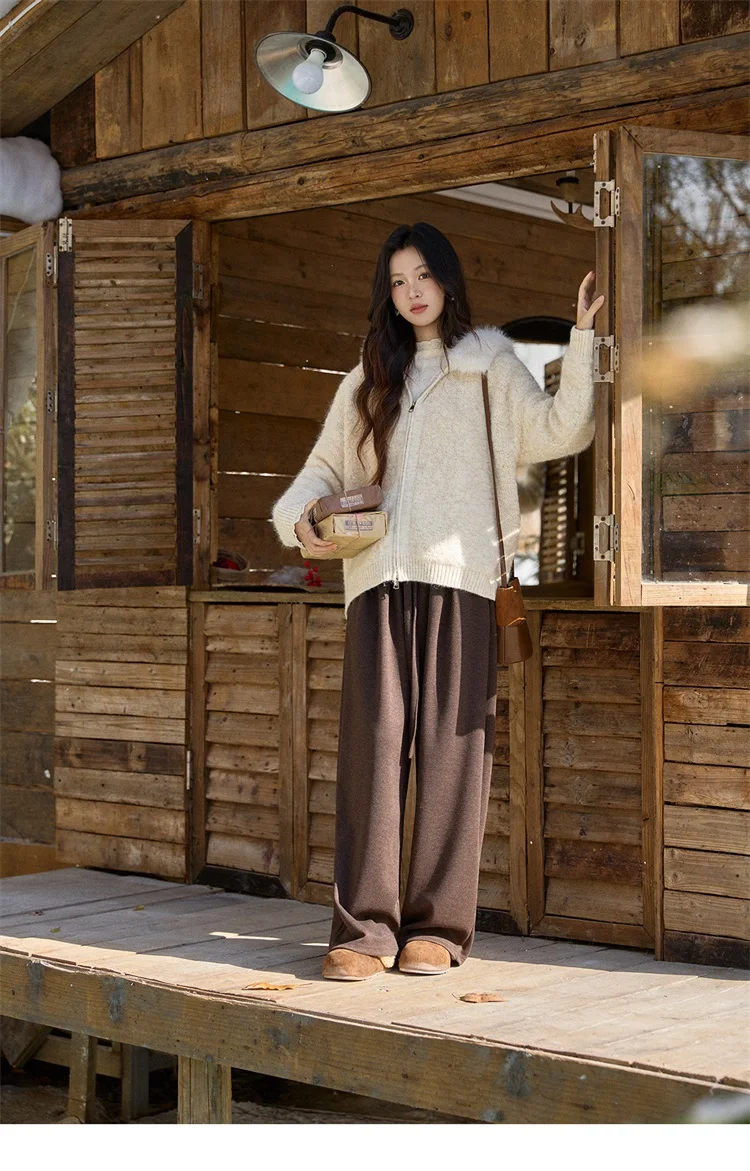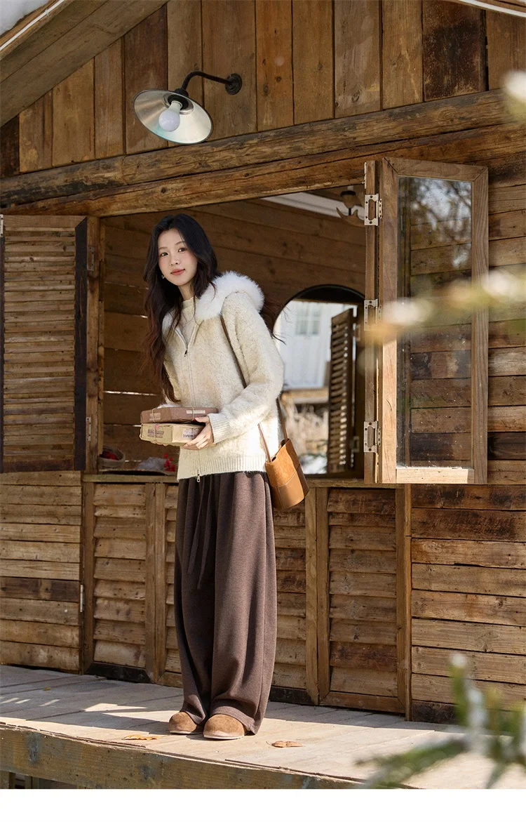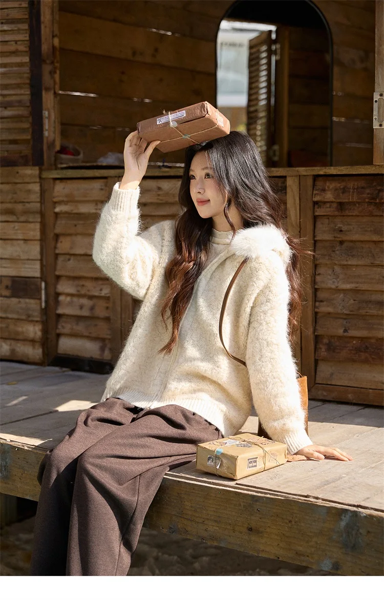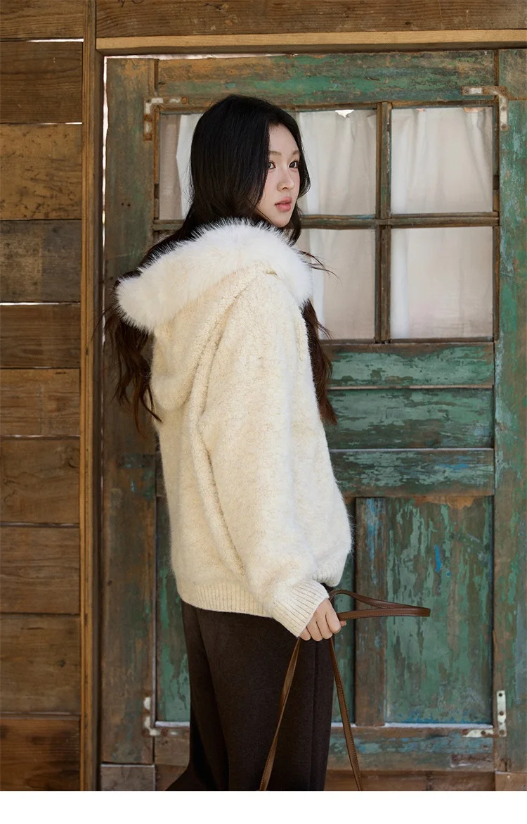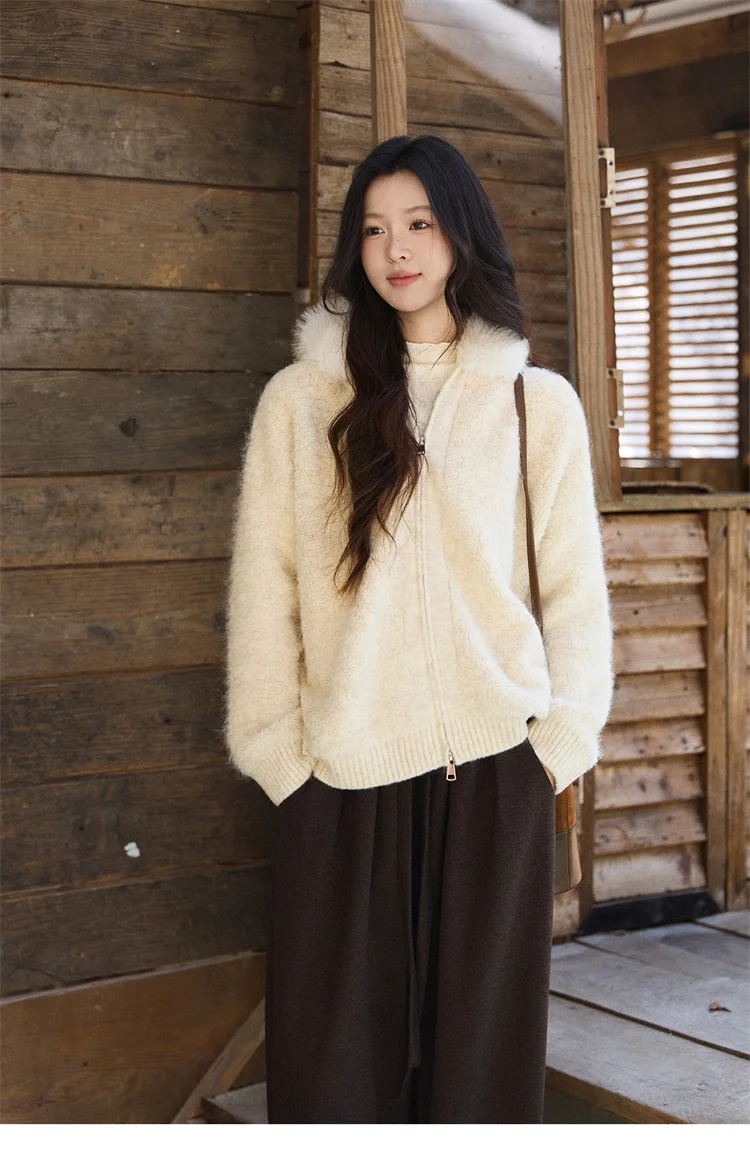 MISHOW Women's Beige White Cardigan Winter Fur Hood Zipper Warm Loose Outerwear Towel Embroidered Knitted Cardigan MXE94Z2963