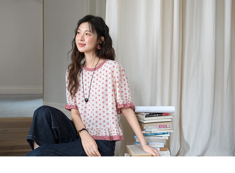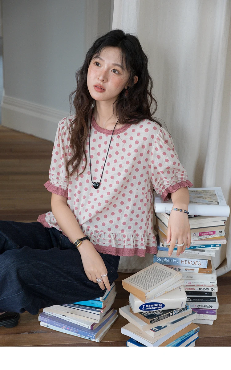 MISHOW Women's Blouse Fashion Pink Polka Dot Short Top 2025 Summer Sweet Puff Sleeve Blouse Casual Female Clothing MXE37X1900