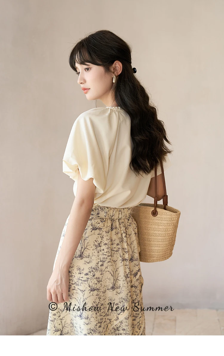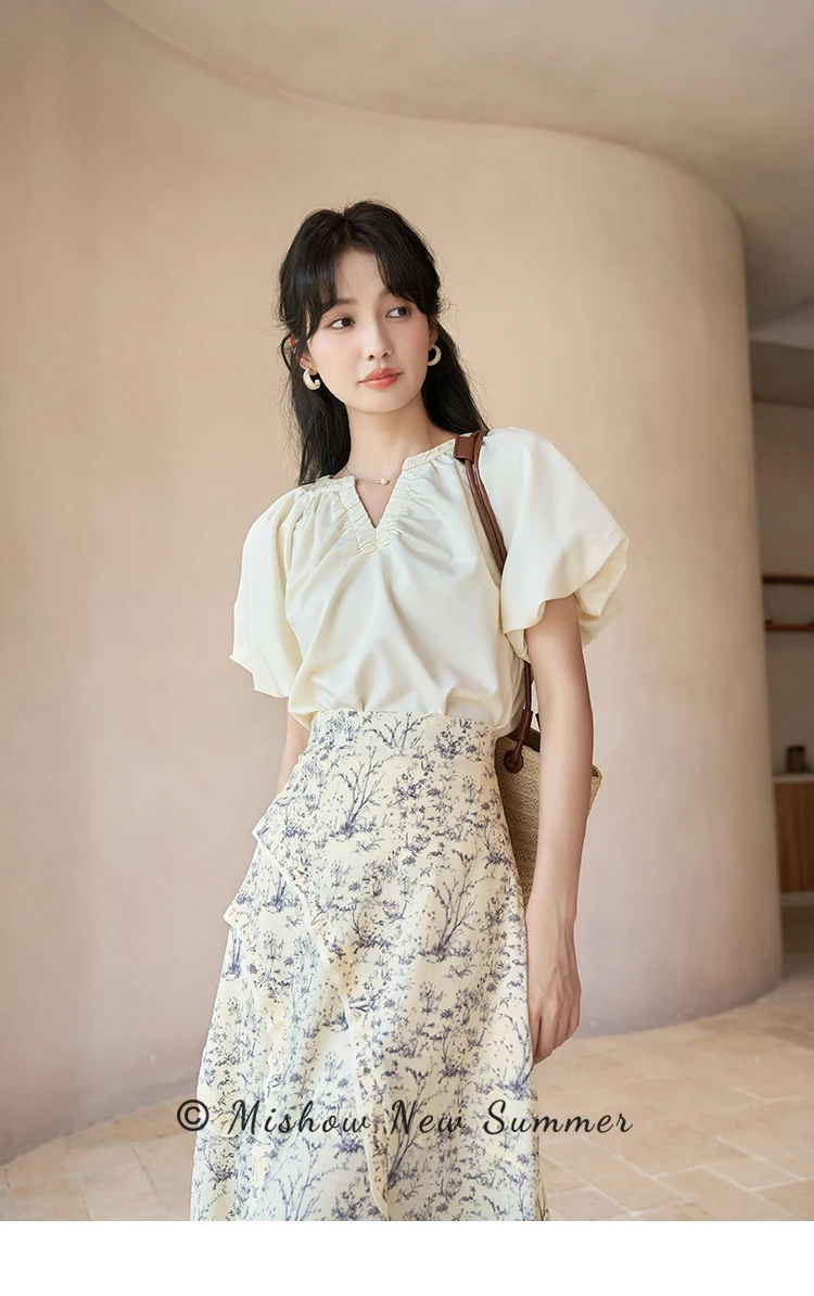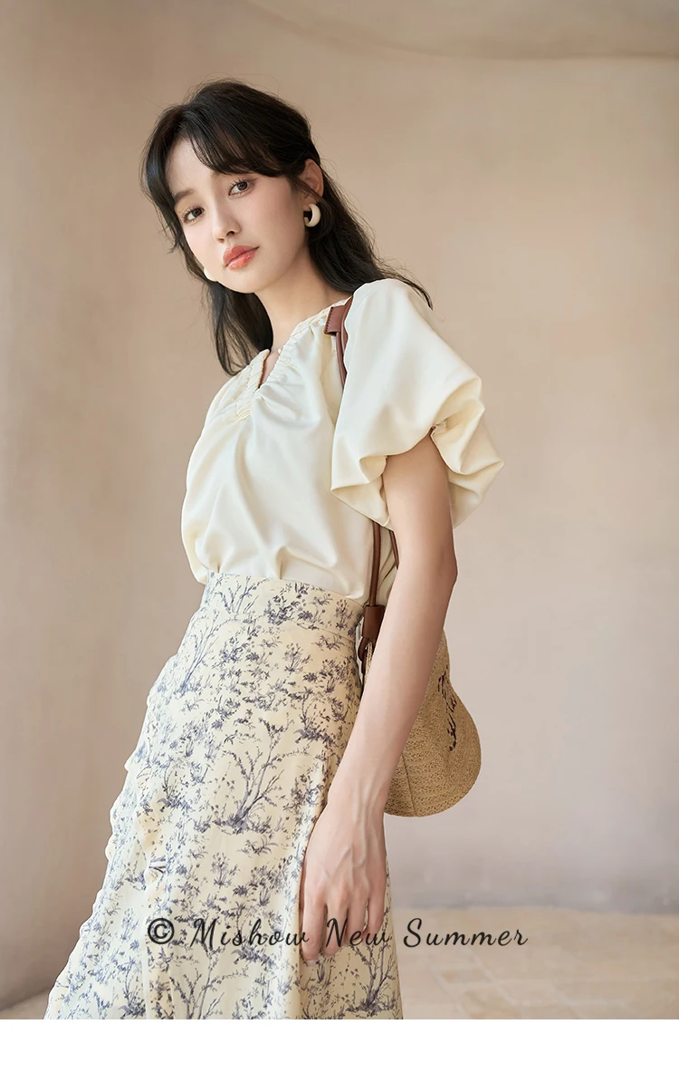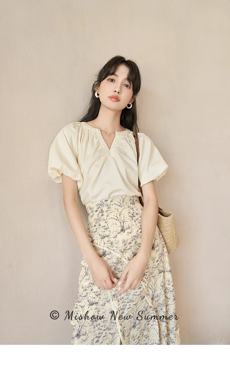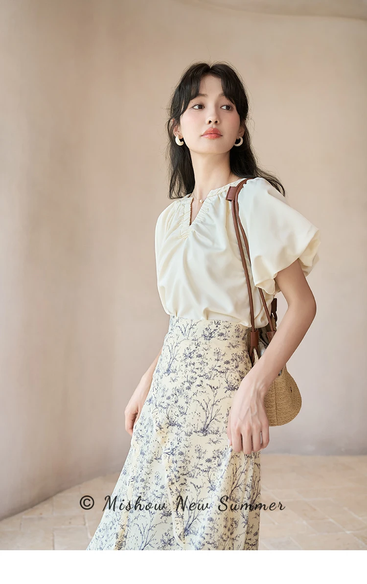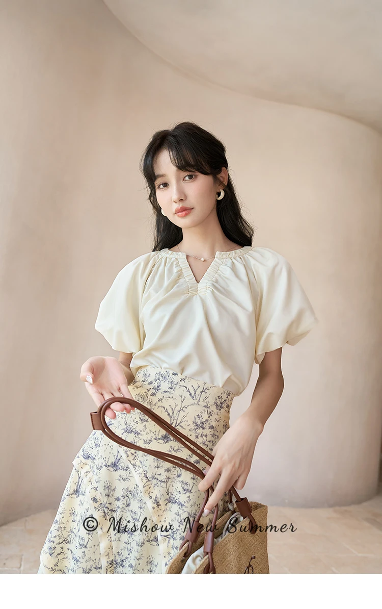 MISHOW Women's Blouses 2023 Summer French Elegant Solid V-Neck Short Sleeve Pullover LOOSE female Puff Sleeve Tops MXC38X0043