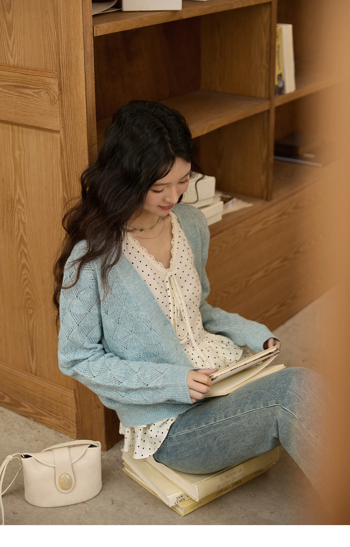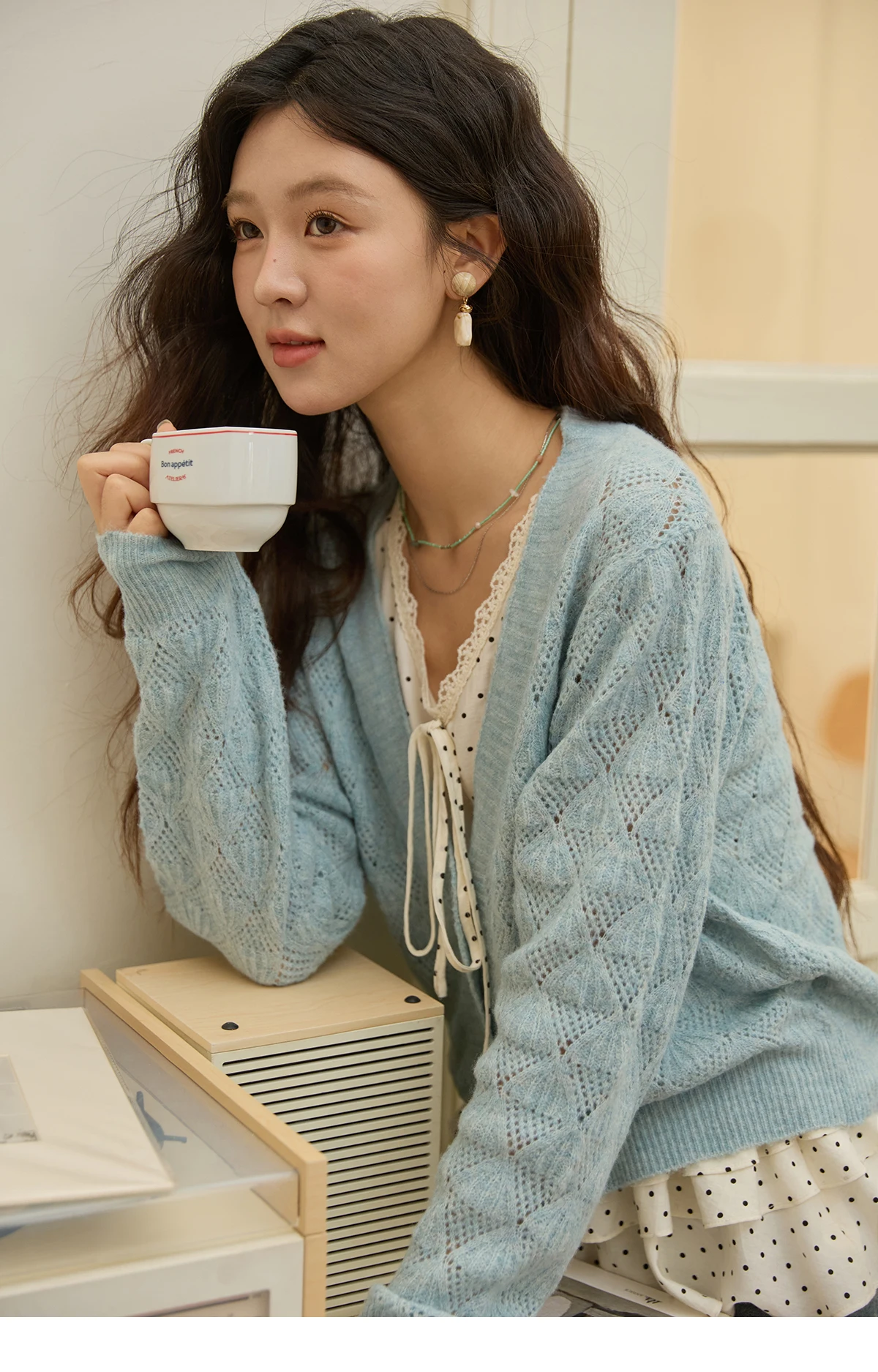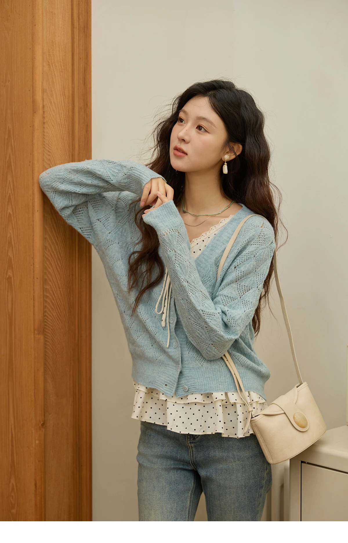 MISHOW Women's Blue Argyle Knitted Cardigan 2025 Autumn V Neck Drop Dropped Sleeve Cardigan Hollow Out Wool Blend Top MXE41Z1313