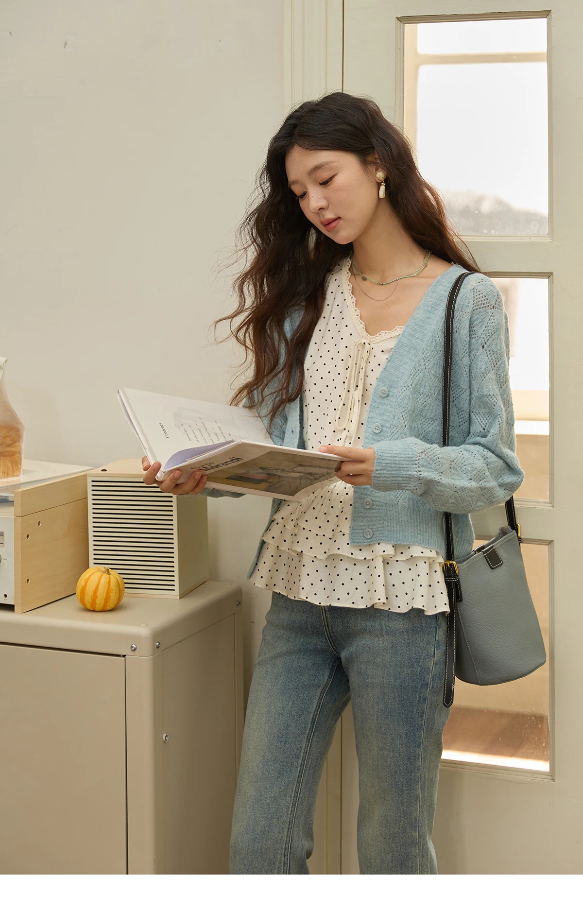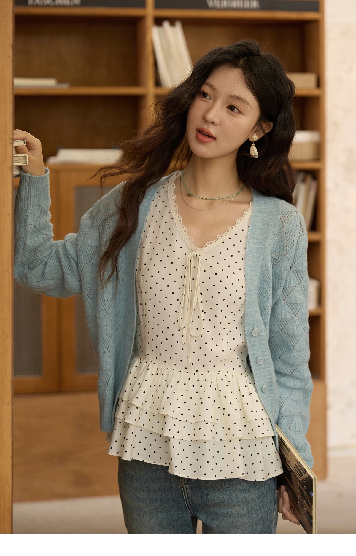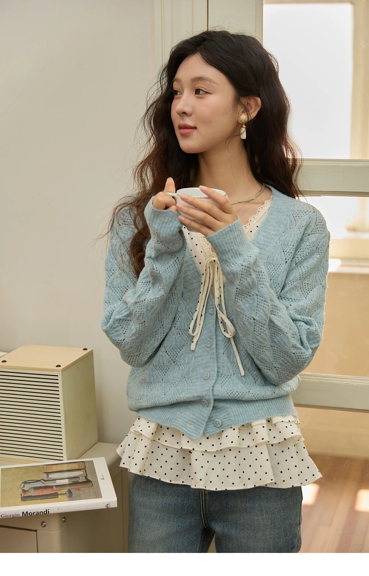 MISHOW Women's Blue Argyle Knitted Cardigan 2025 Autumn V Neck Drop Dropped Sleeve Cardigan Hollow Out Wool Blend Top MXE41Z1313
