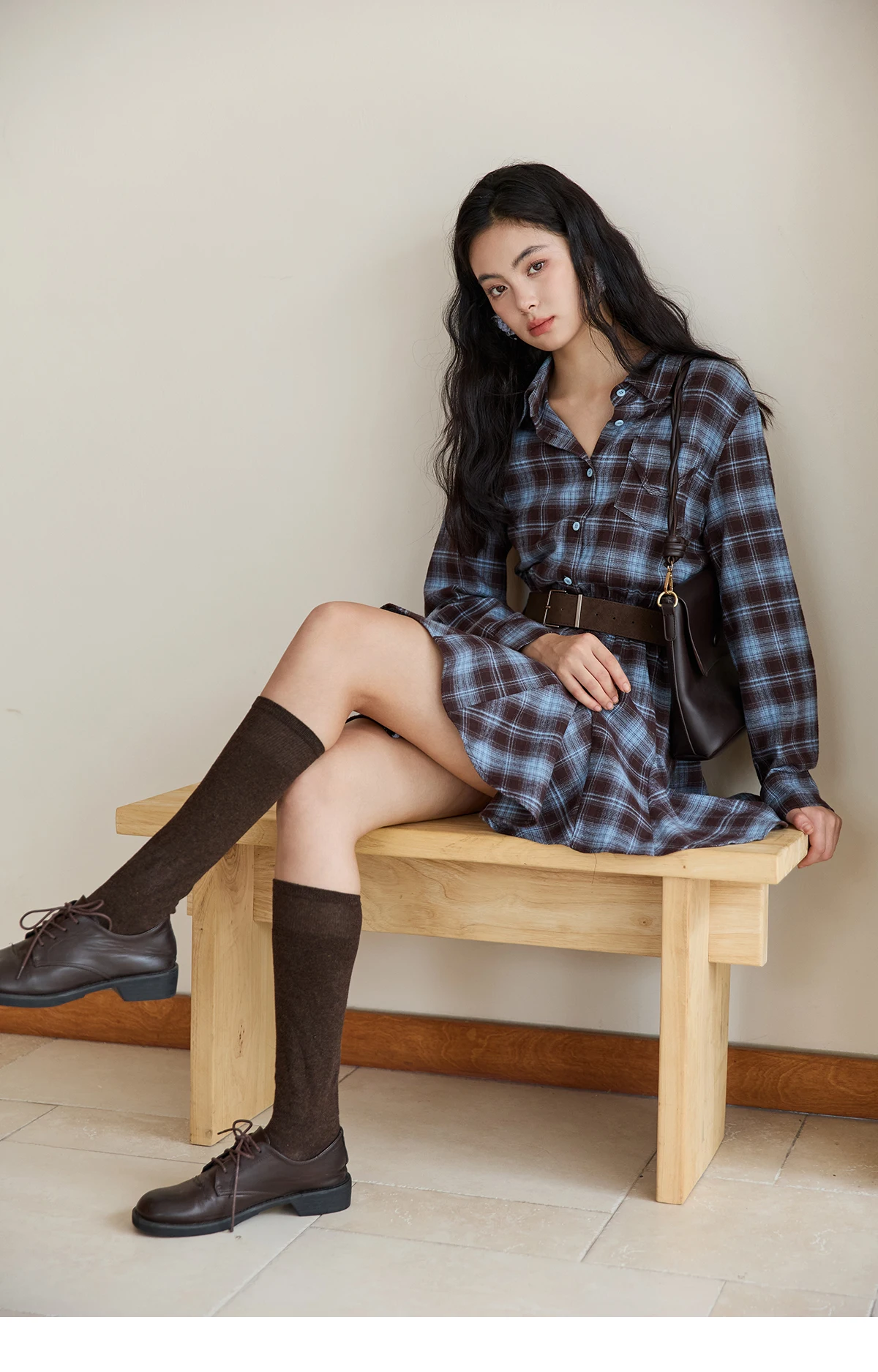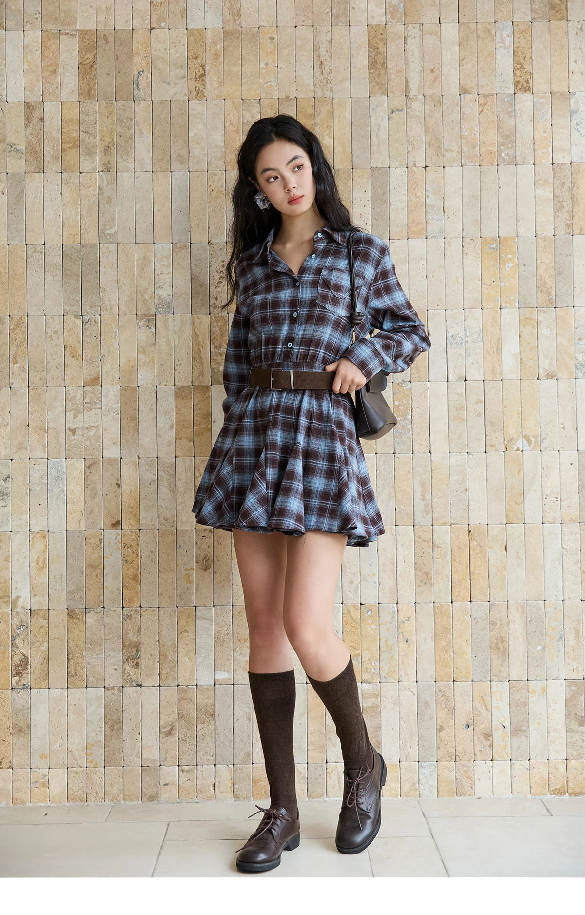 MISHOW Women's Blue Plaid Short Dress 2025 Autumn Retro Turn-down Collar Waist-Cinched Long Sleeve Dress with Belt MXE48L2525