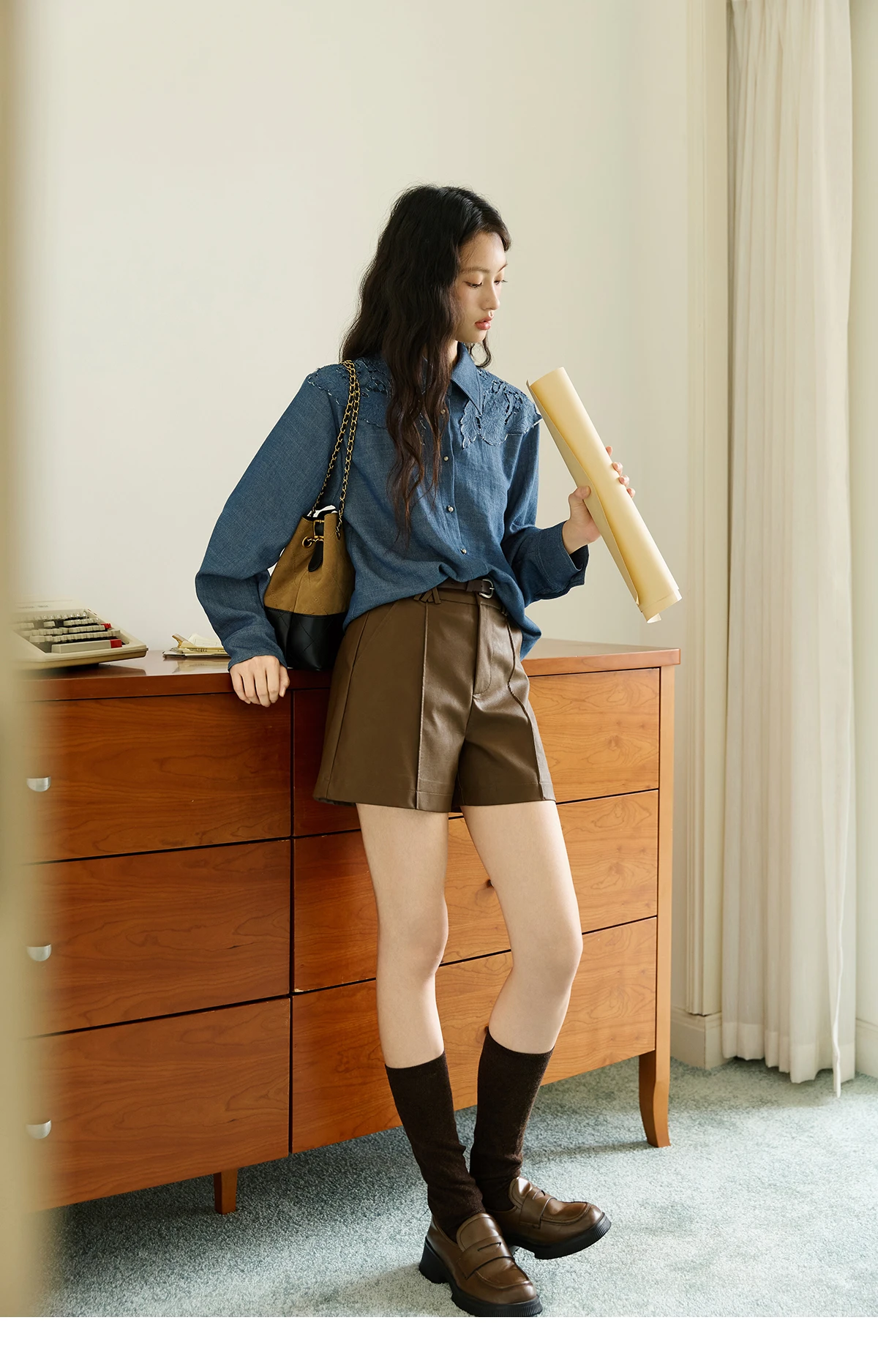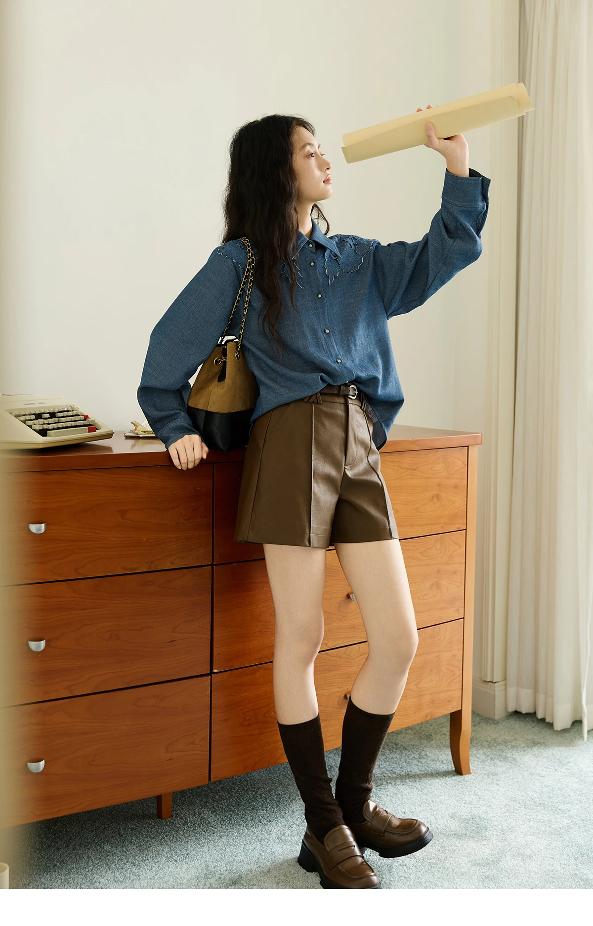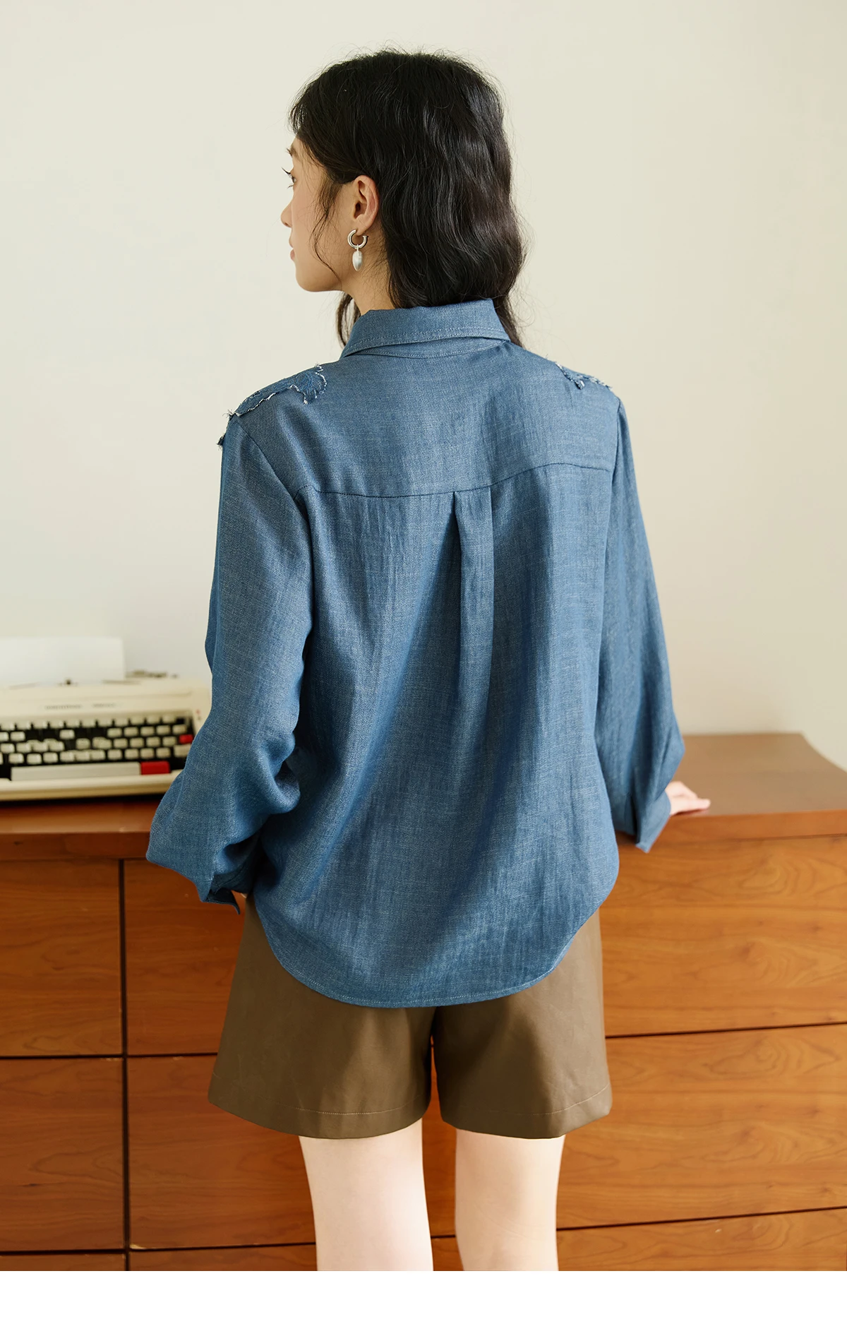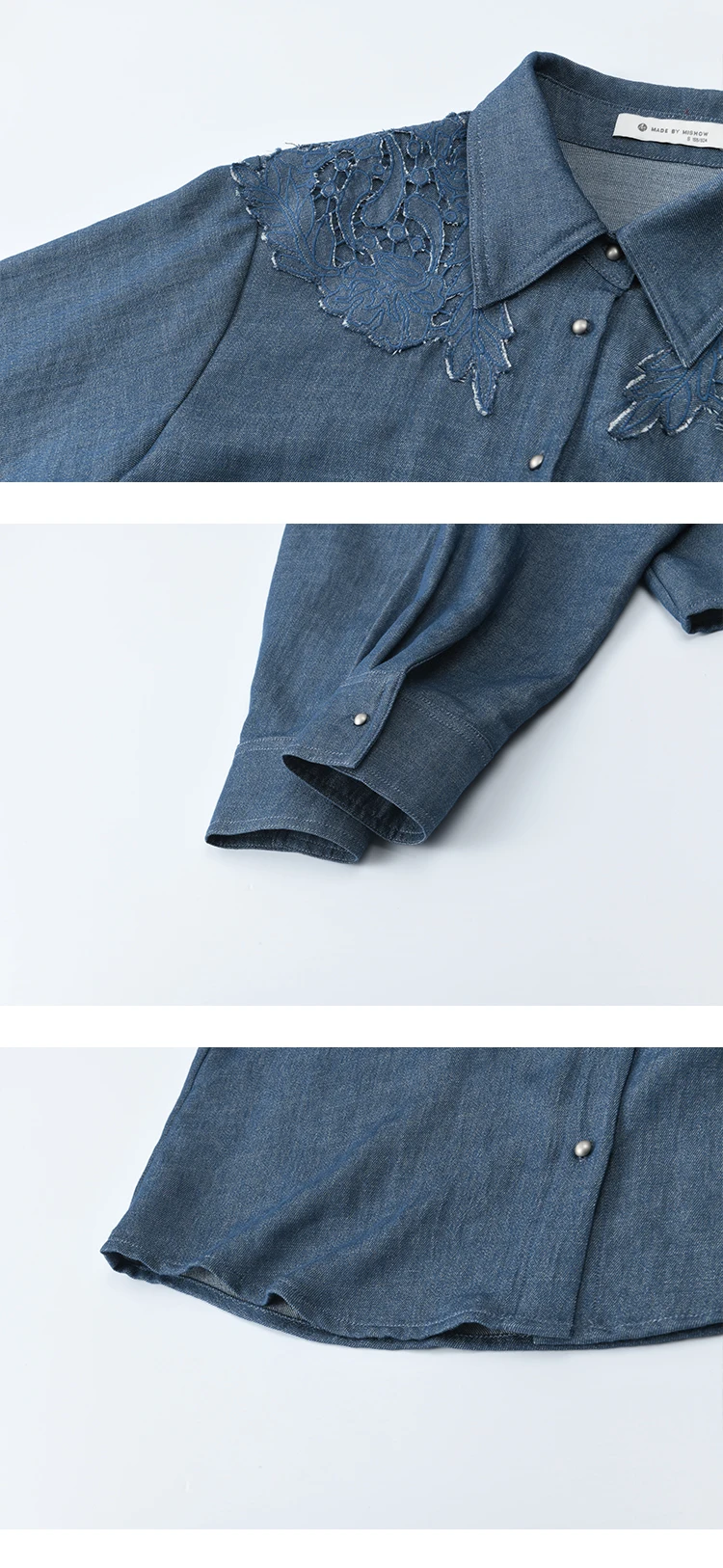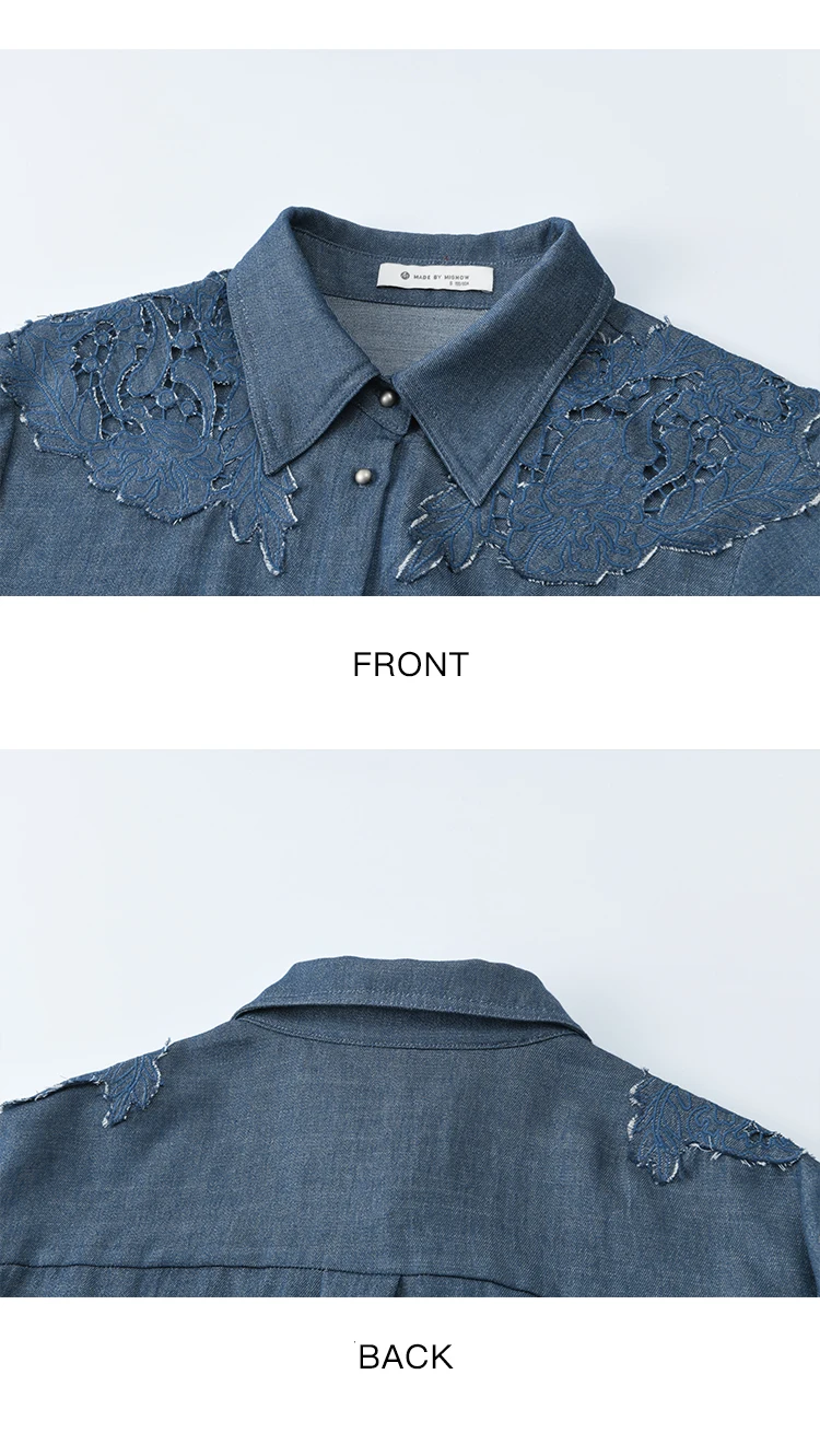 MISHOW Women's Blue Shirt Autumn 2025 Hollowed Out Patchwork Embroidery Tops Imitation Denim Fabric Loose Retro Shirt MXE46C2410