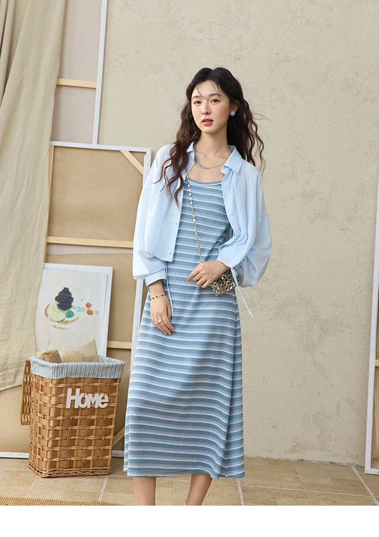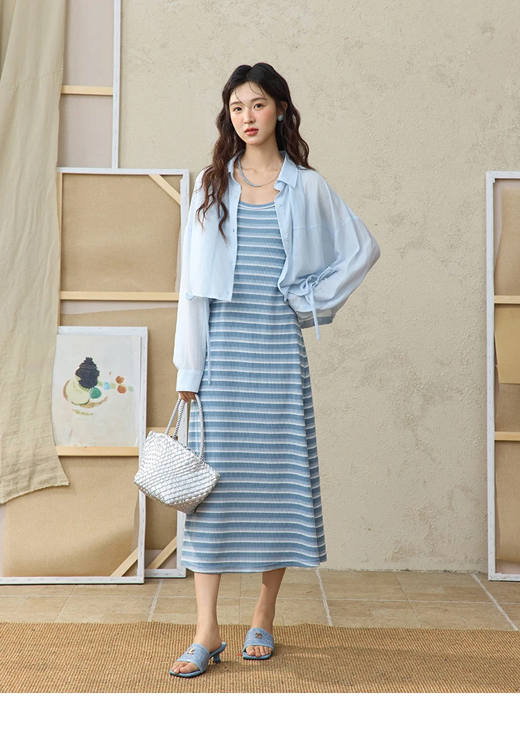 MISHOW Women's Blue Striped Camisole Dress Lyocell Shirt Separately Summer 2025 Lapel Solid Shirt O-neck Strap Dress MXE34L2285
