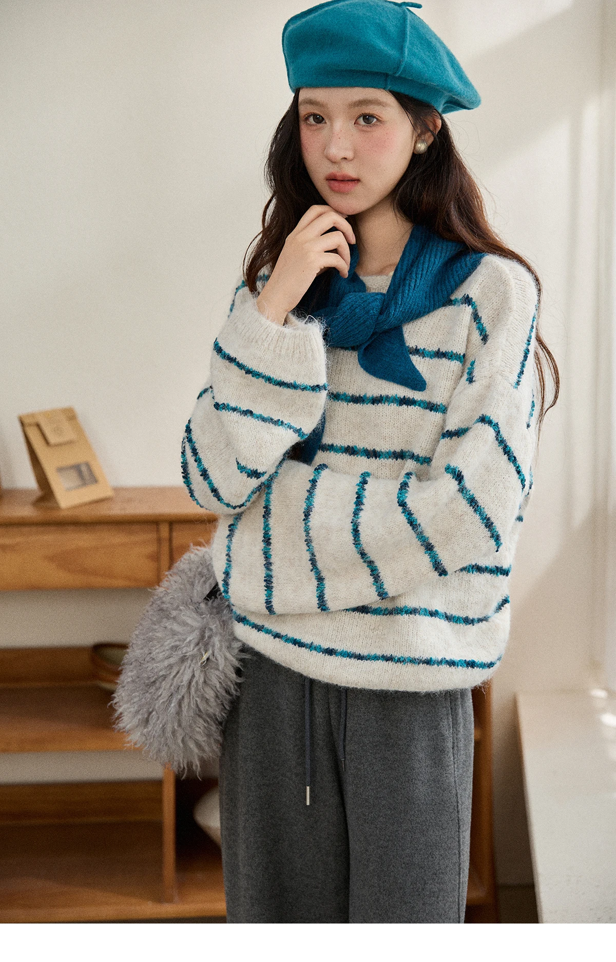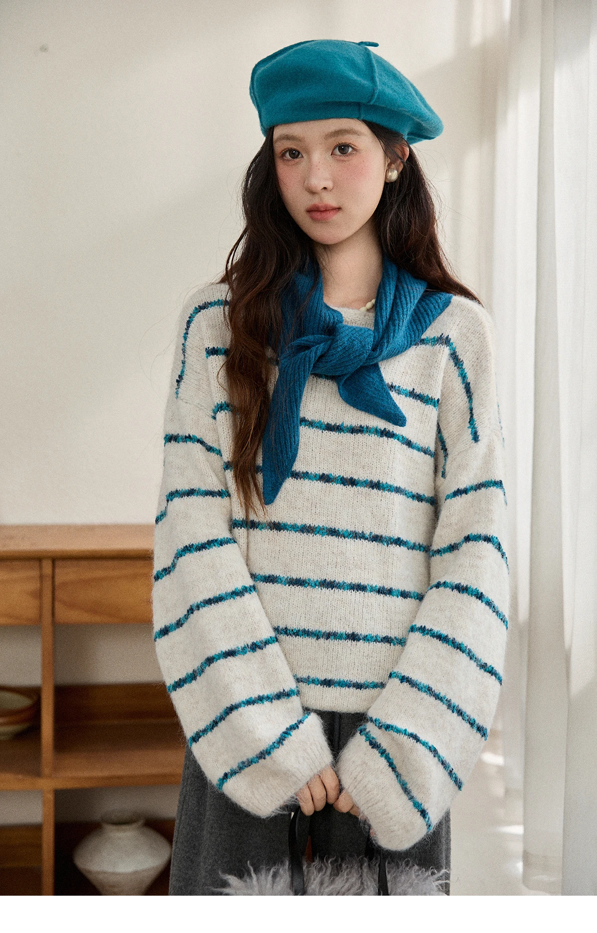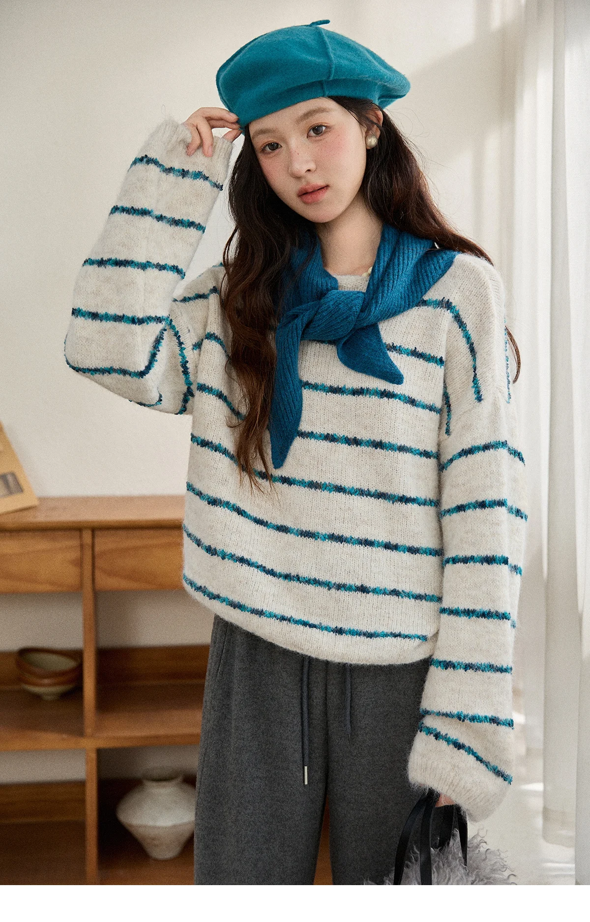 MISHOW Women's Blue Striped Sweater 2025 New Alpaca Wool Shawl Scarf Set Retro Loose Casual Knit Top Winter Clothes MXE90Z2821