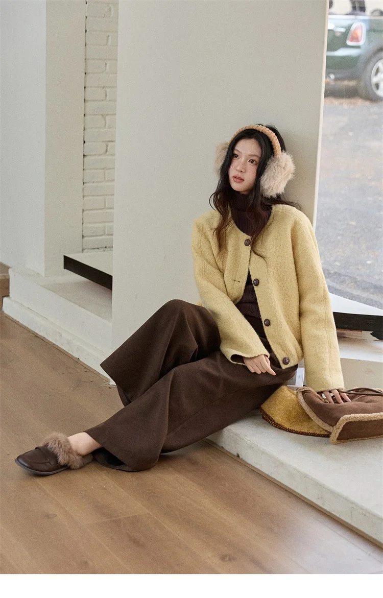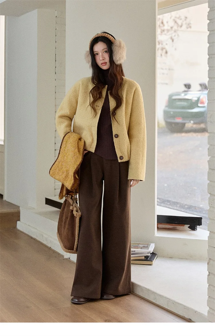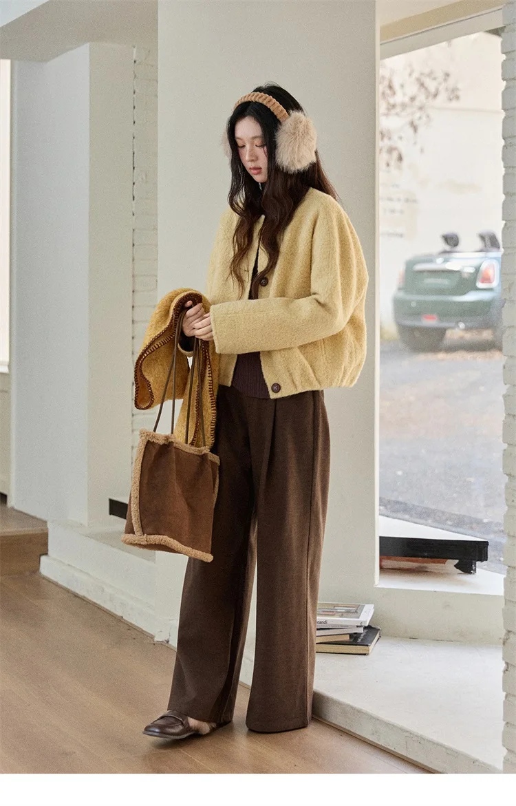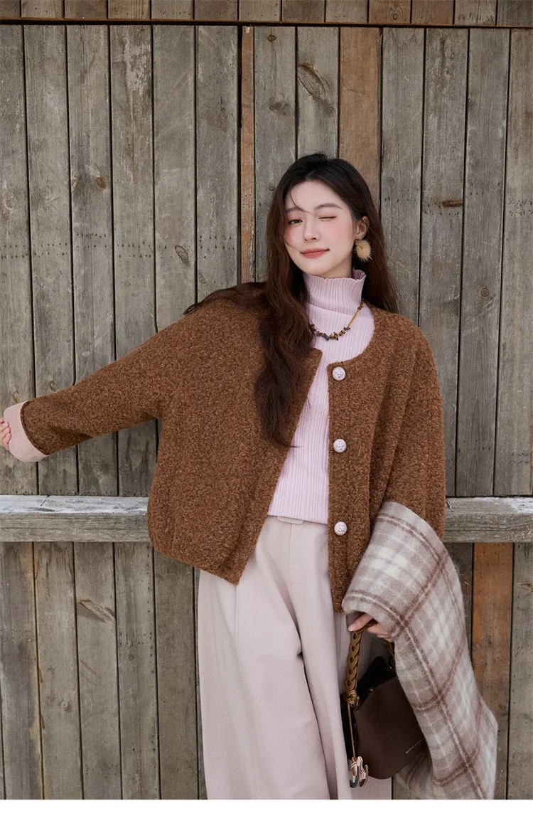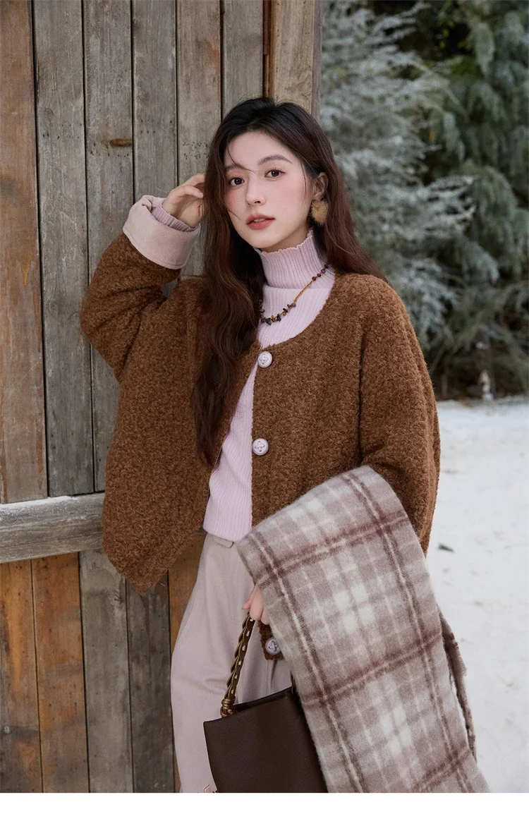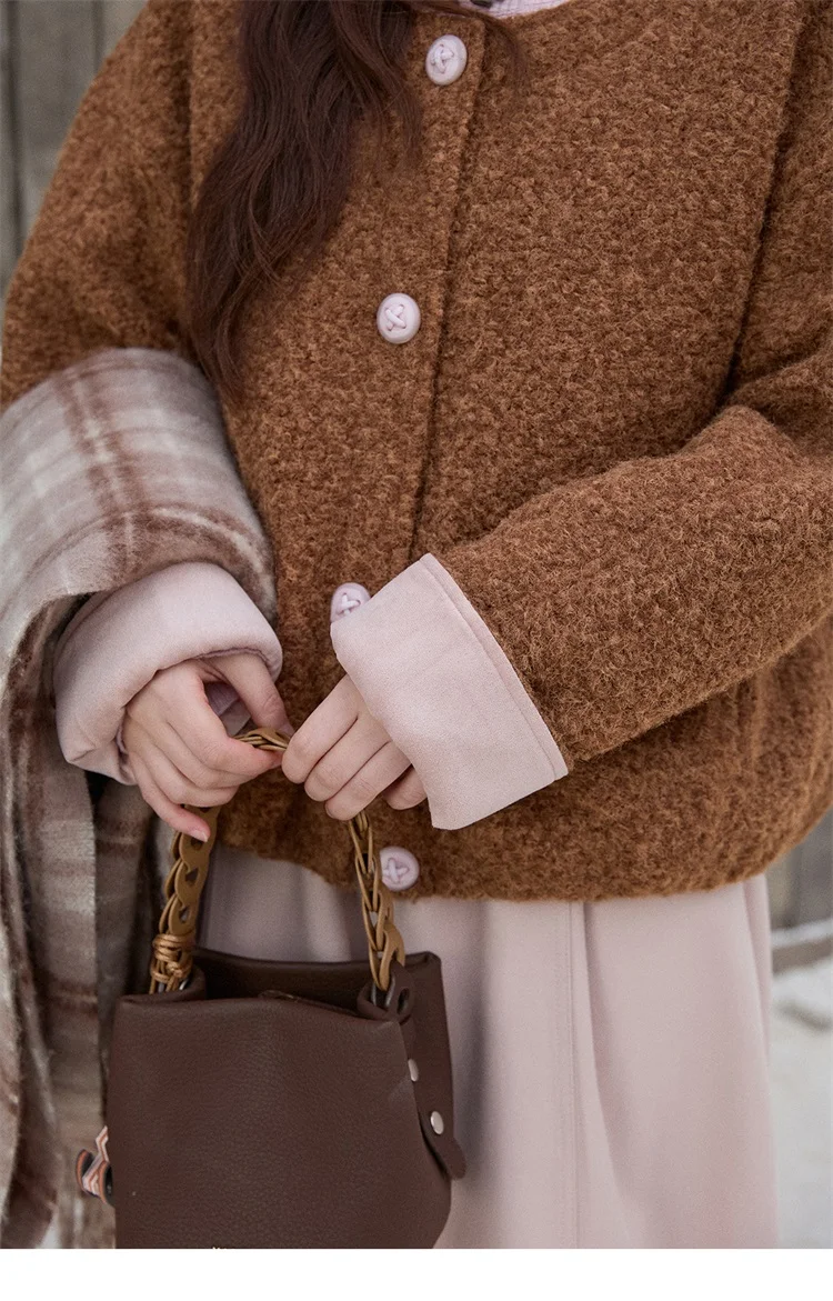 MISHOW Women's Brown Jacket 2025 Winter Retro Warm Round Neck Wool Quilted Coat Commute Short Loose Thick Coat Woman MXE87W0935