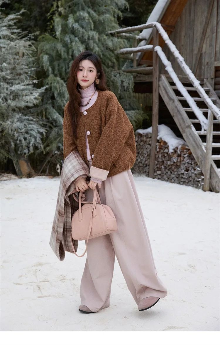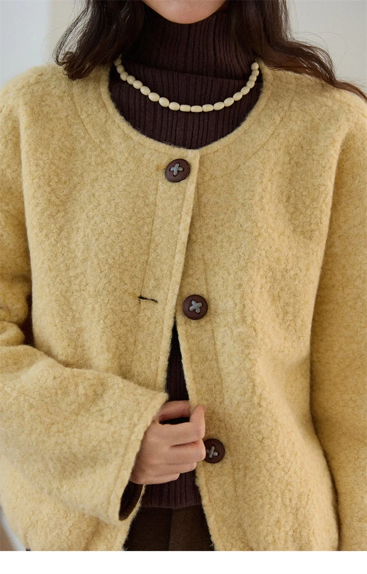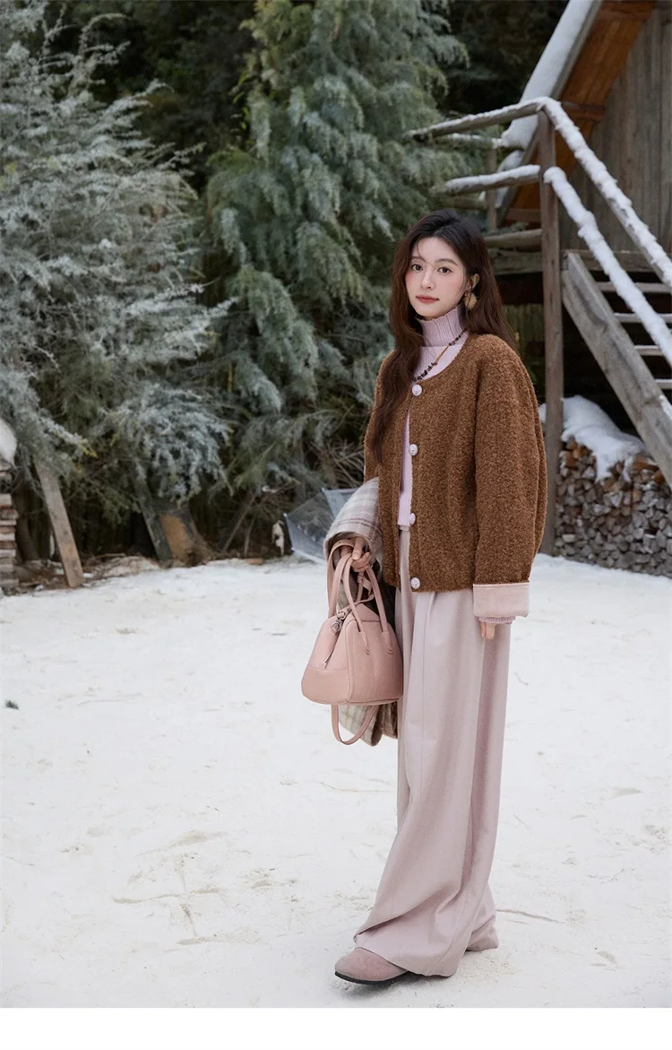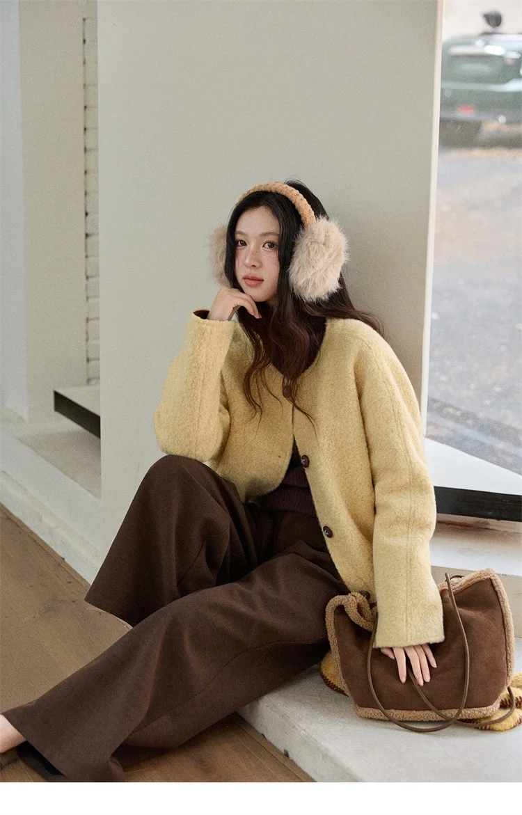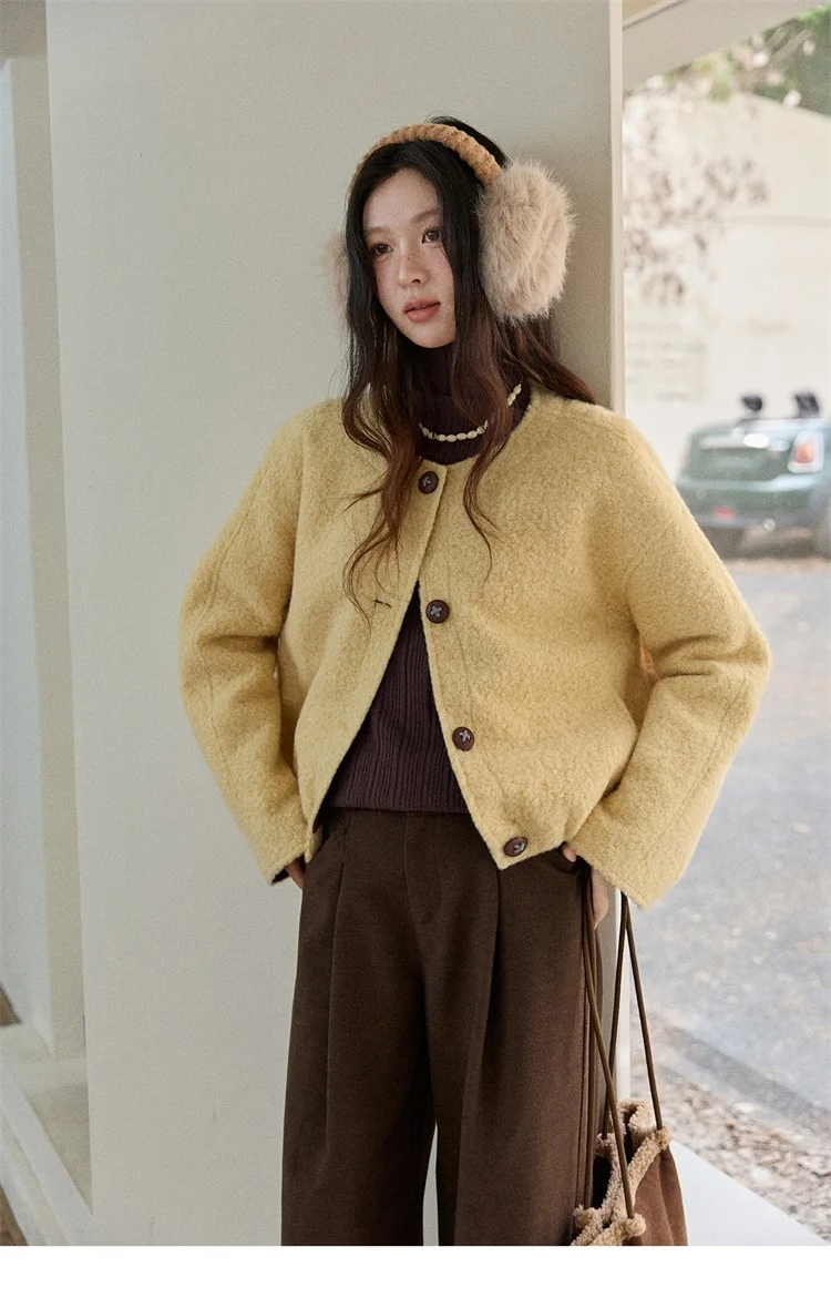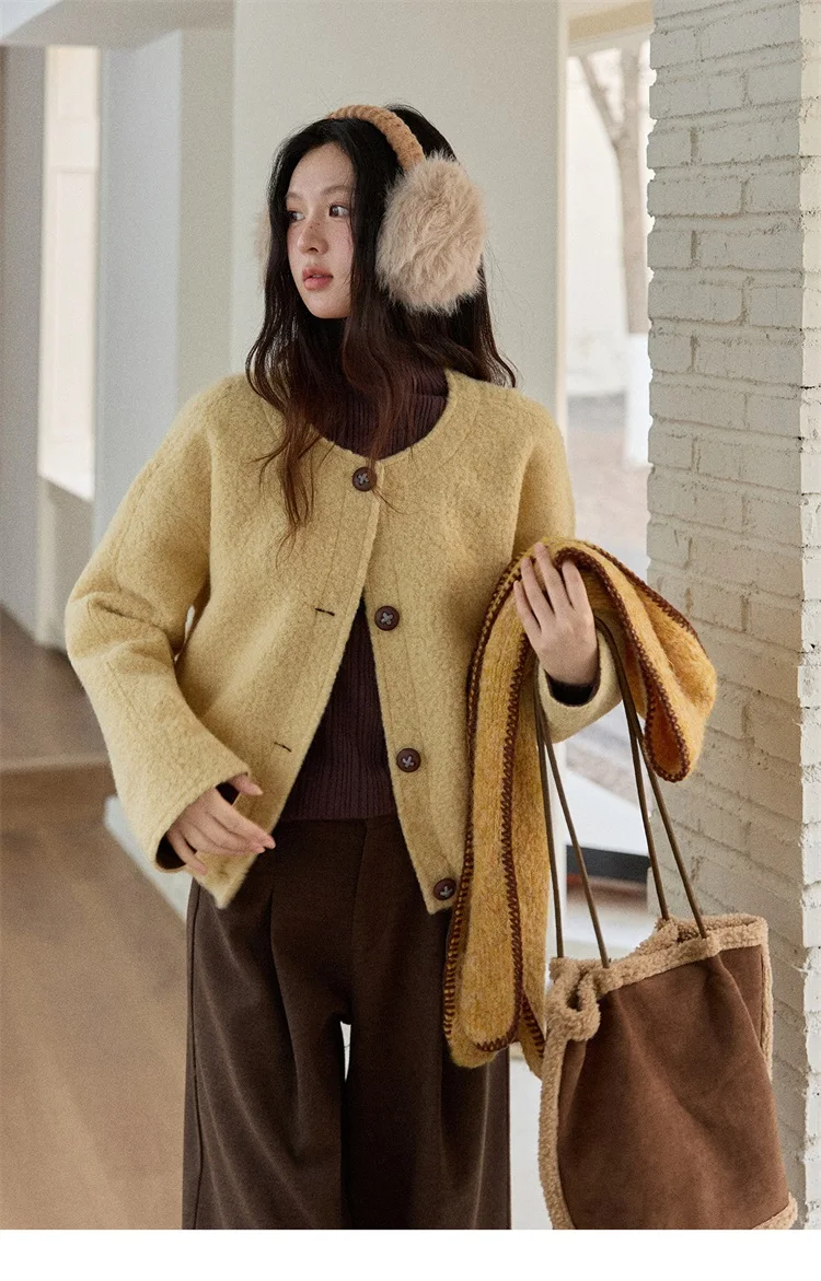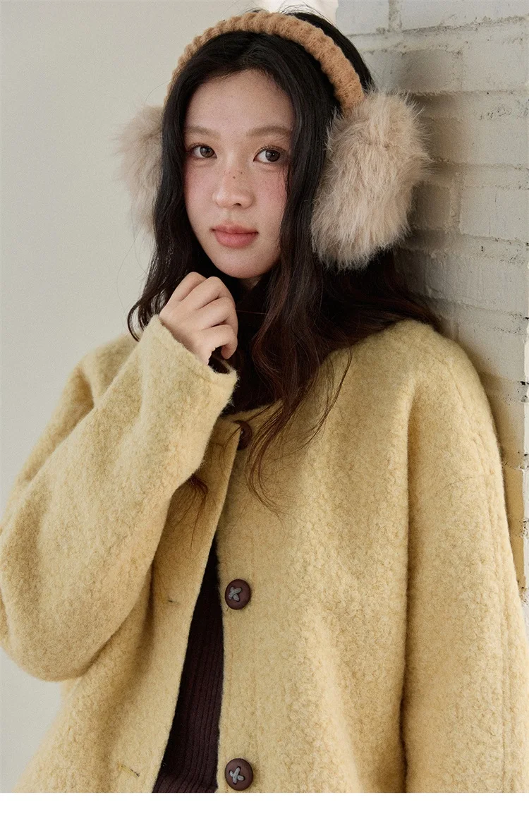 MISHOW Women's Brown Jacket 2025 Winter Retro Warm Round Neck Wool Quilted Coat Commute Short Loose Thick Coat Woman MXE87W0935