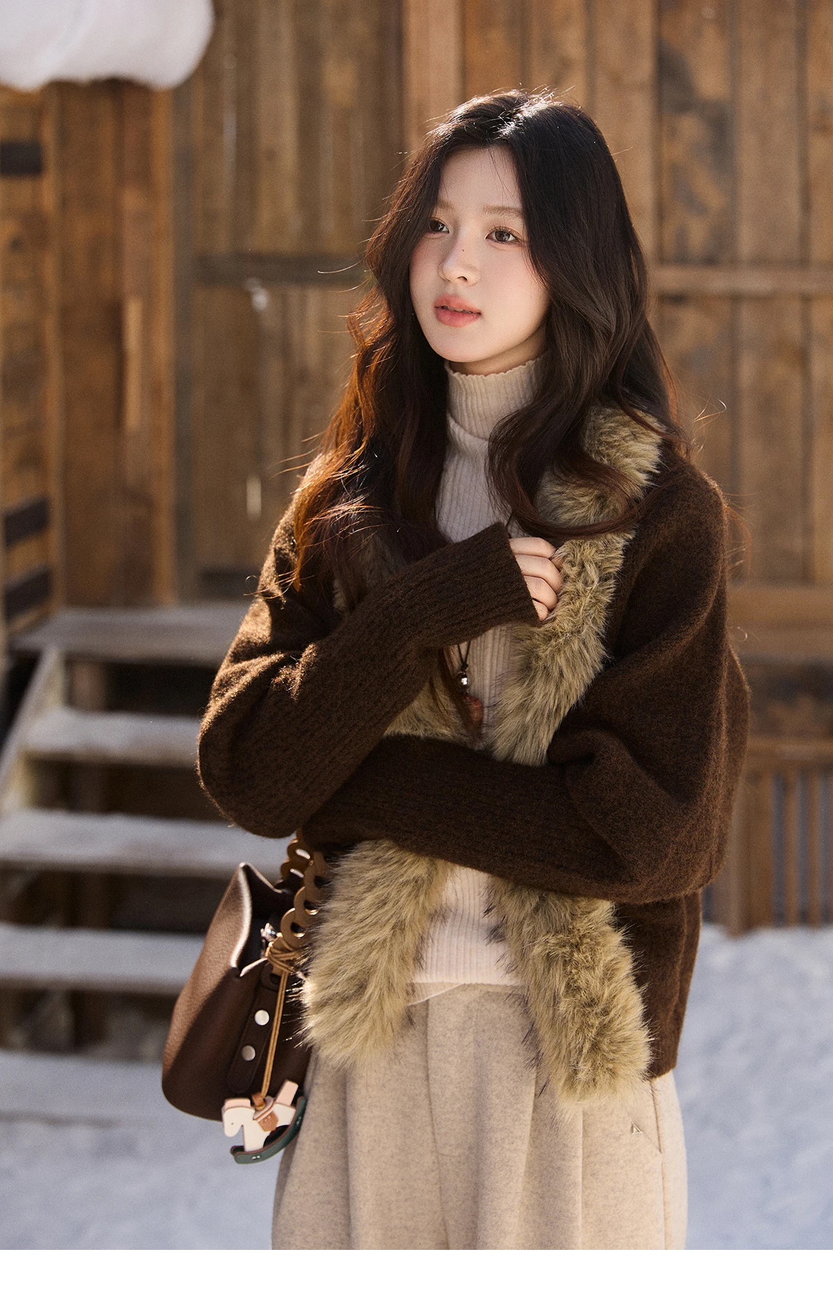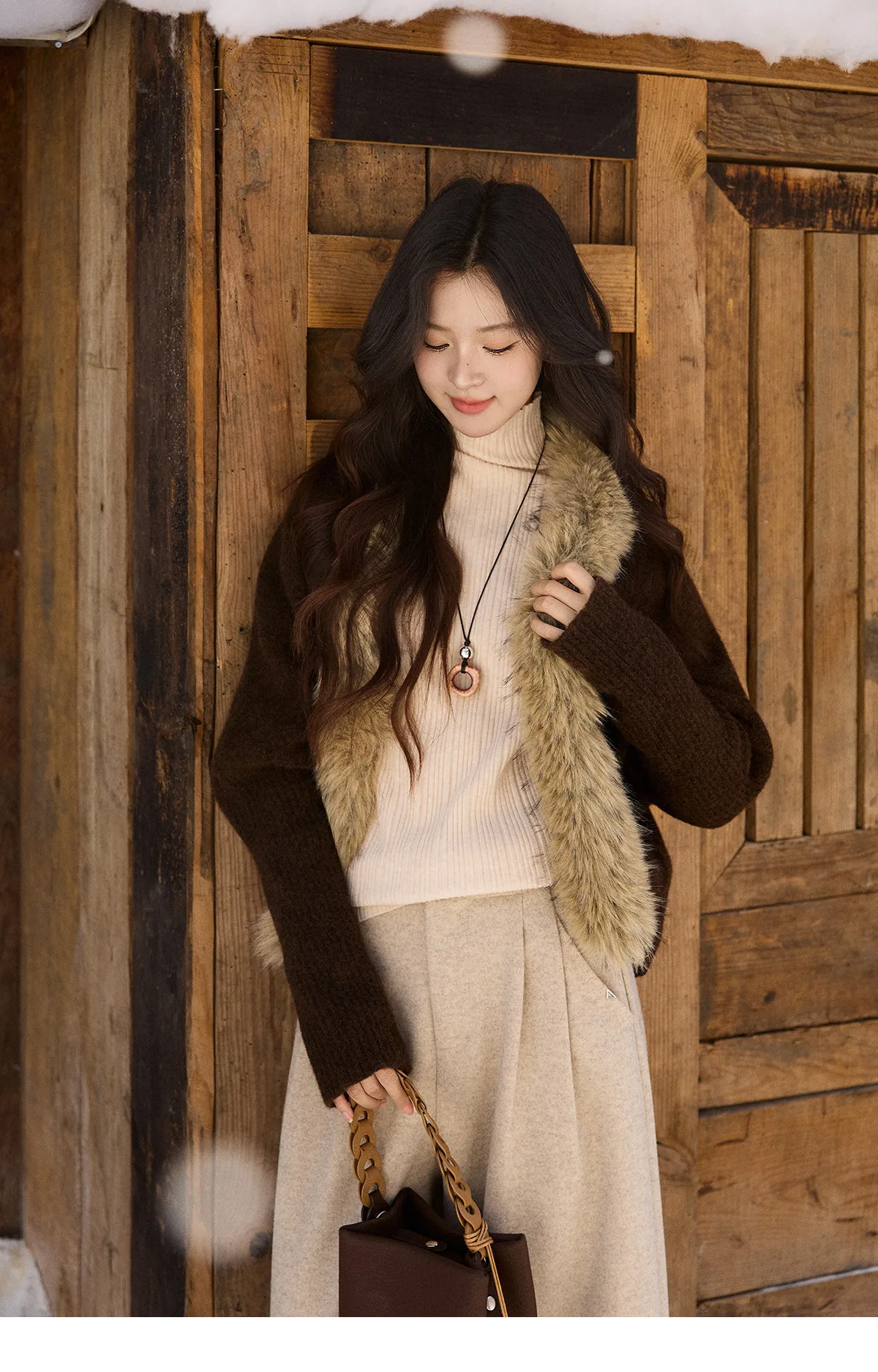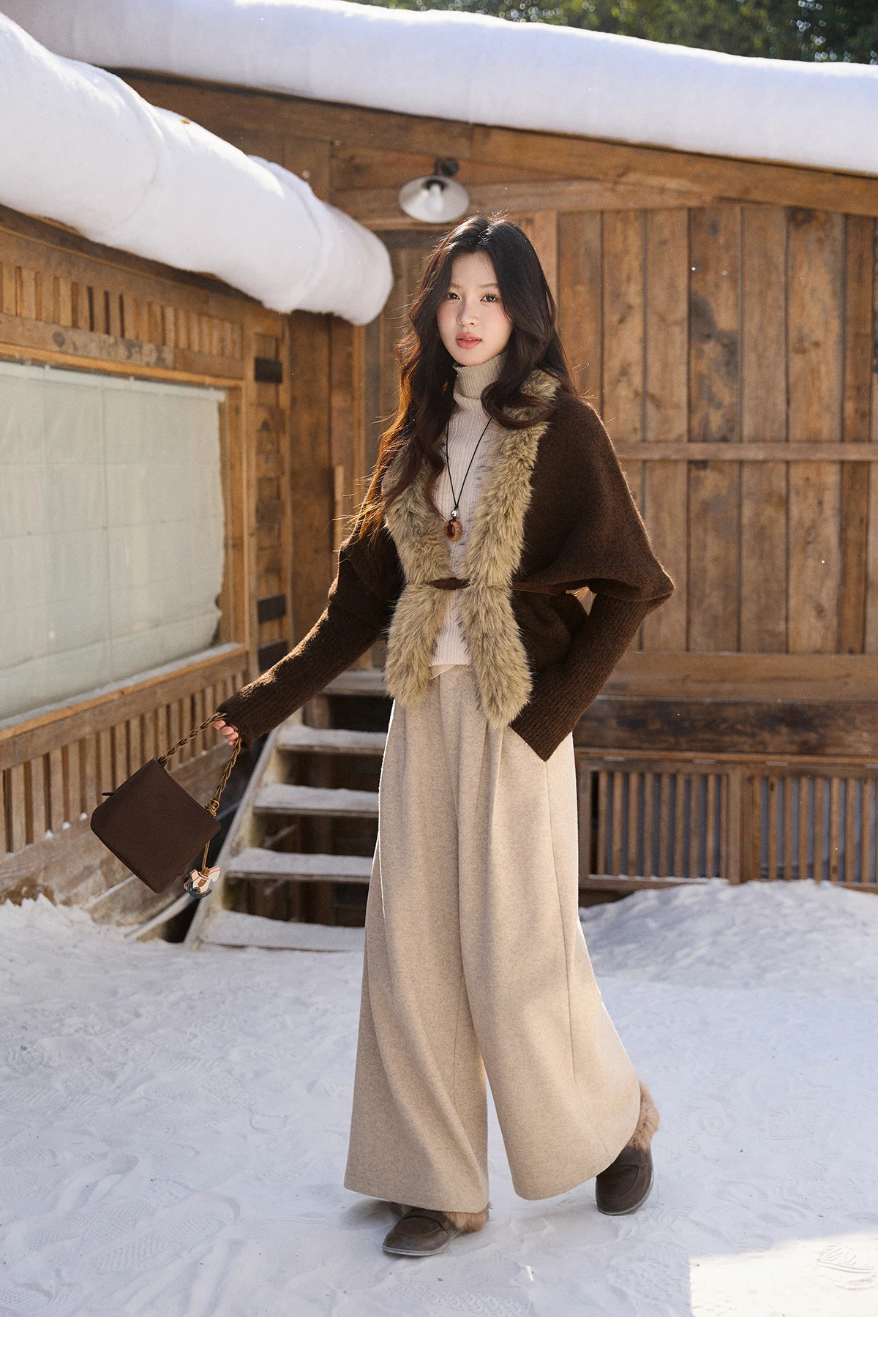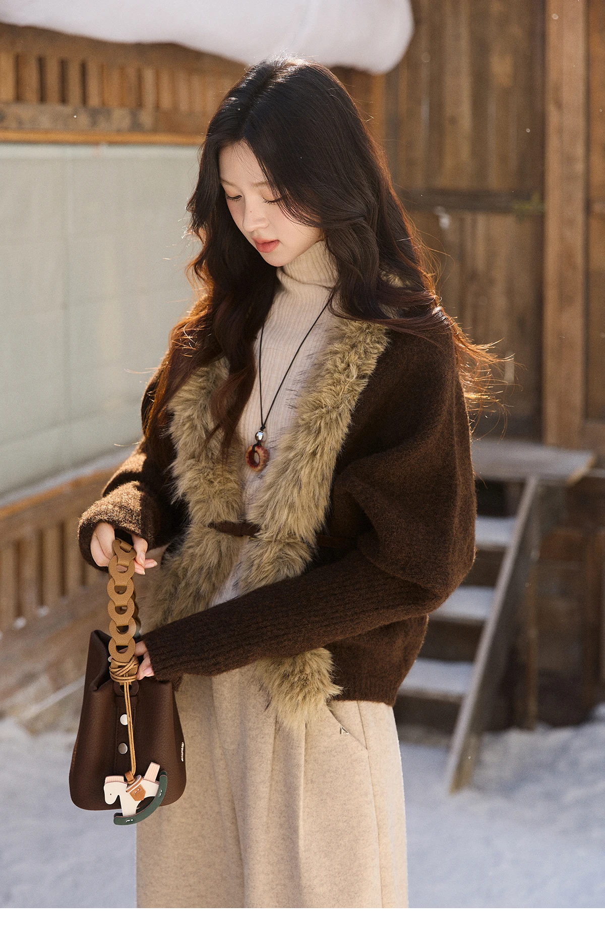 MISHOW Women's Brown Knitted Cardigan 2025 Winter Faux Fur Collar Batwing Sleeve Tops Warm Loose Outerwear Beltless MXE94Z2954