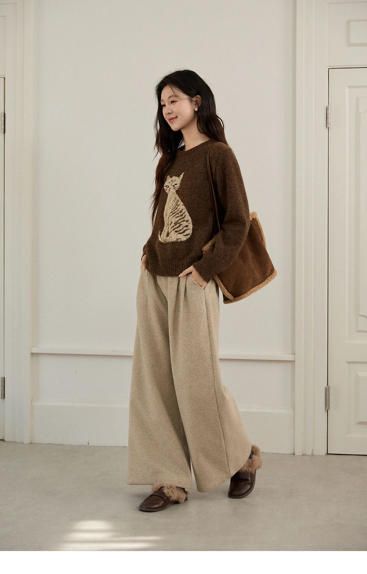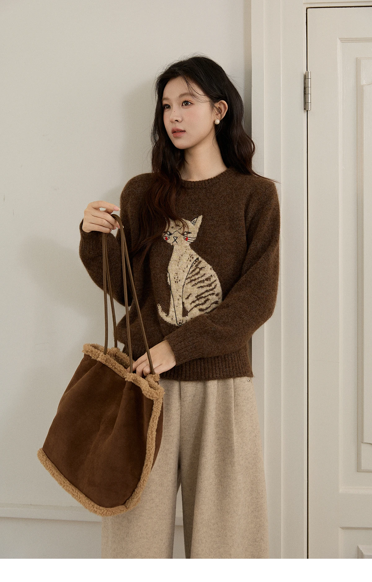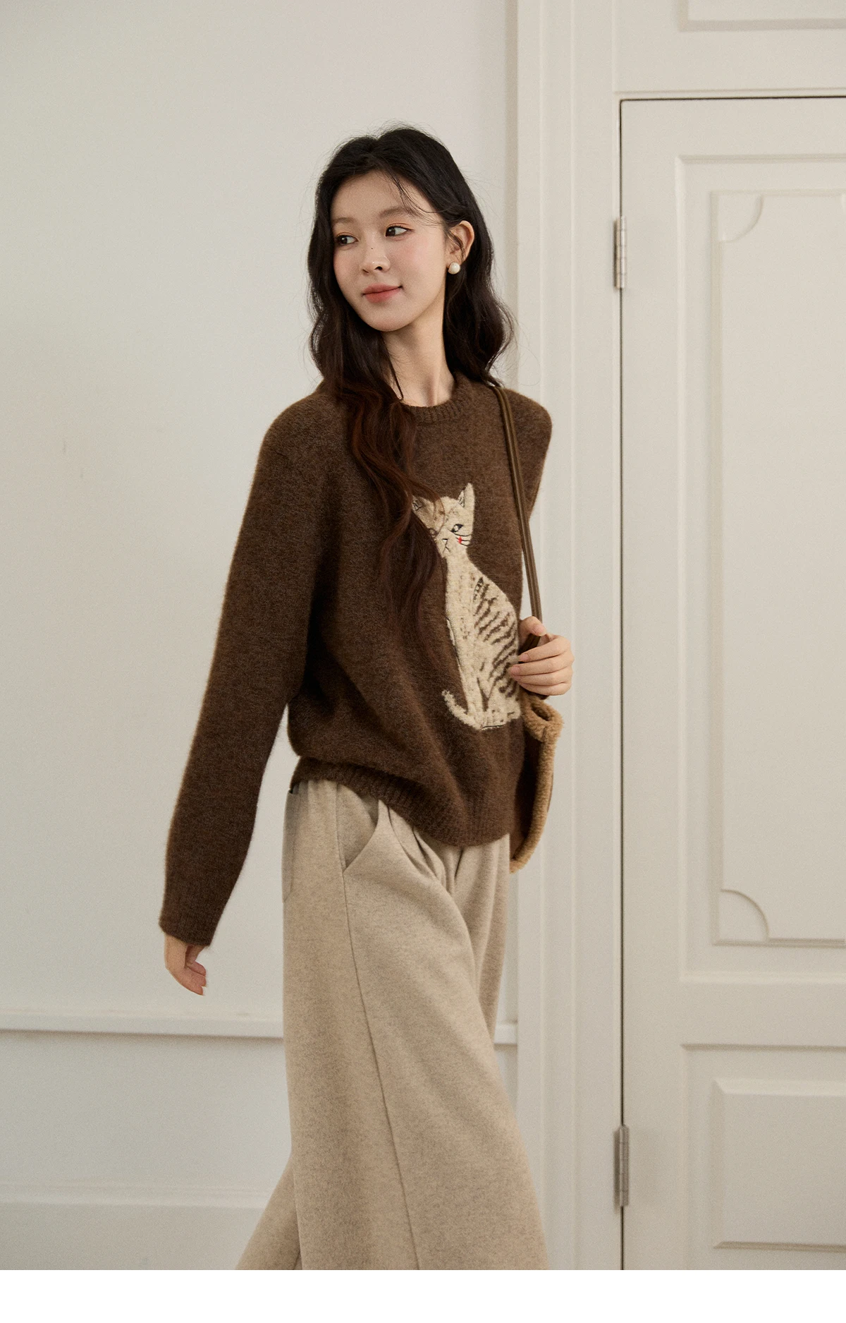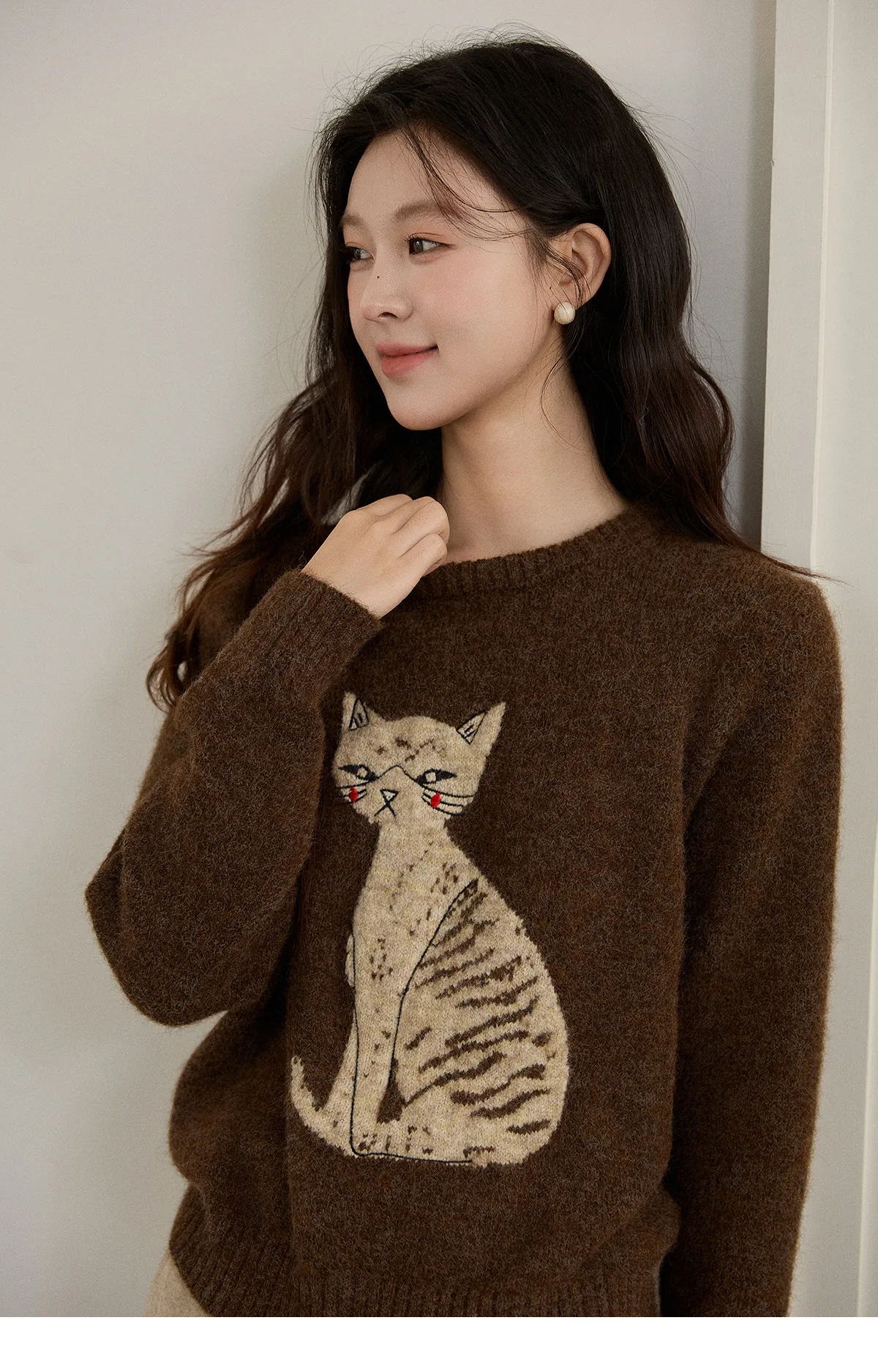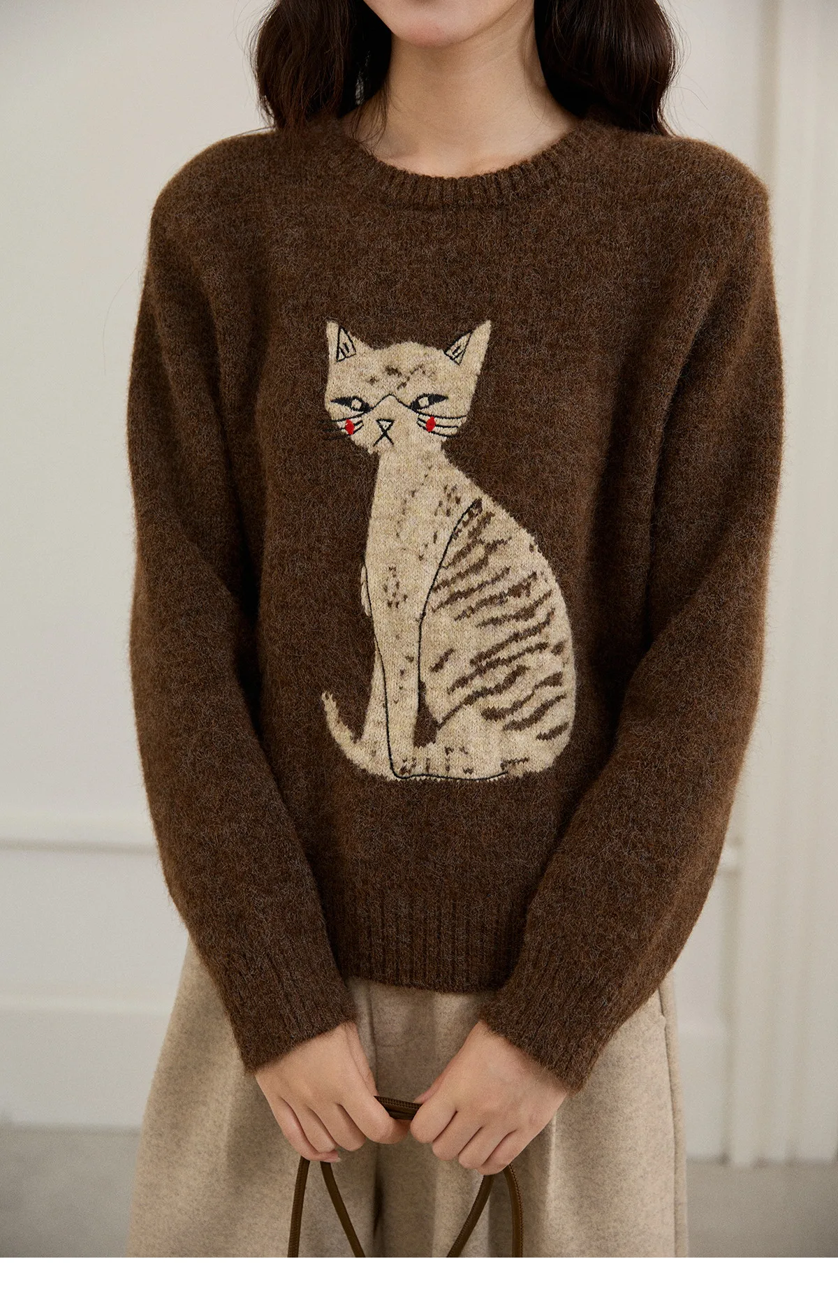 MISHOW Women's Brown Knitted Sweater 2025 Autumn Winter Cat Pattern Jacquard Crew Neck Sweaters Loose Pullover Tops MXE94Z2991