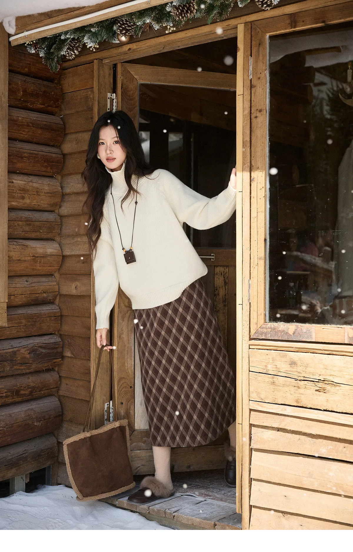 MISHOW Women's Brown Plaid Wool Blend Skirt 2025 Winter High Waist Slim A-Line Back Hem Split Back Elastic Midi Skirt MXE94B2461