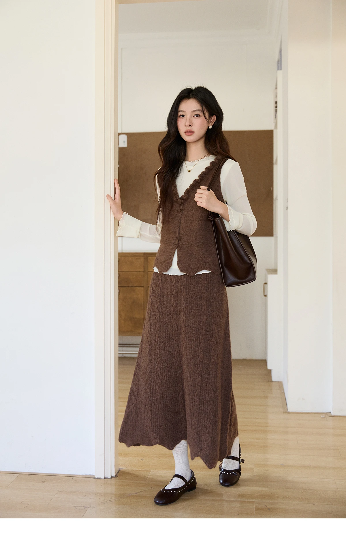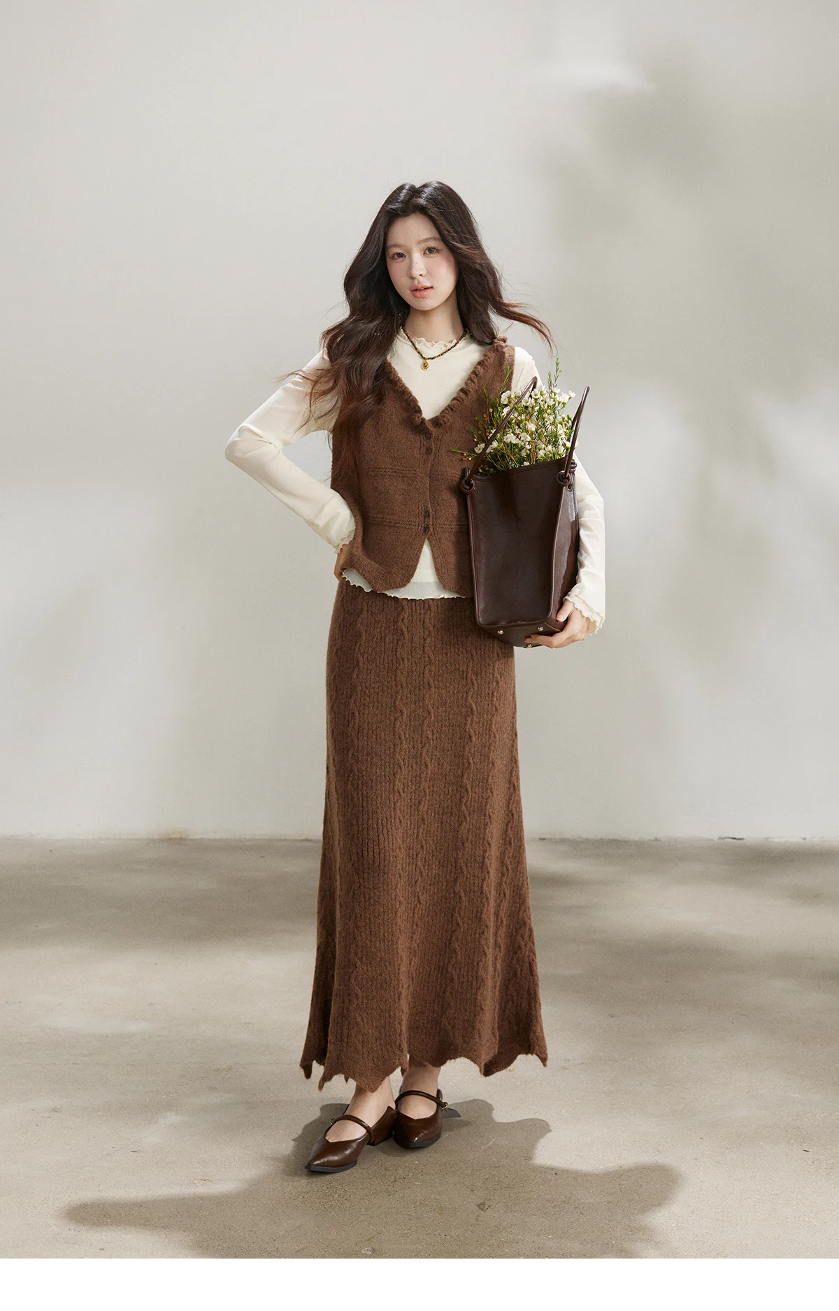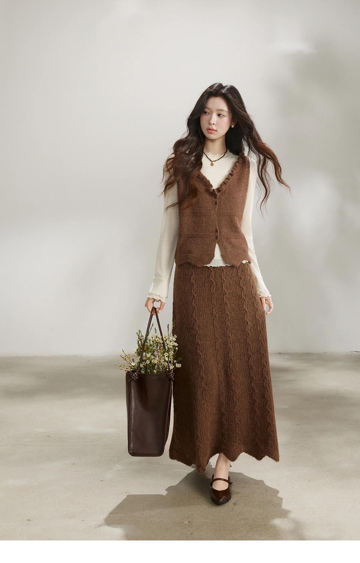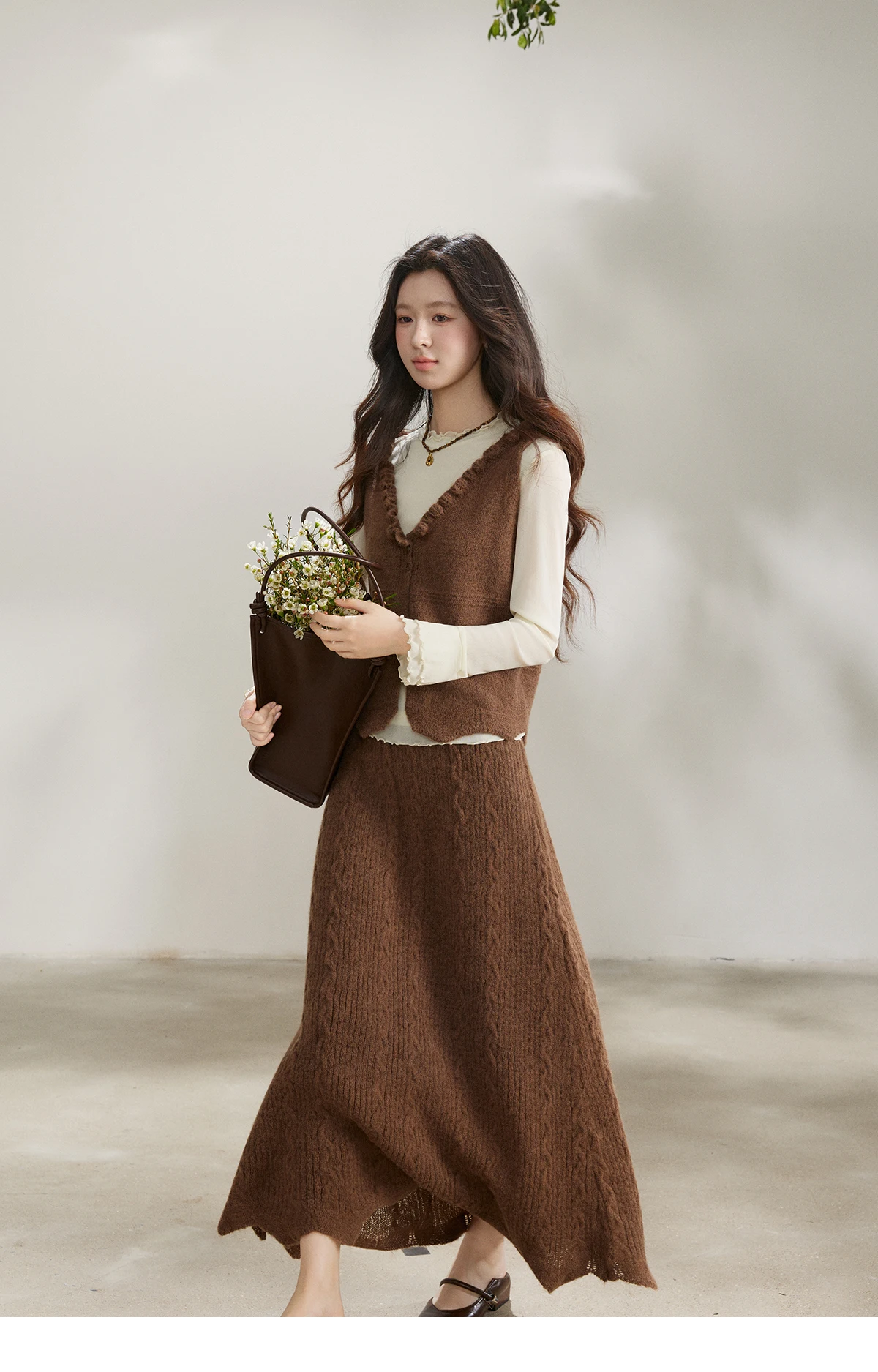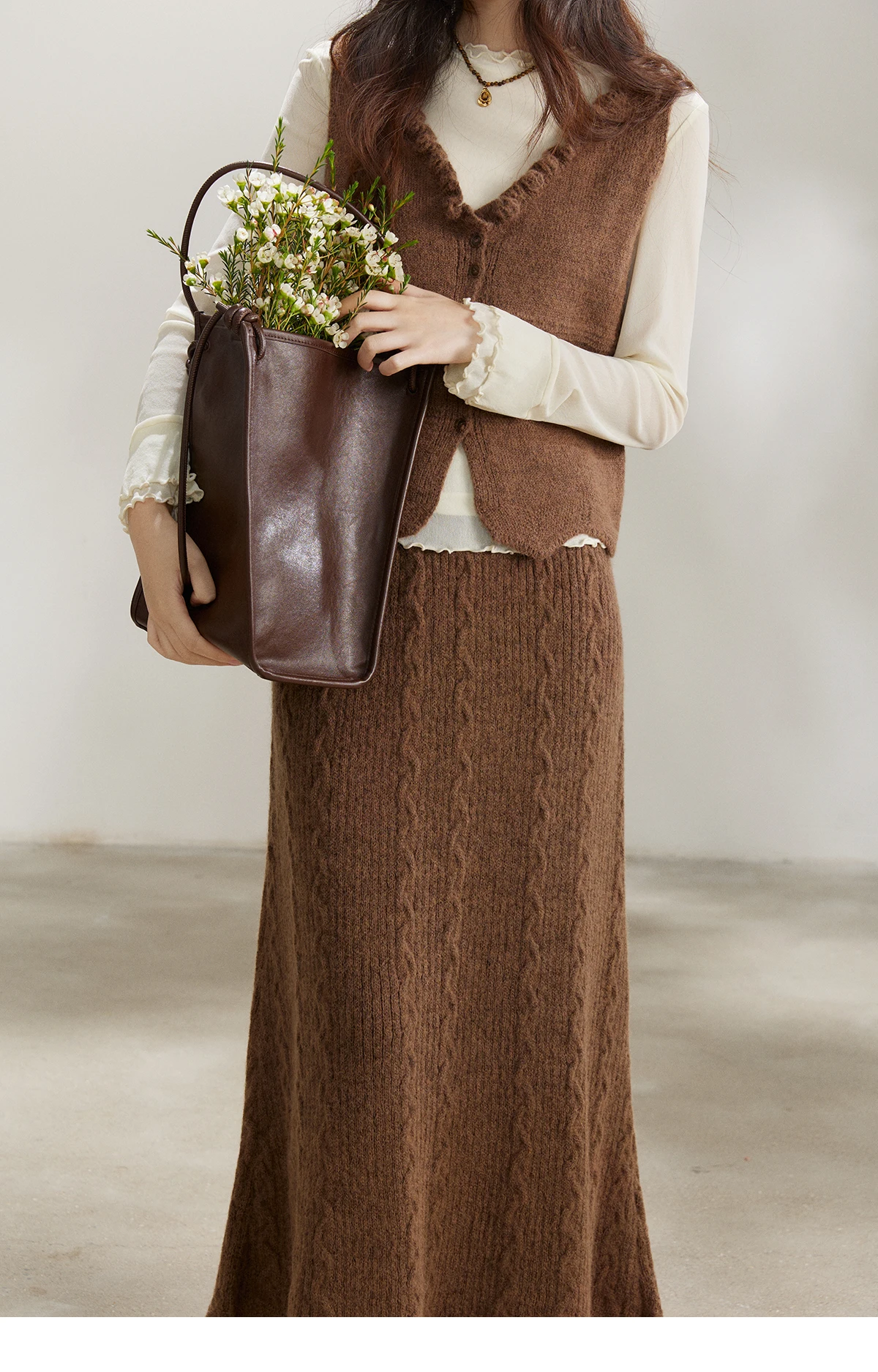 MISHOW Women's Brown Two-Piece Set 2026 Spring Knitted Vest V-Neck Cable Knit Maxi Skirt Casual Retro Warm Outfit MXF11T1460