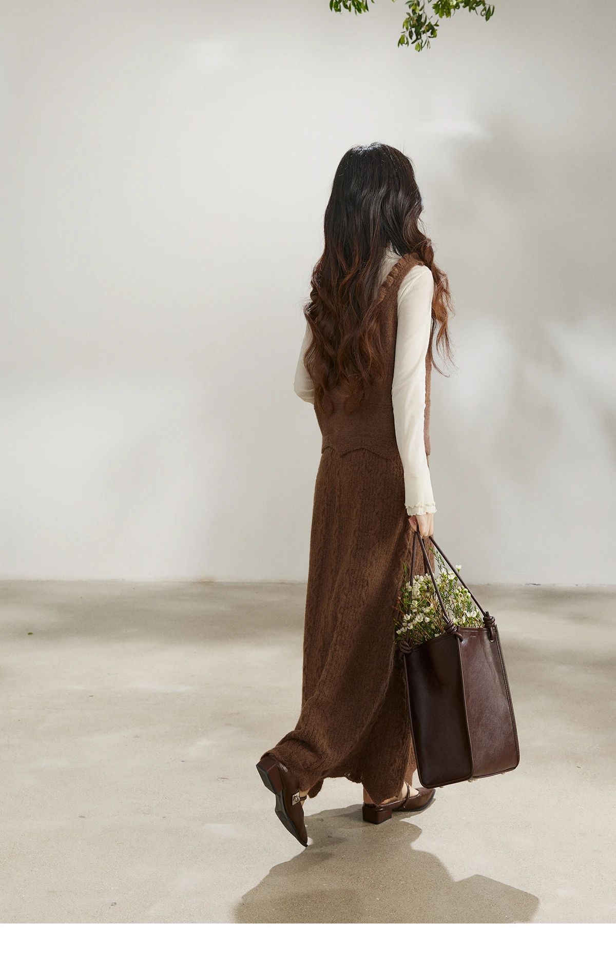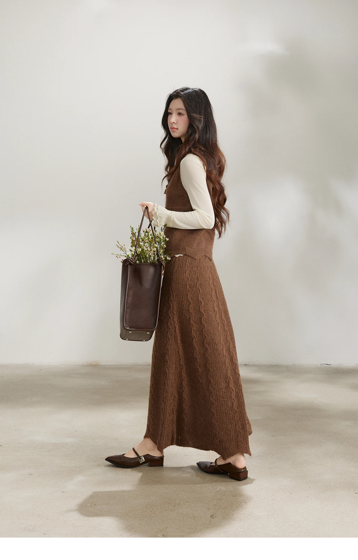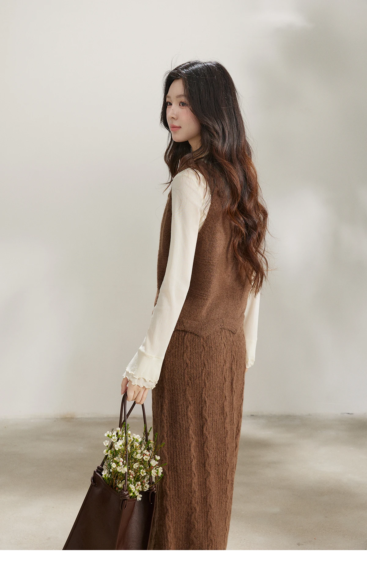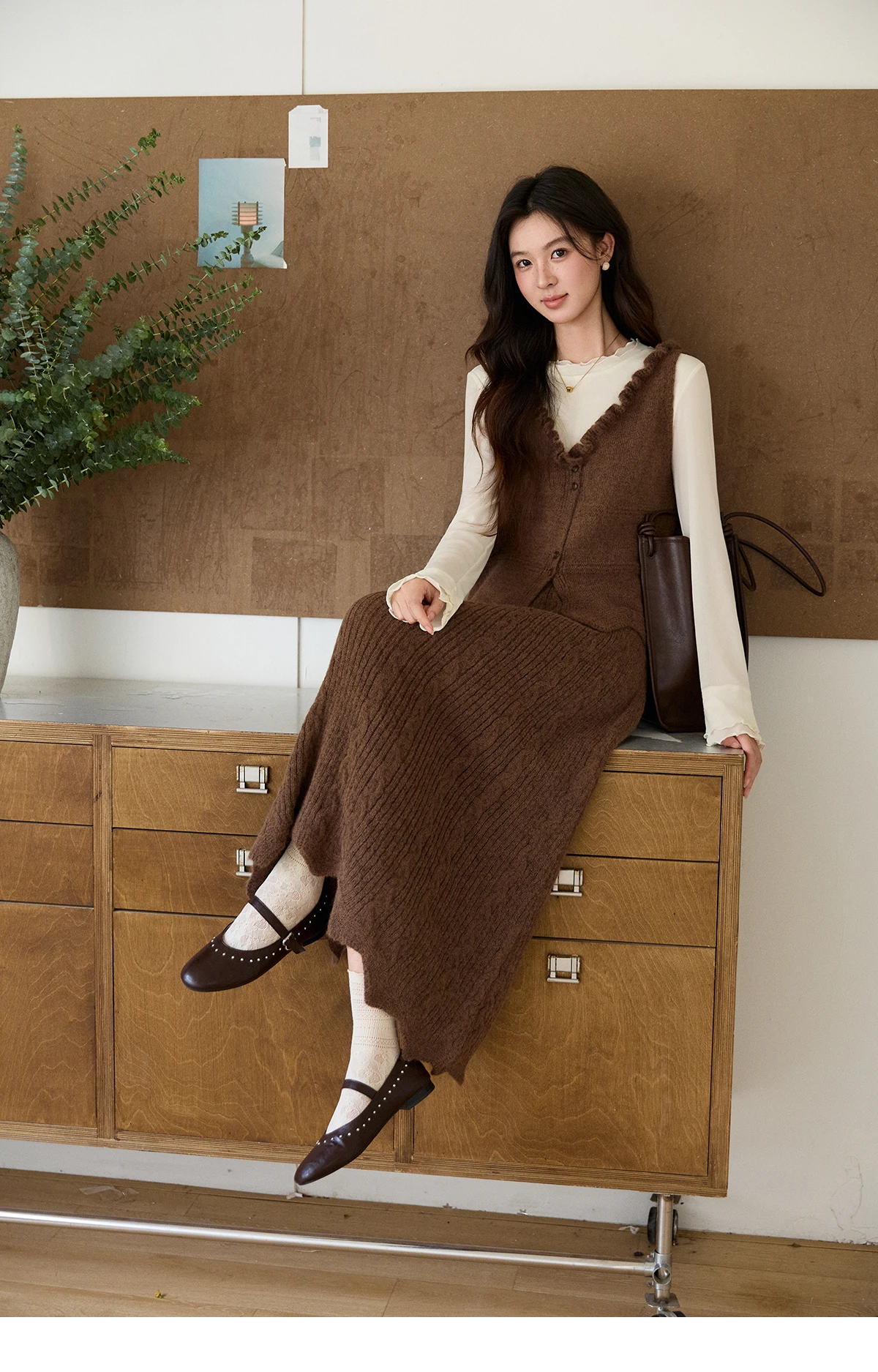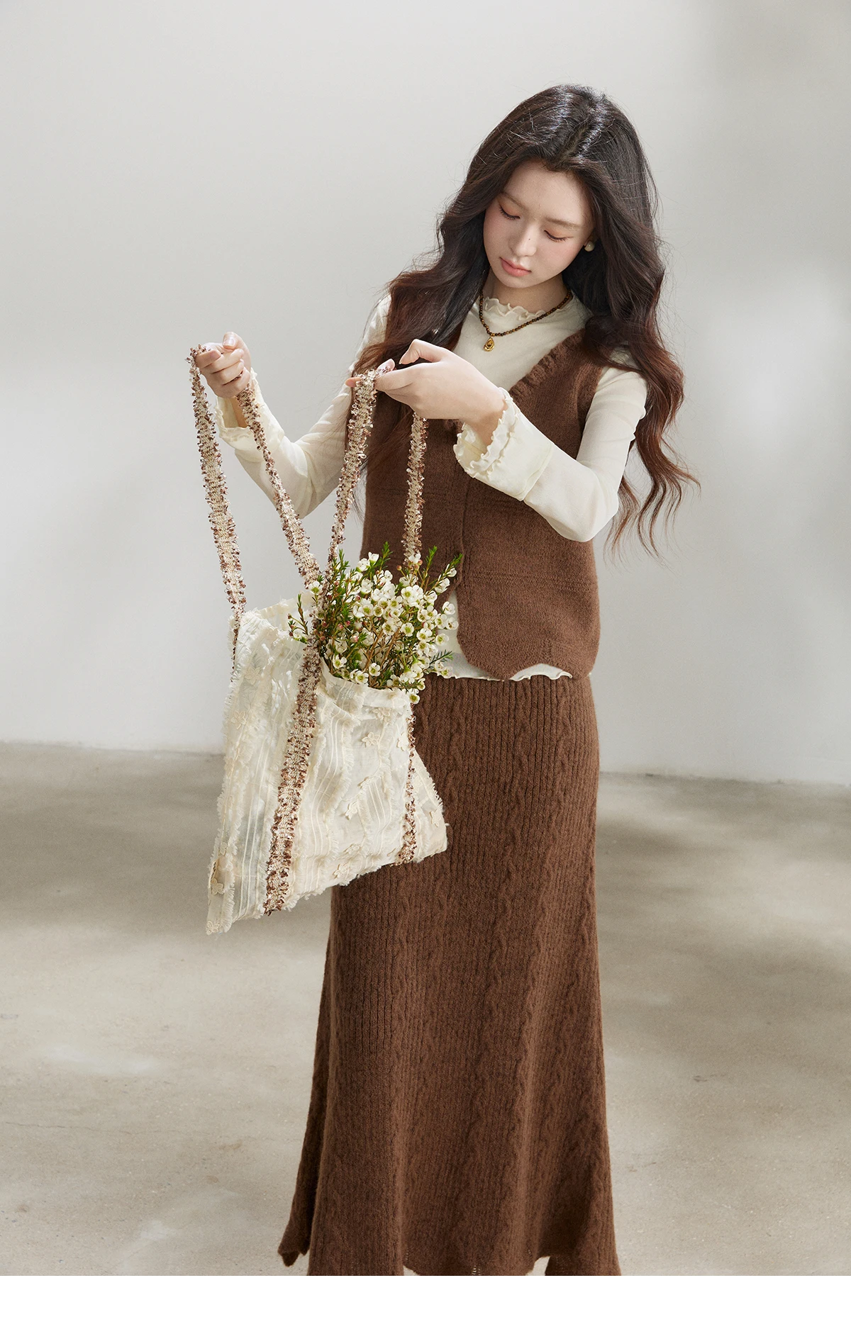 MISHOW Women's Brown Two-Piece Set 2026 Spring Knitted Vest V-Neck Cable Knit Maxi Skirt Casual Retro Warm Outfit MXF11T1460