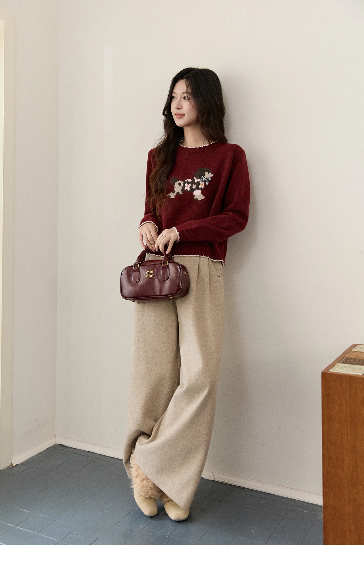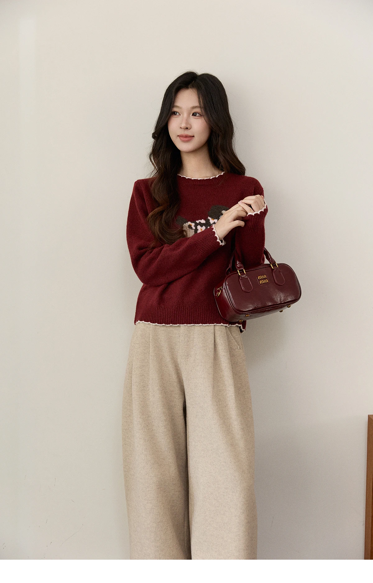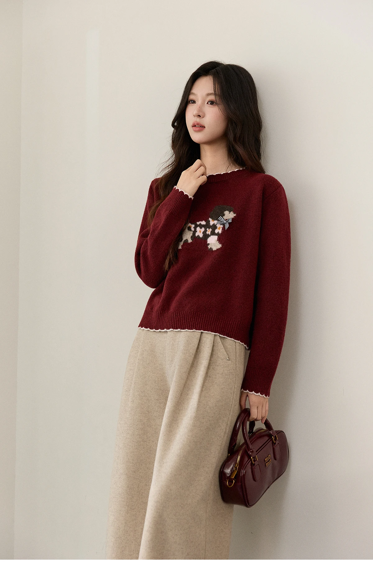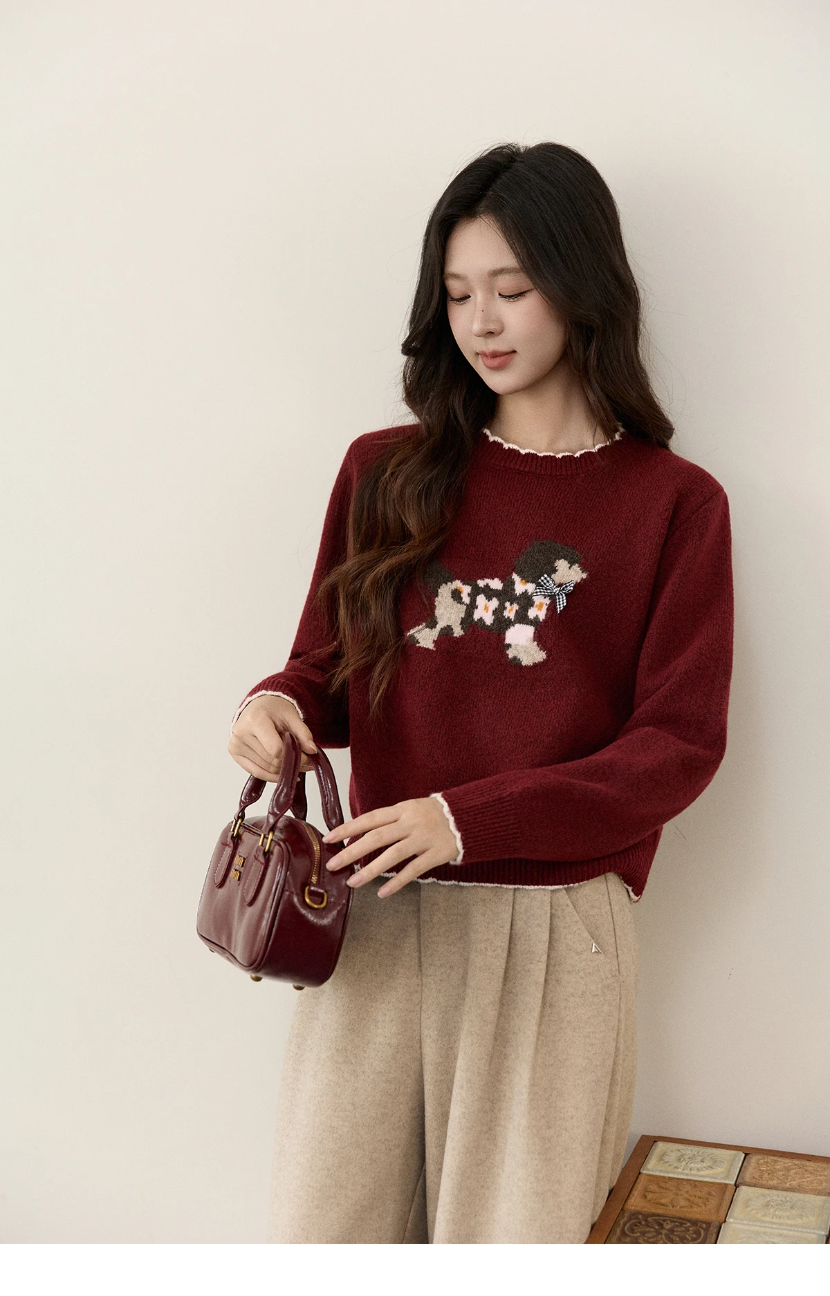 MISHOW Women's Burgundy Knitted Sweater 2025 Winter Poodle Pattern Ruffled Trim Crew Neck Sweater Warm Pullover Tops MXE93Z2949