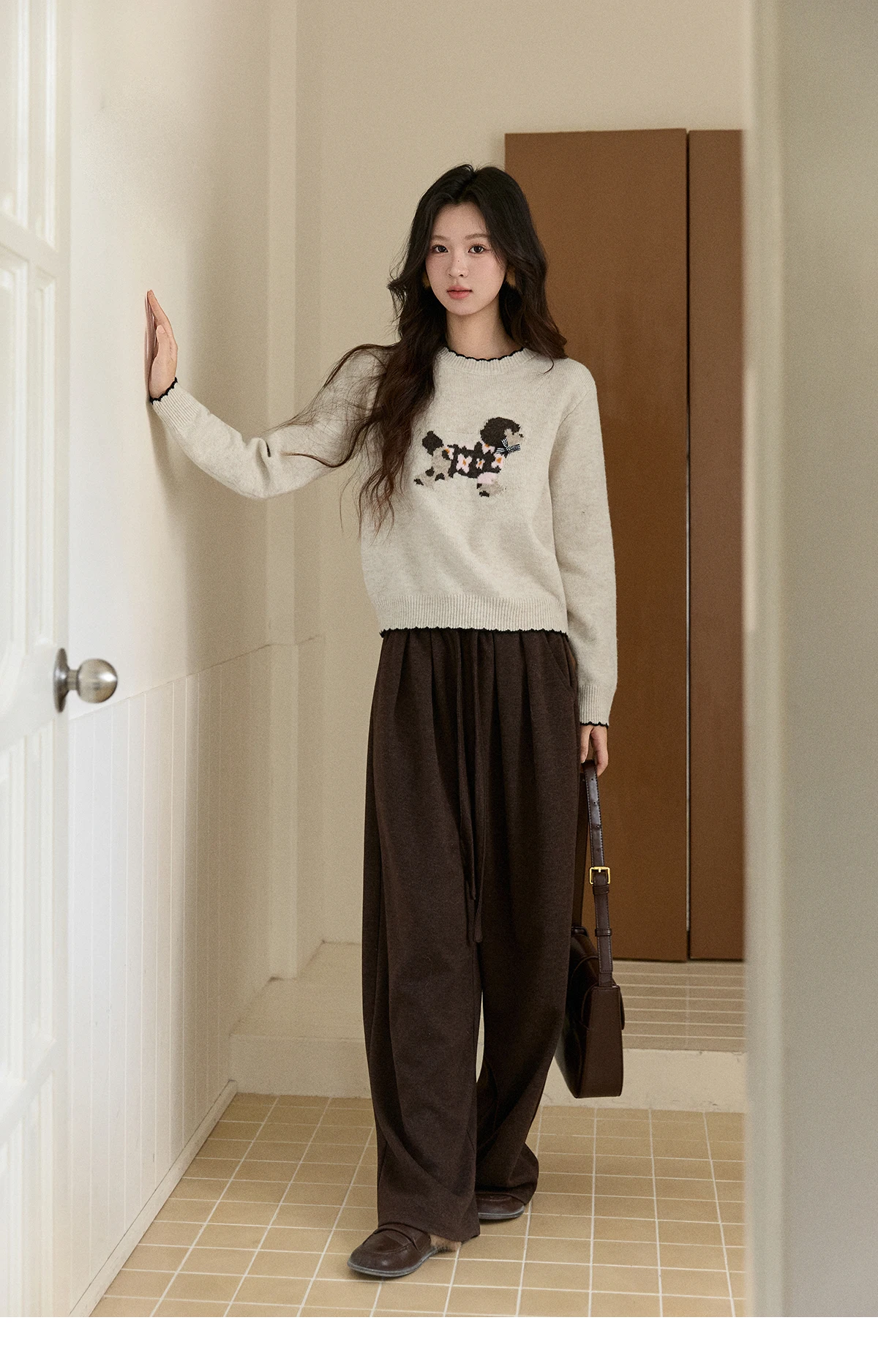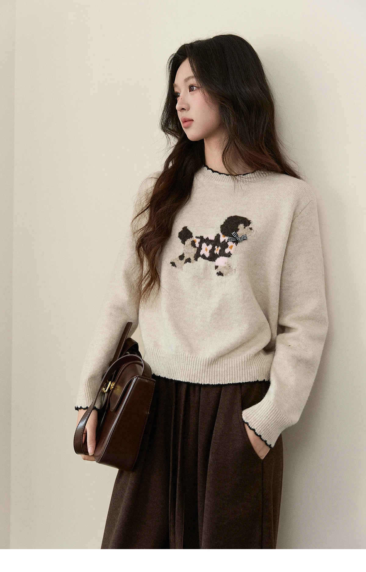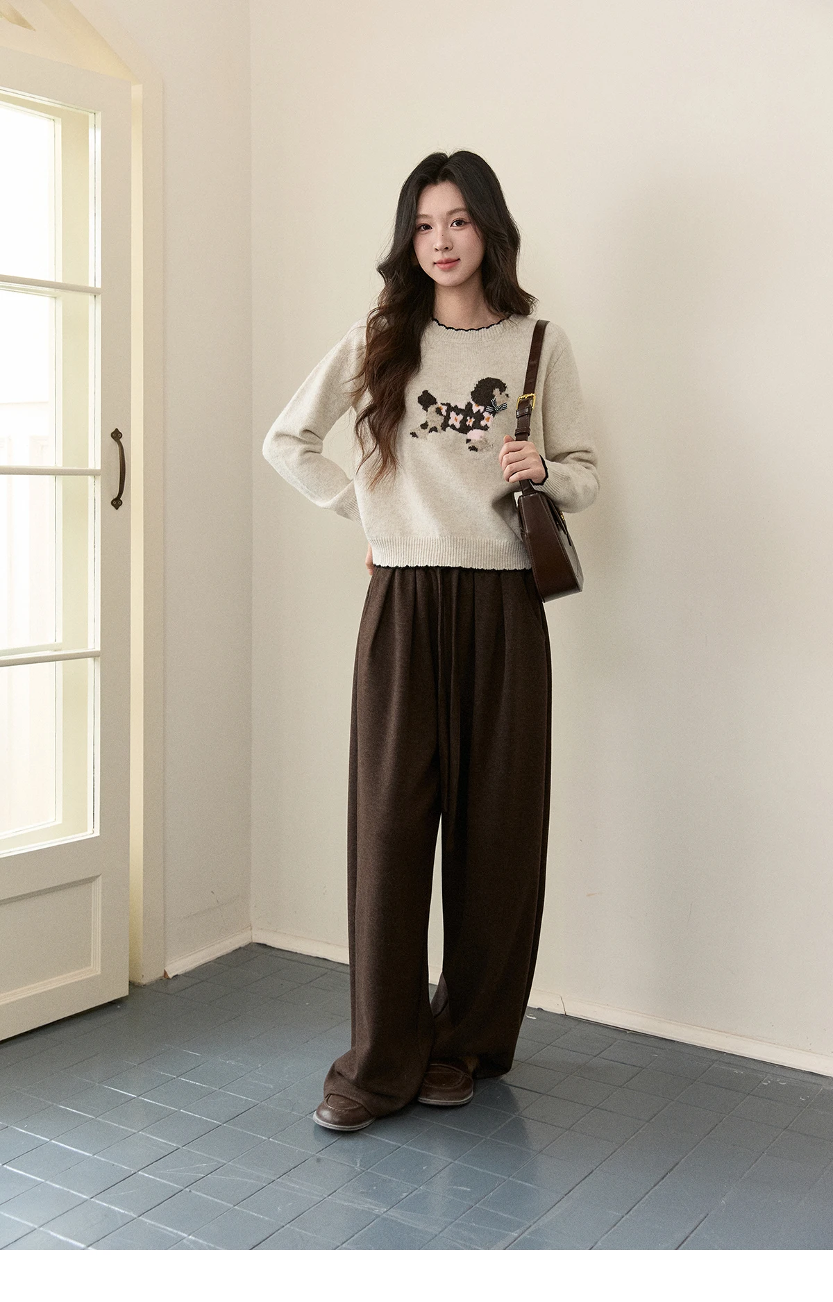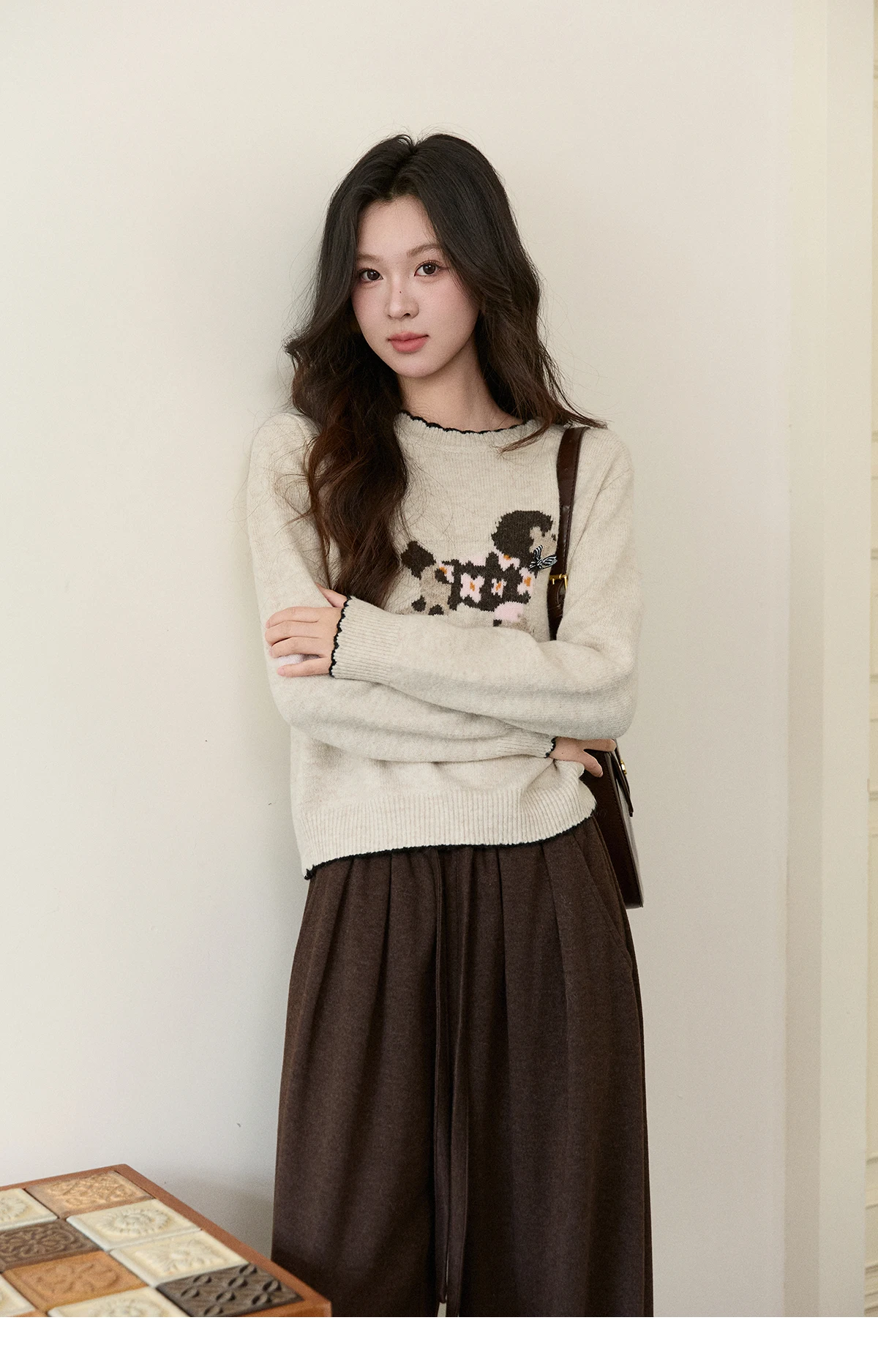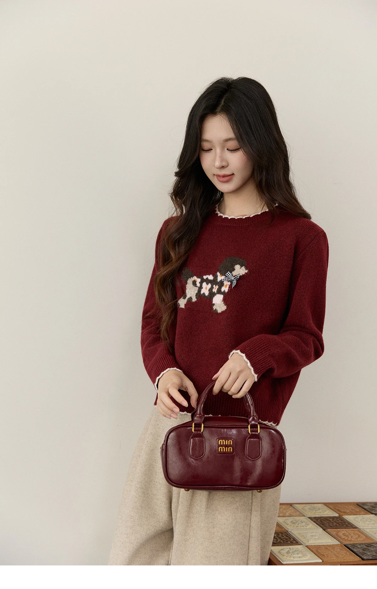 MISHOW Women's Burgundy Knitted Sweater 2025 Winter Poodle Pattern Ruffled Trim Crew Neck Sweater Warm Pullover Tops MXE93Z2949