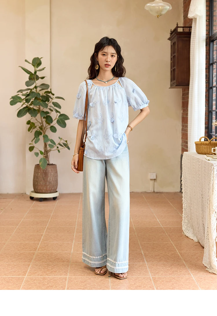 MISHOW Women's Butterfly Embroidery Blouse 2025 Summer New Fashion Hollow Out O-Neck Casual Top Female Clothing MXE36X1878