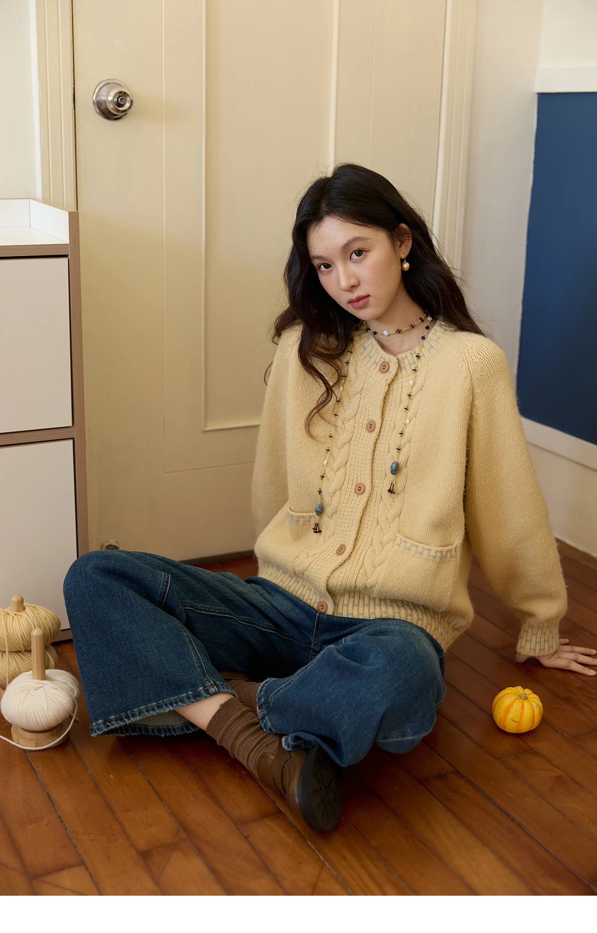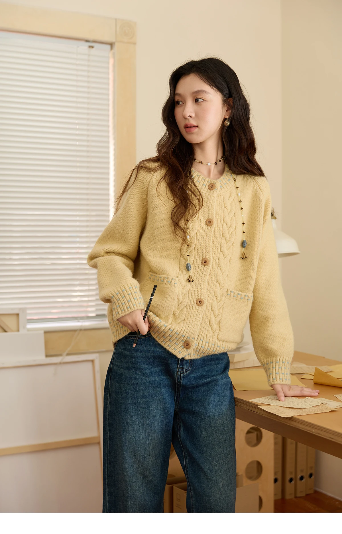 MISHOW Women's Cardigan 2025 Autumn Winter Yellow Cable Knit Cardigan Hand-Drawstring Design Commuter Short Jacket MXE47Z2566