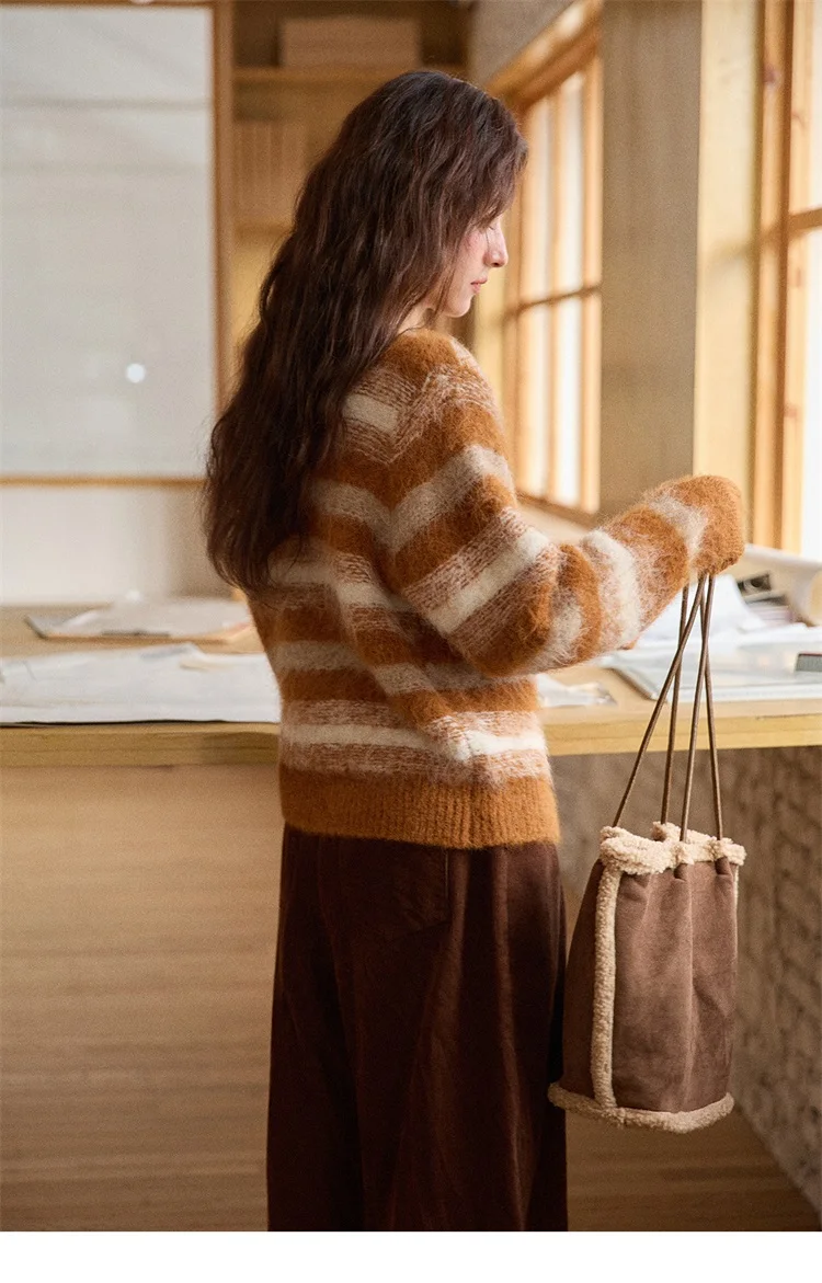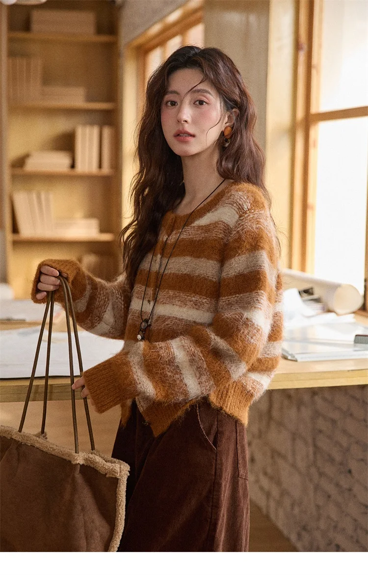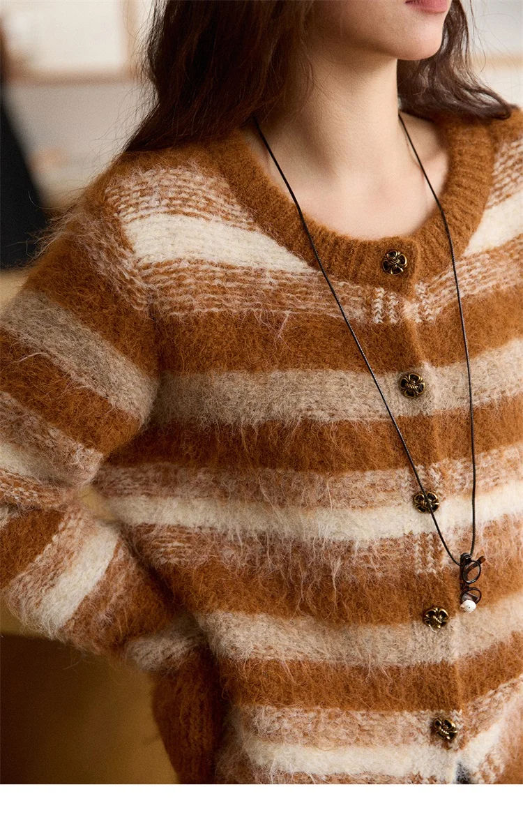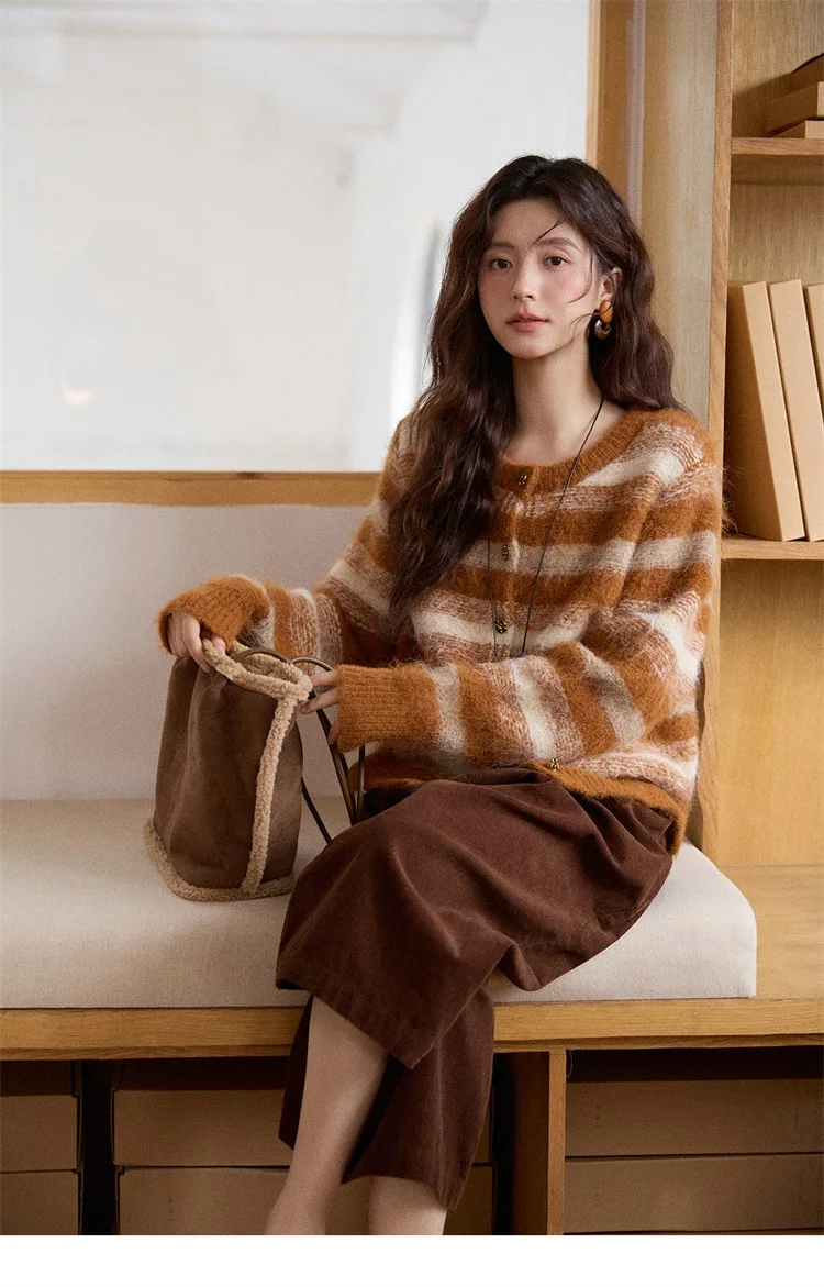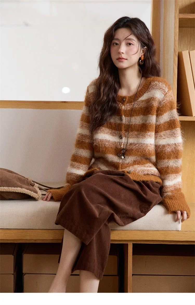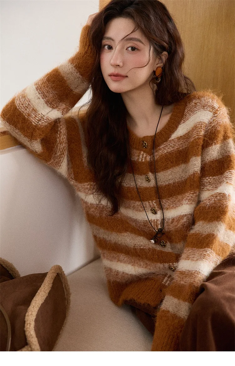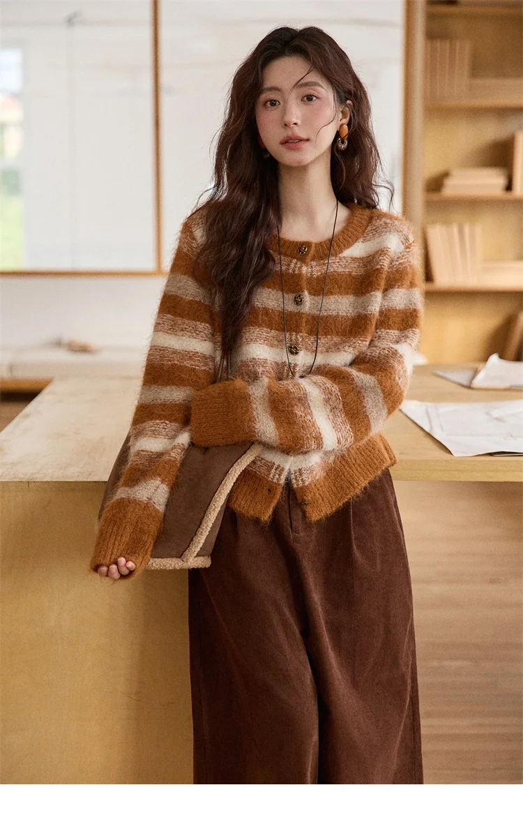 MISHOW Women's Cardigan Wool 2025 Winter Retro Striped Round Neck Long Sleeved Knitted Top Warm Comfortable Cardigan MXE87Z2723