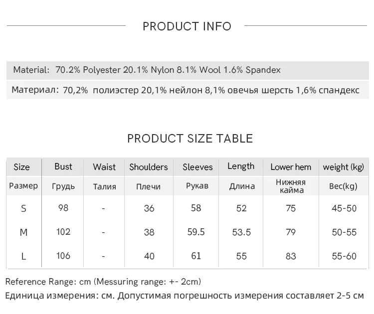 Material Composition: 70.2% polyester fiber 20.1% nylon 8.1% sheep wool 1.6% spandex