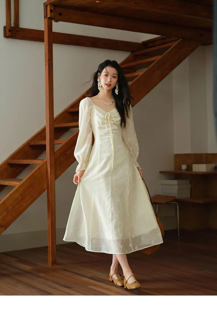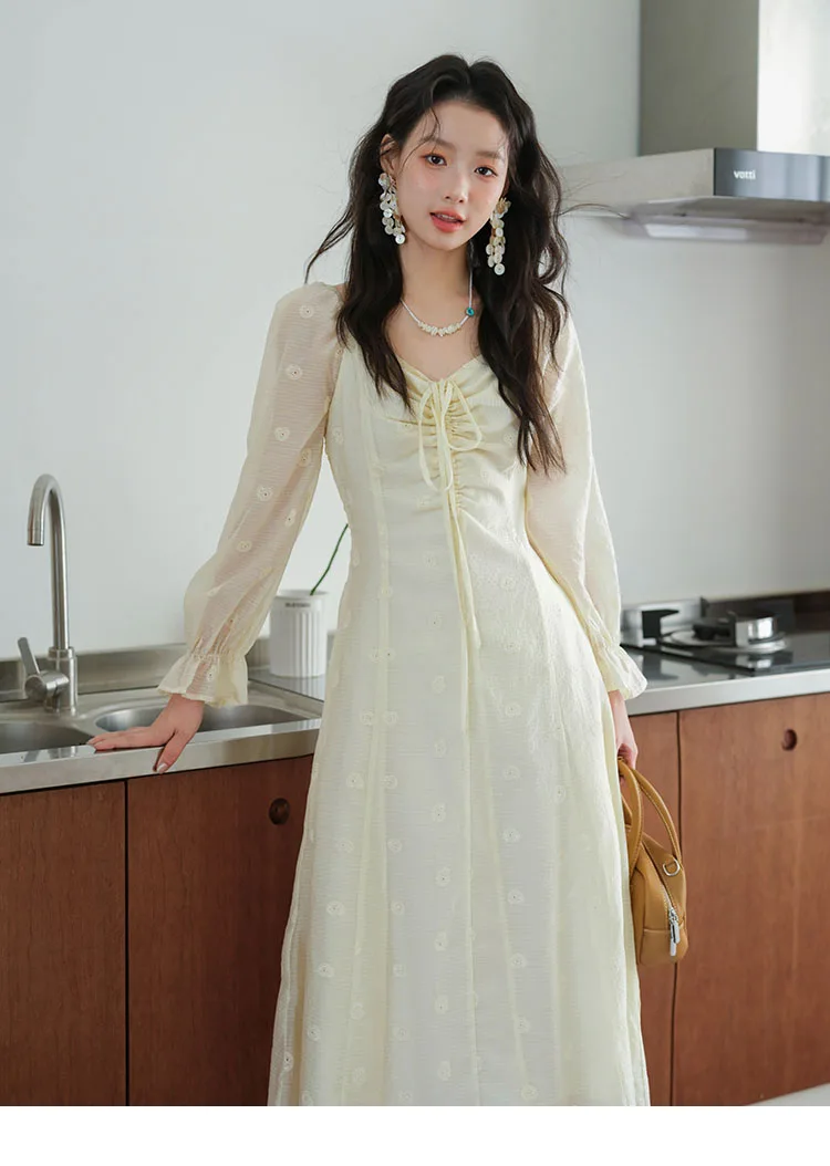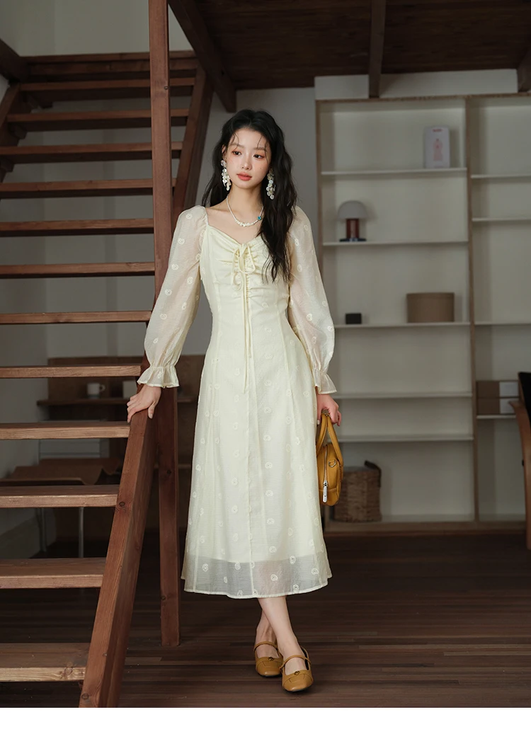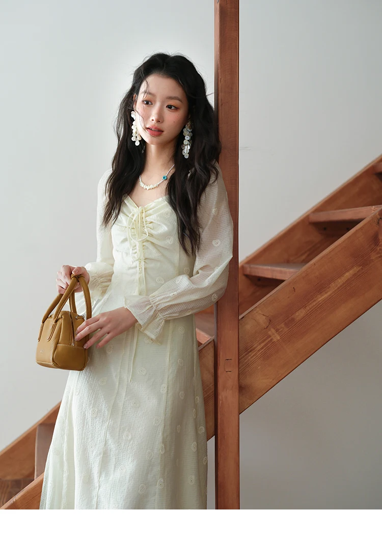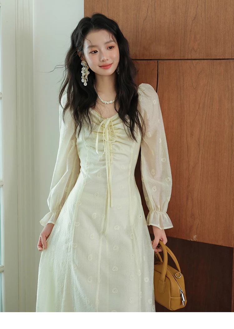 MISHOW Women's Cashew Flower Embroidered Dress 2025 Autumn V-neck Drawstring Long Sleeves Ladies Elegant Slim Dresses MXE41L2387