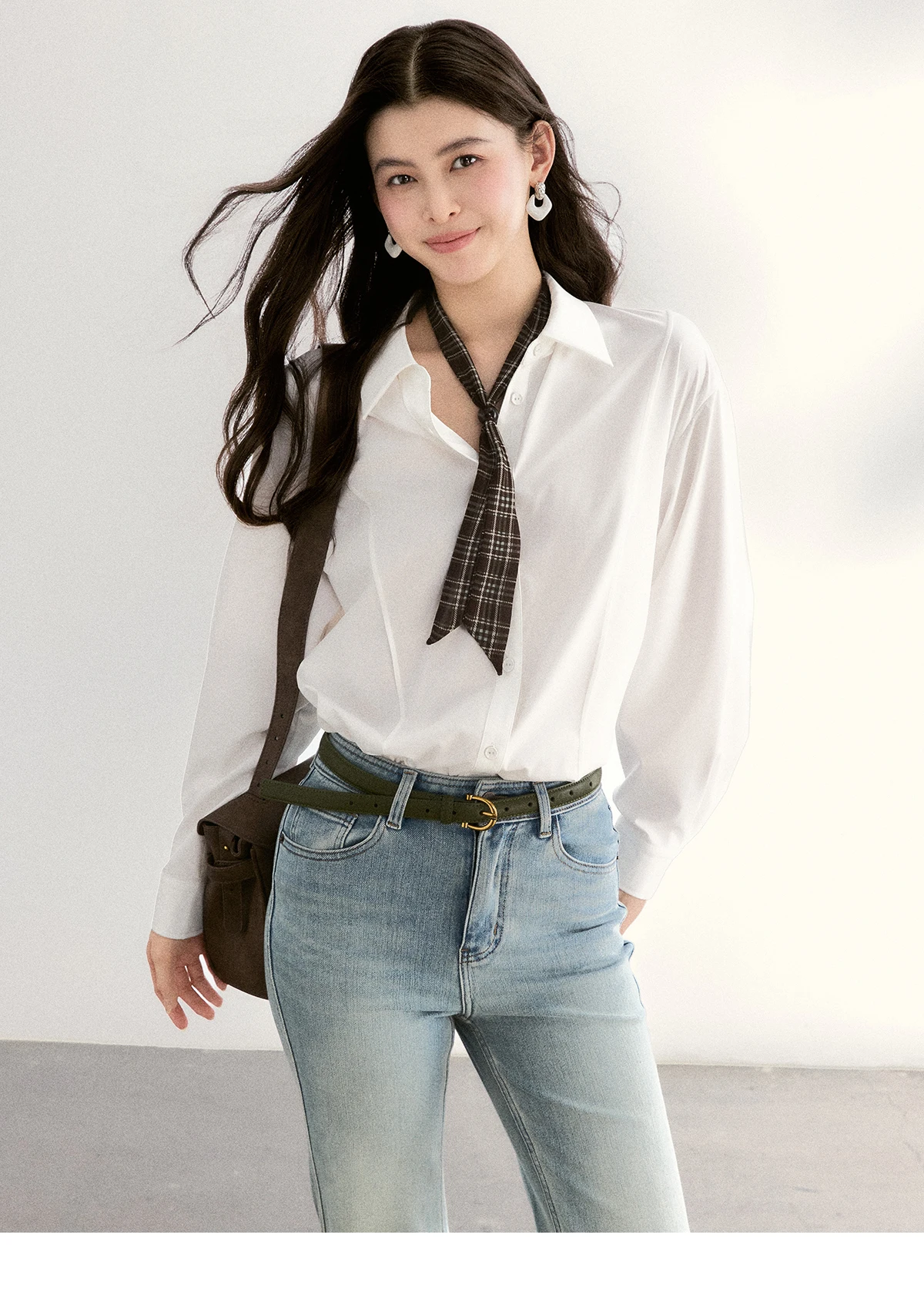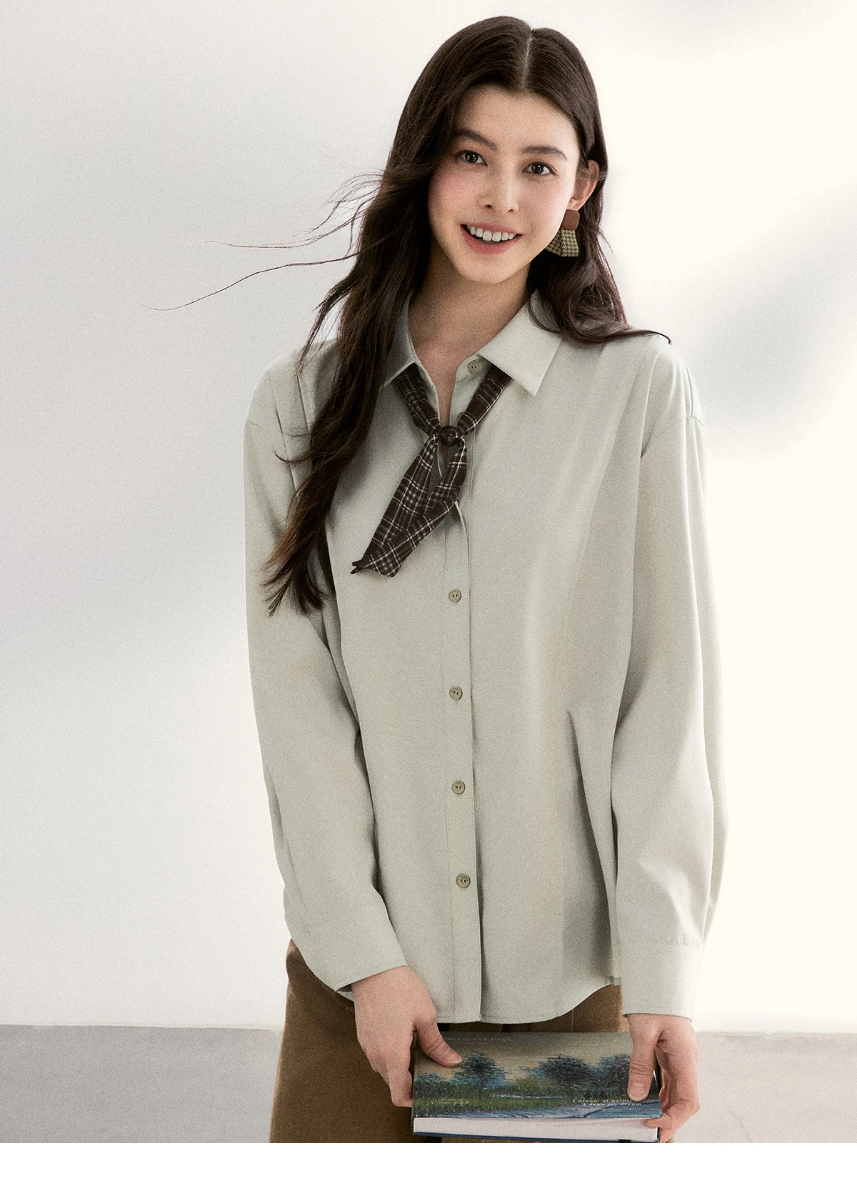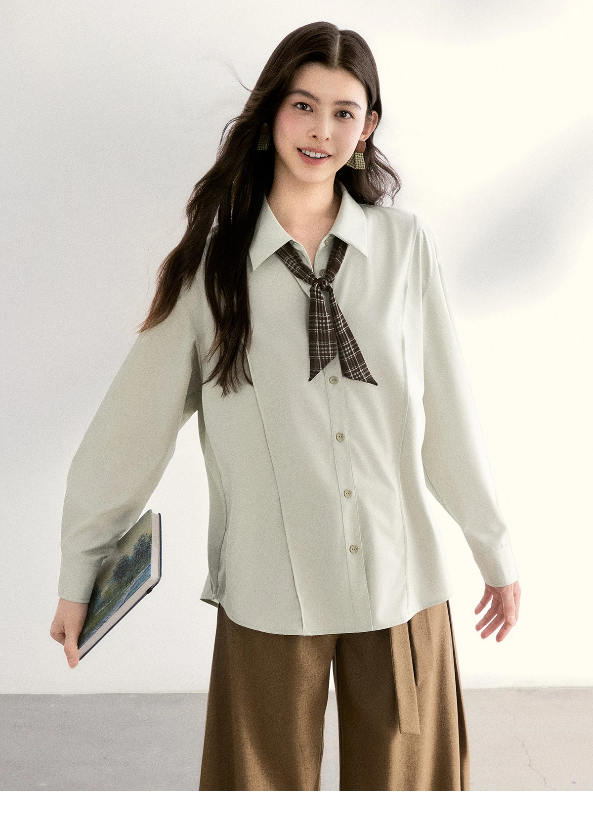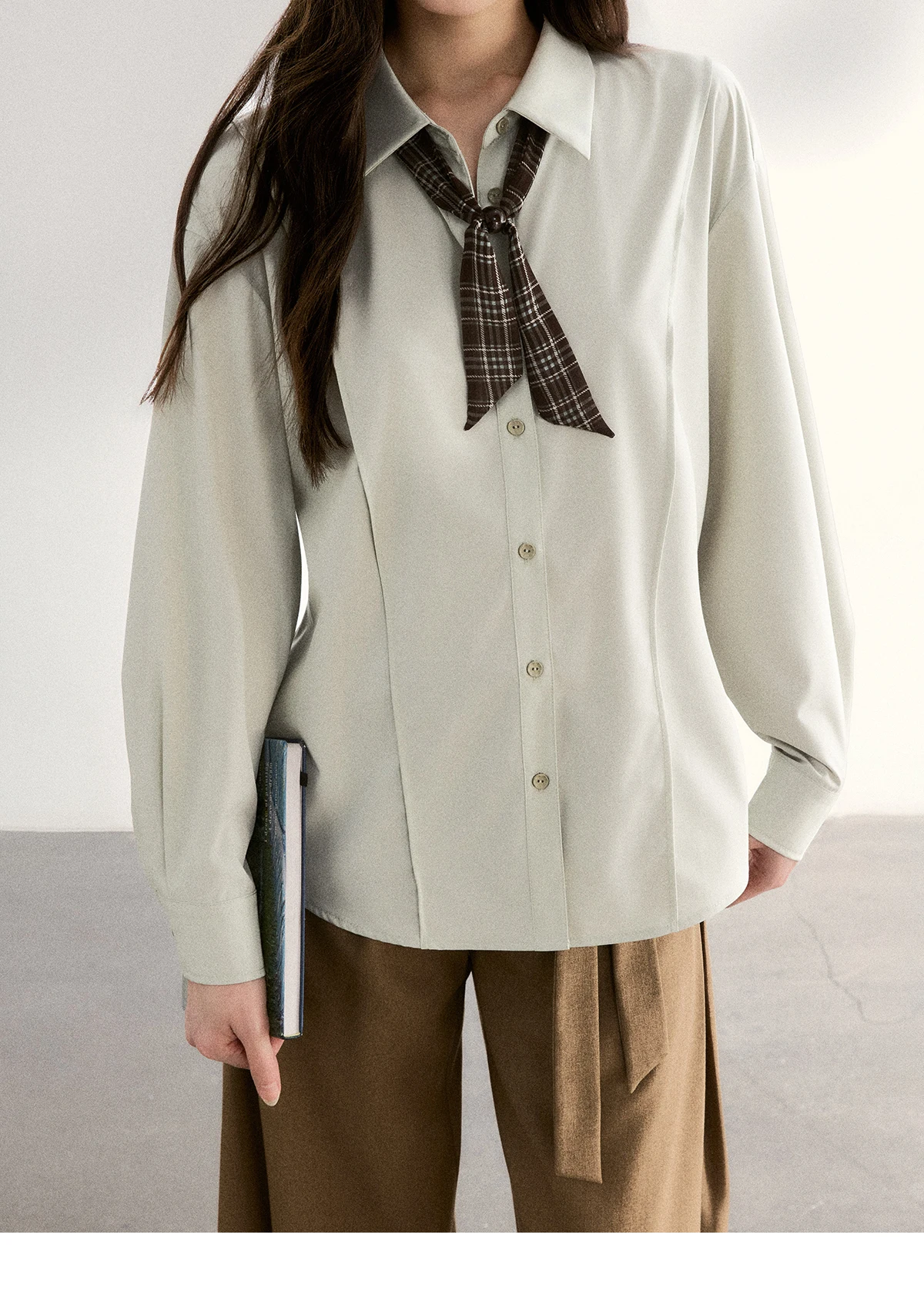 MISHOW Women's Casual Loose Shirt with Plaid Scarf 2026 Spring Lapel Tops Versatile Long Sleeve Shirts Office Lady MXF108C0815