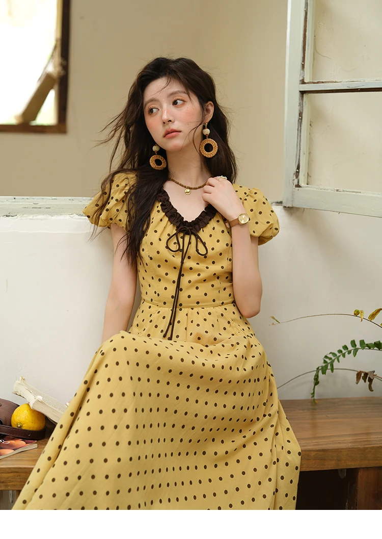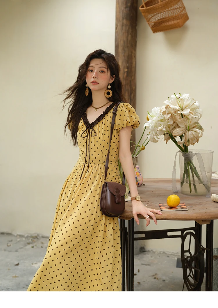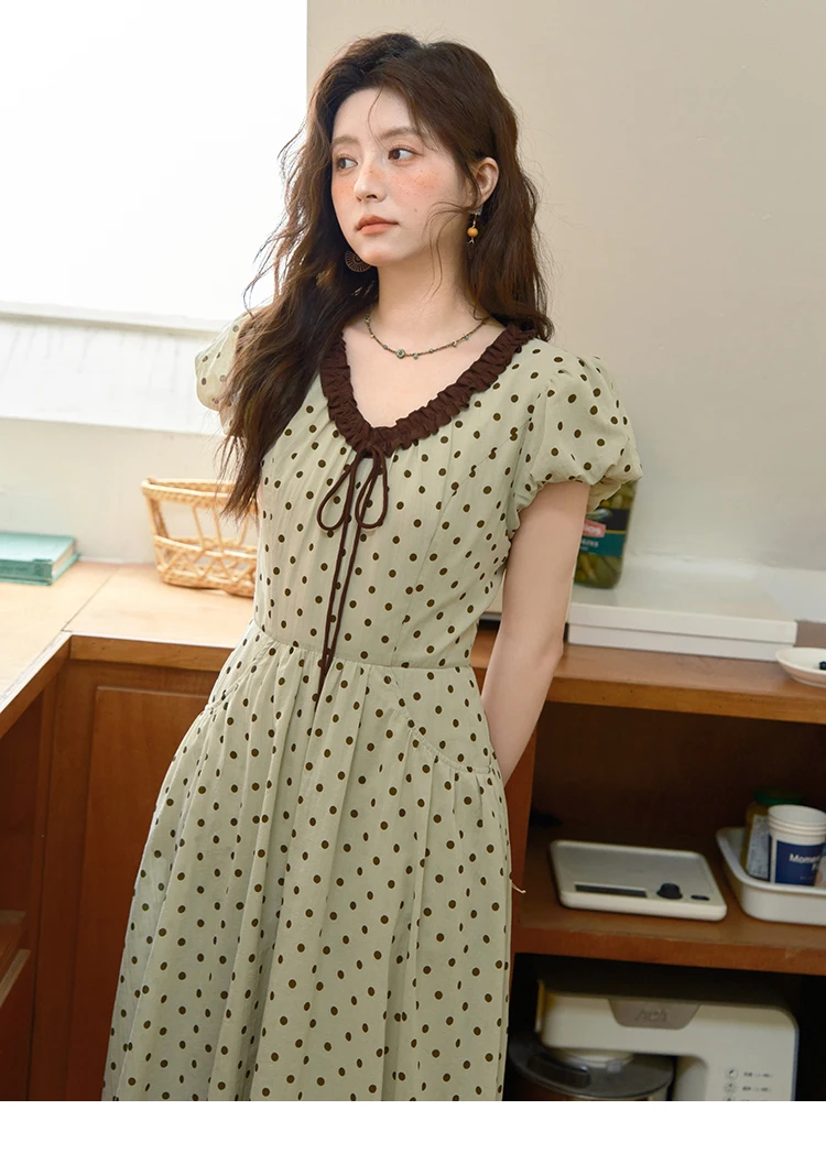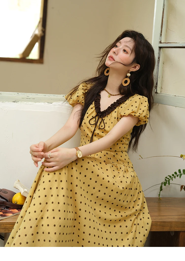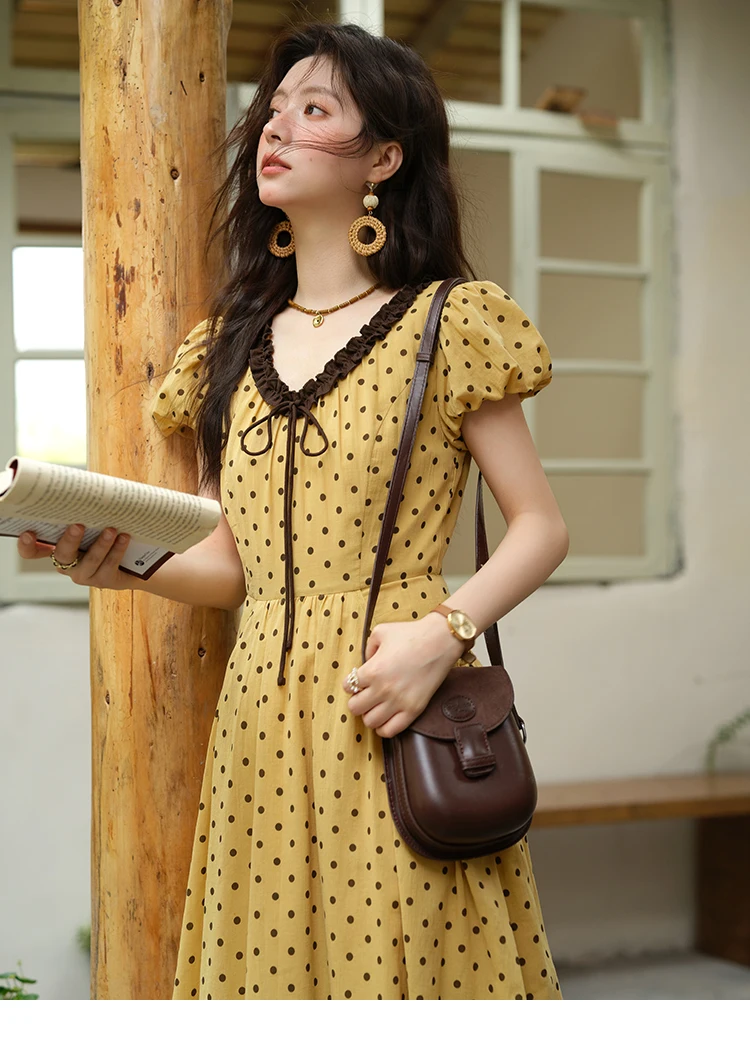 MISHOW Women's Casual Polka Dot Dress 2025 Summer New Ladies Puff Sleeve V-neck Lace Up Ruffle Edge Pocket Dresses MXE39L2326