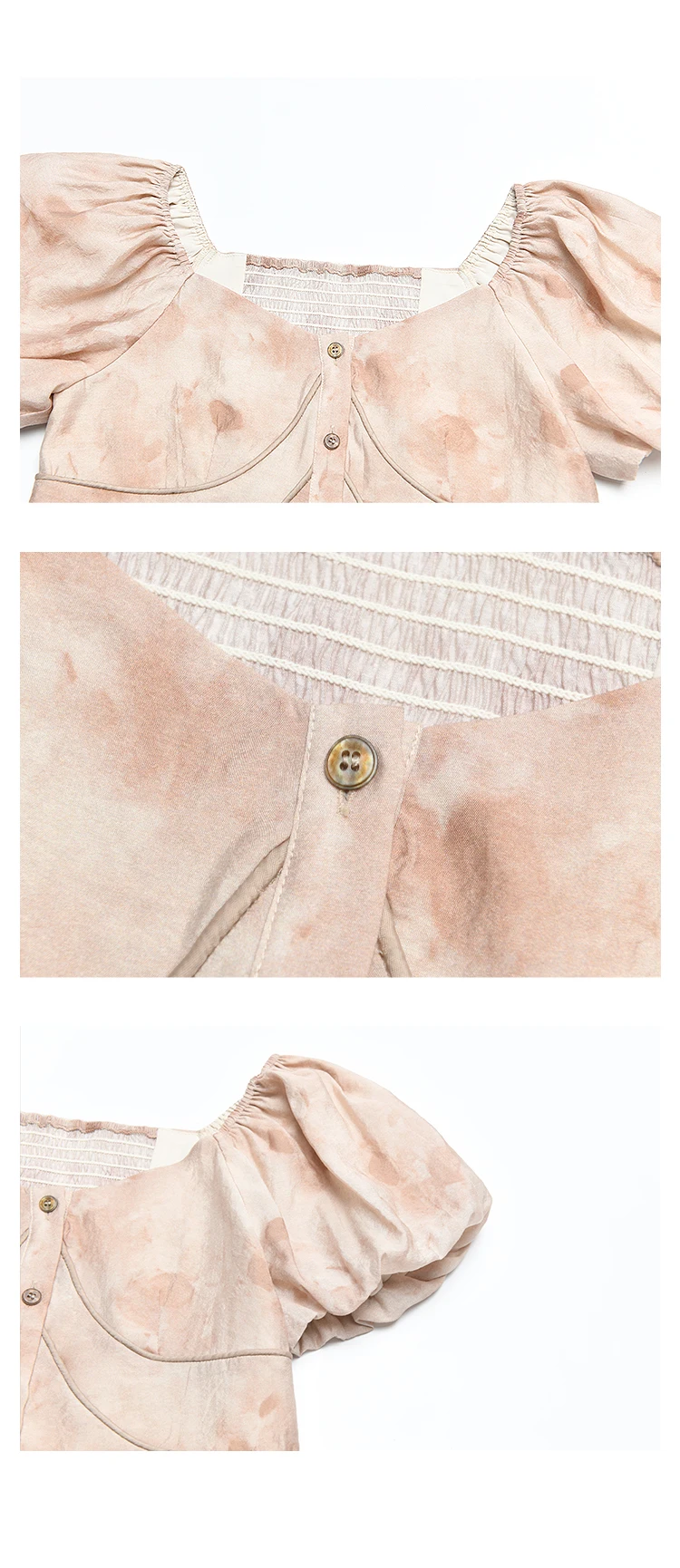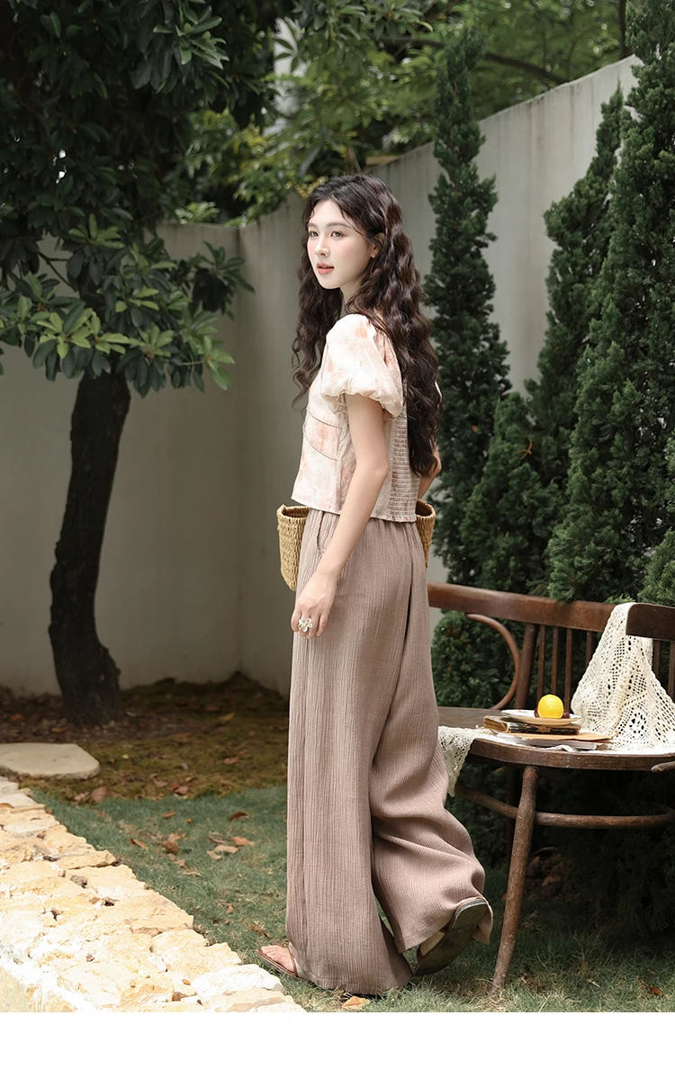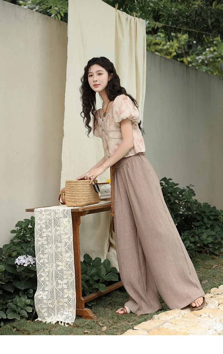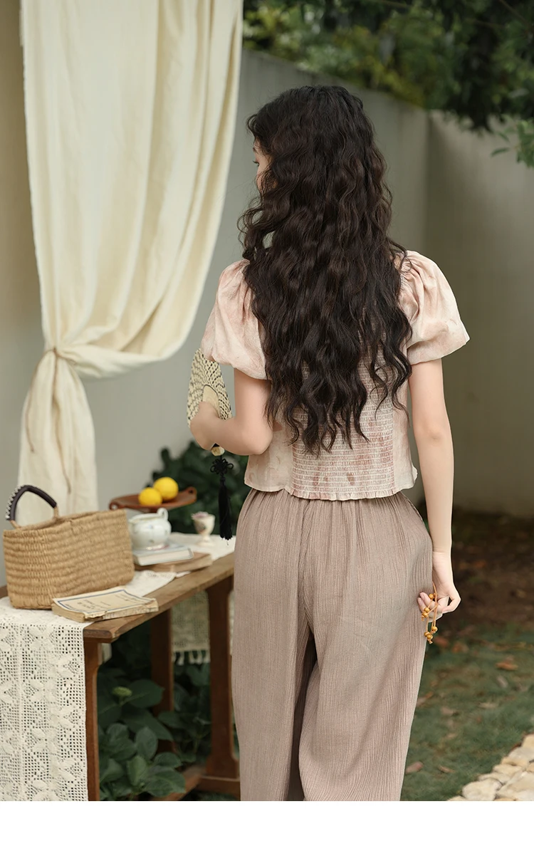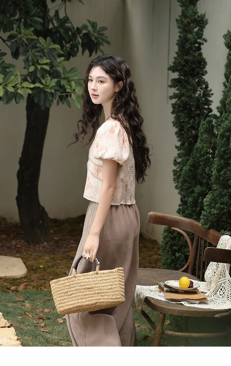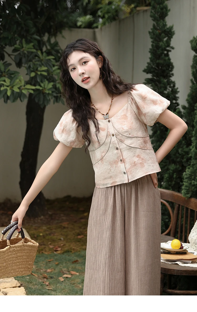 MISHOW Women's Contrast Halo Printing Blouses 2024 Summer French Retro Square Tops Female Puff Sleeve Button Blouse MXD30X1562