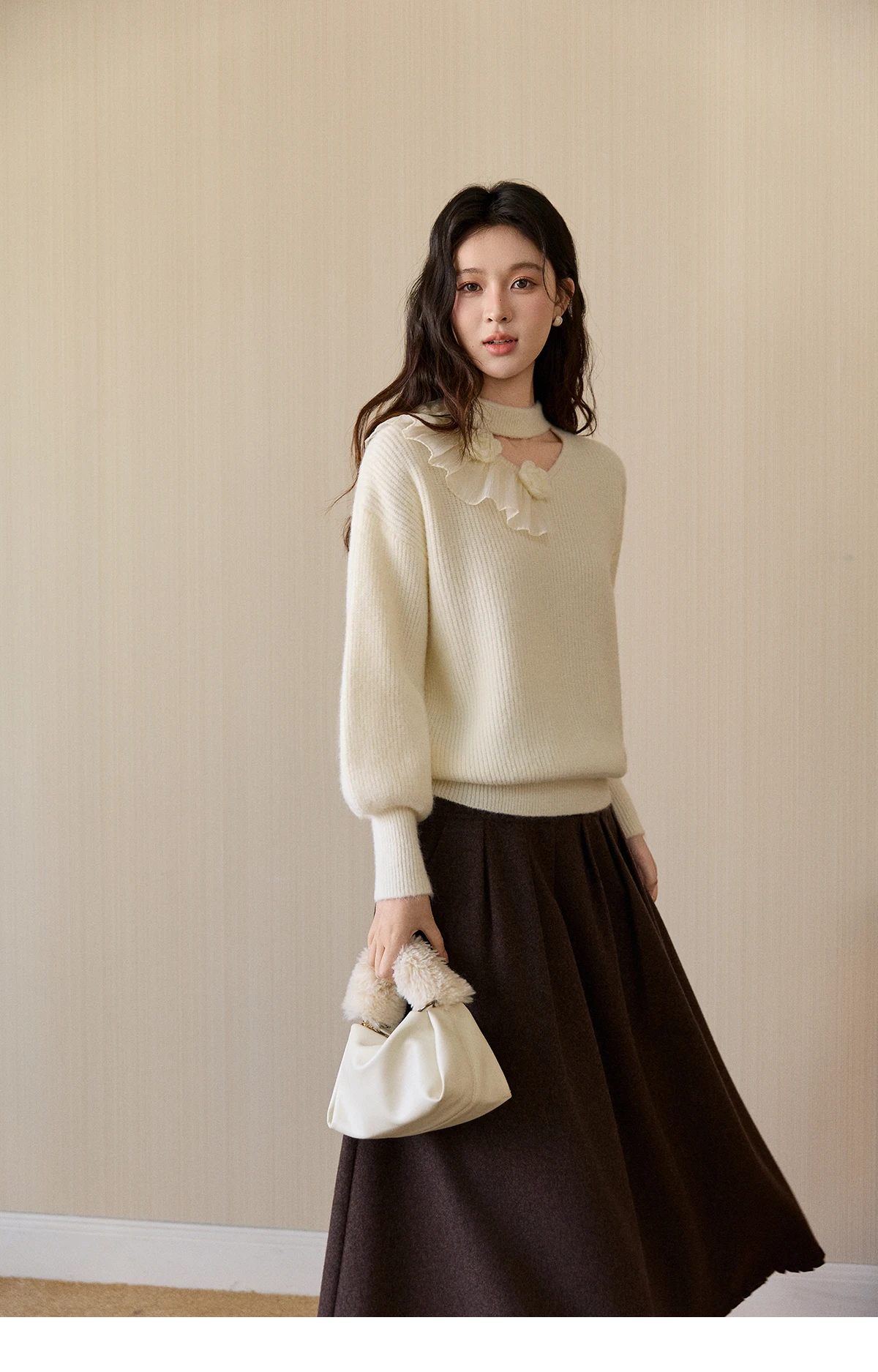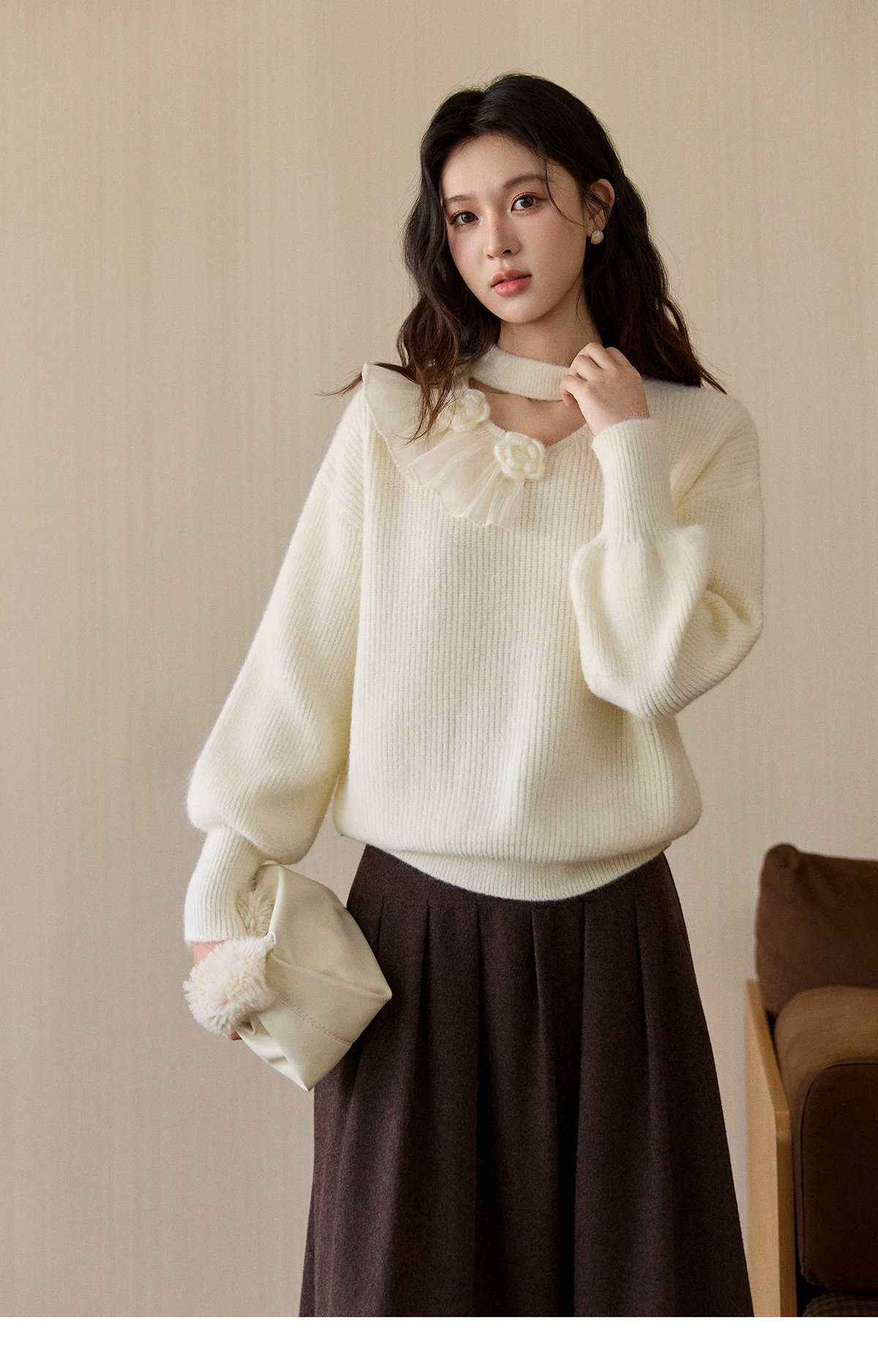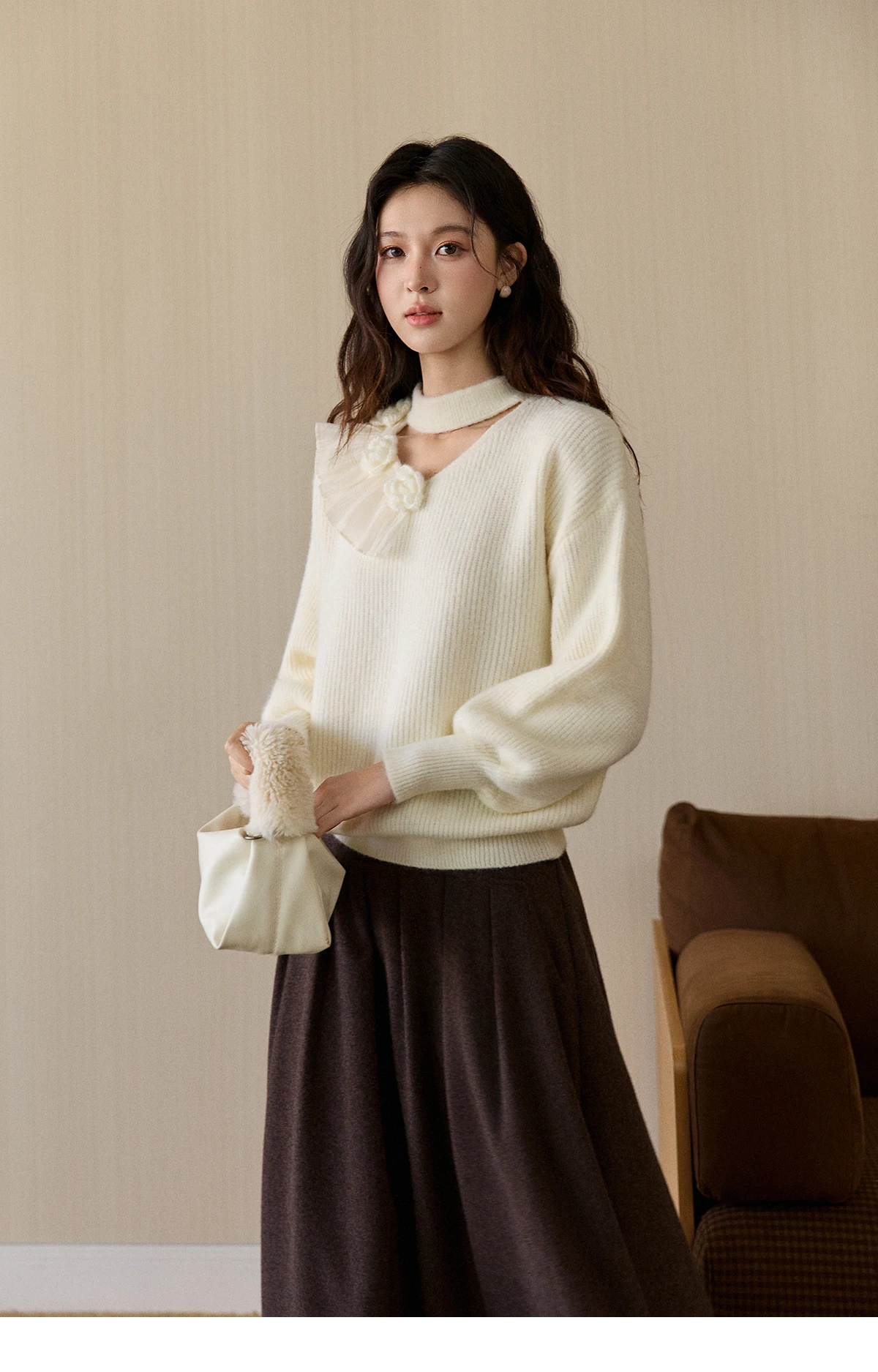 MISHOW Women's Cutout Neck Knitted Sweater 2025 Winter Ruffle Flower Decor Dropped Lantern Sleeves Pullover Tops MXE94Z2982