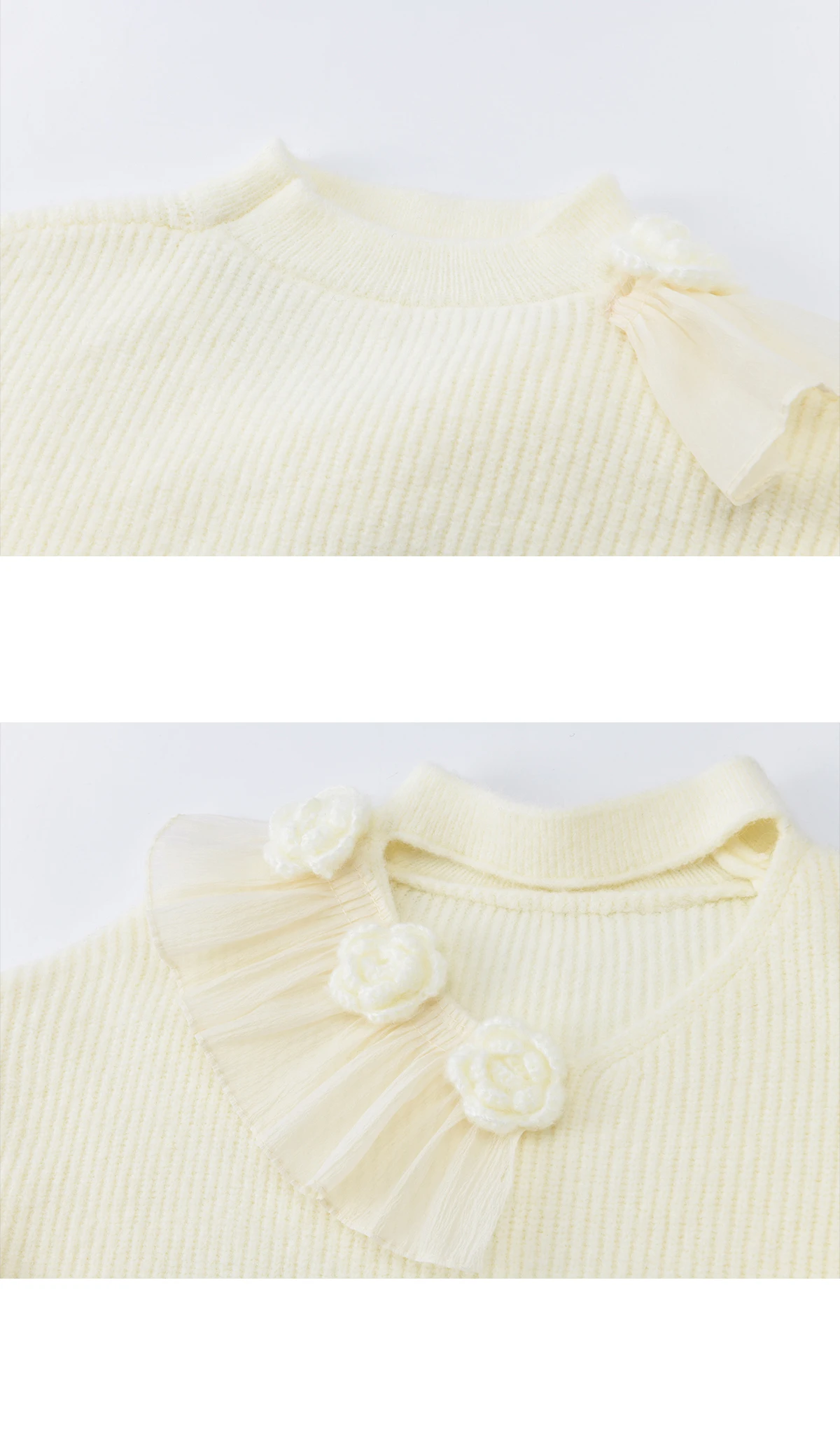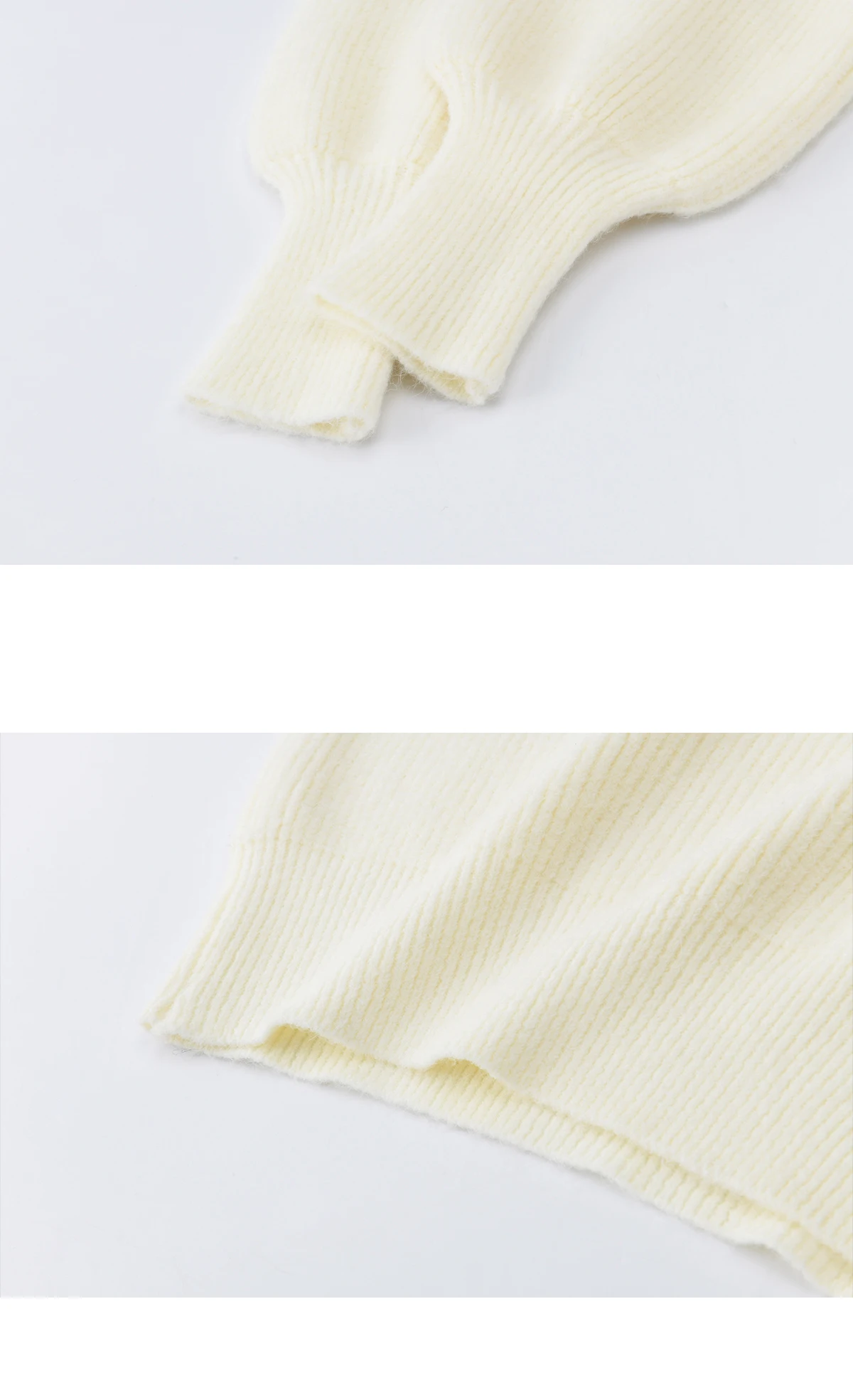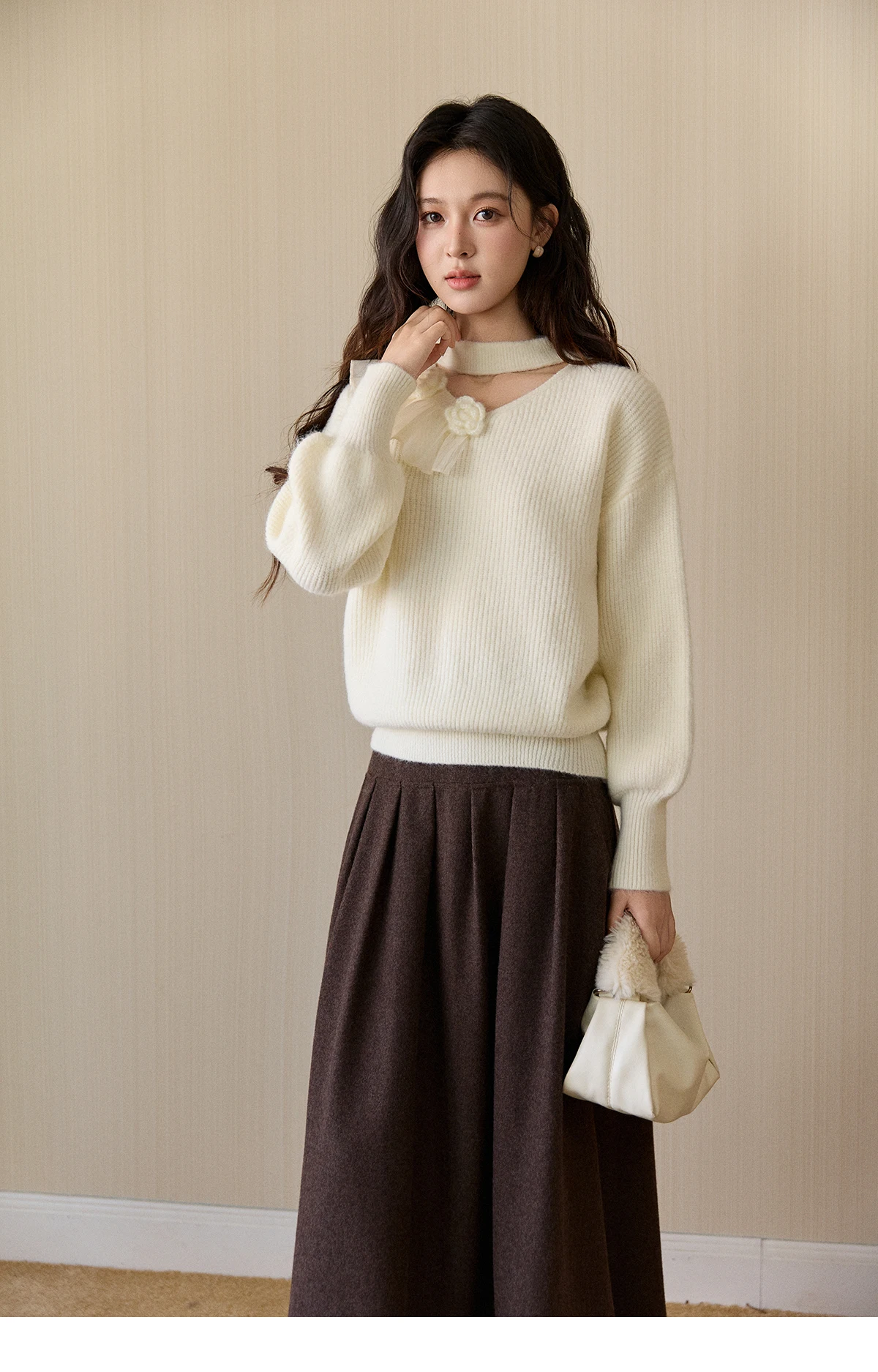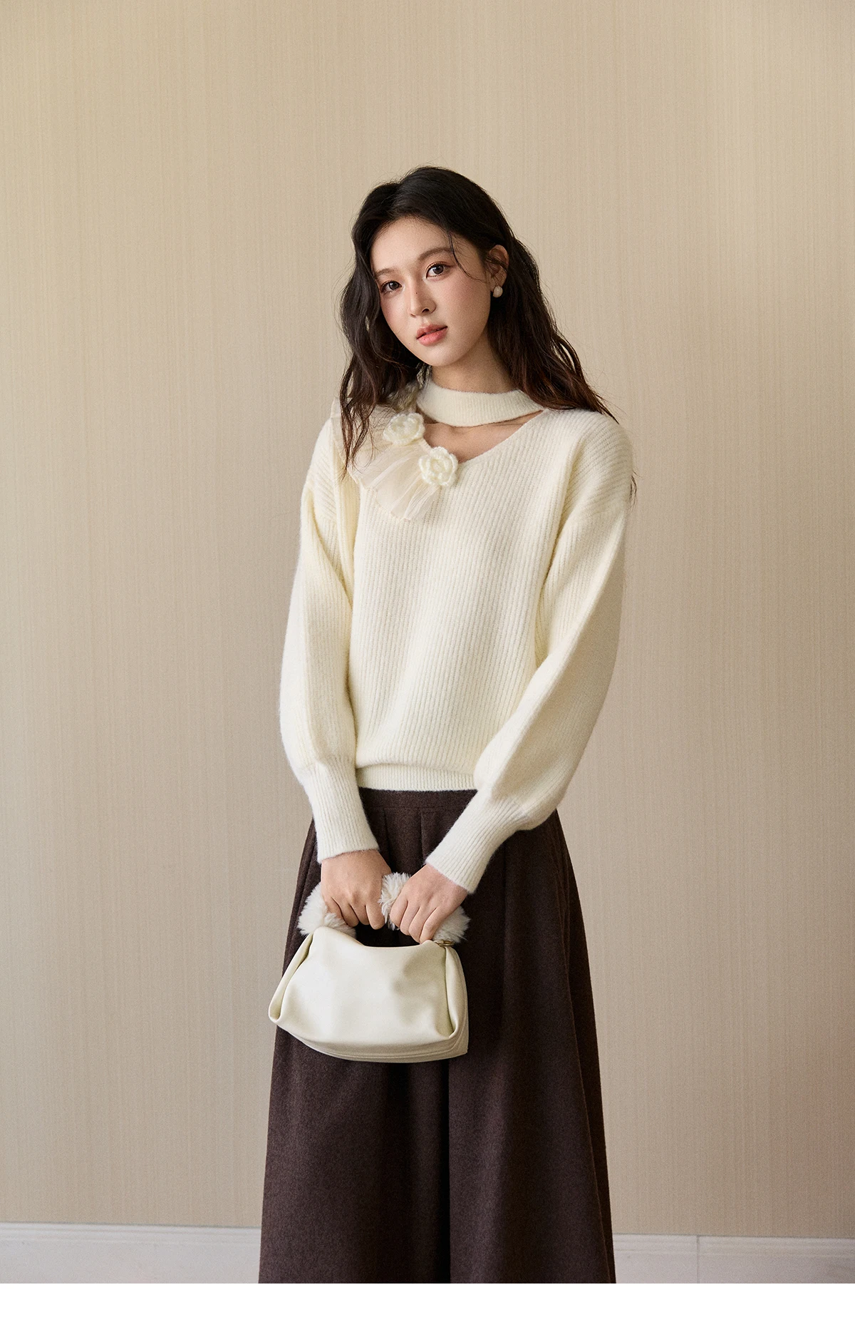 MISHOW Women's Cutout Neck Knitted Sweater 2025 Winter Ruffle Flower Decor Dropped Lantern Sleeves Pullover Tops MXE94Z2982