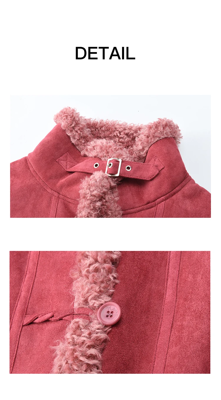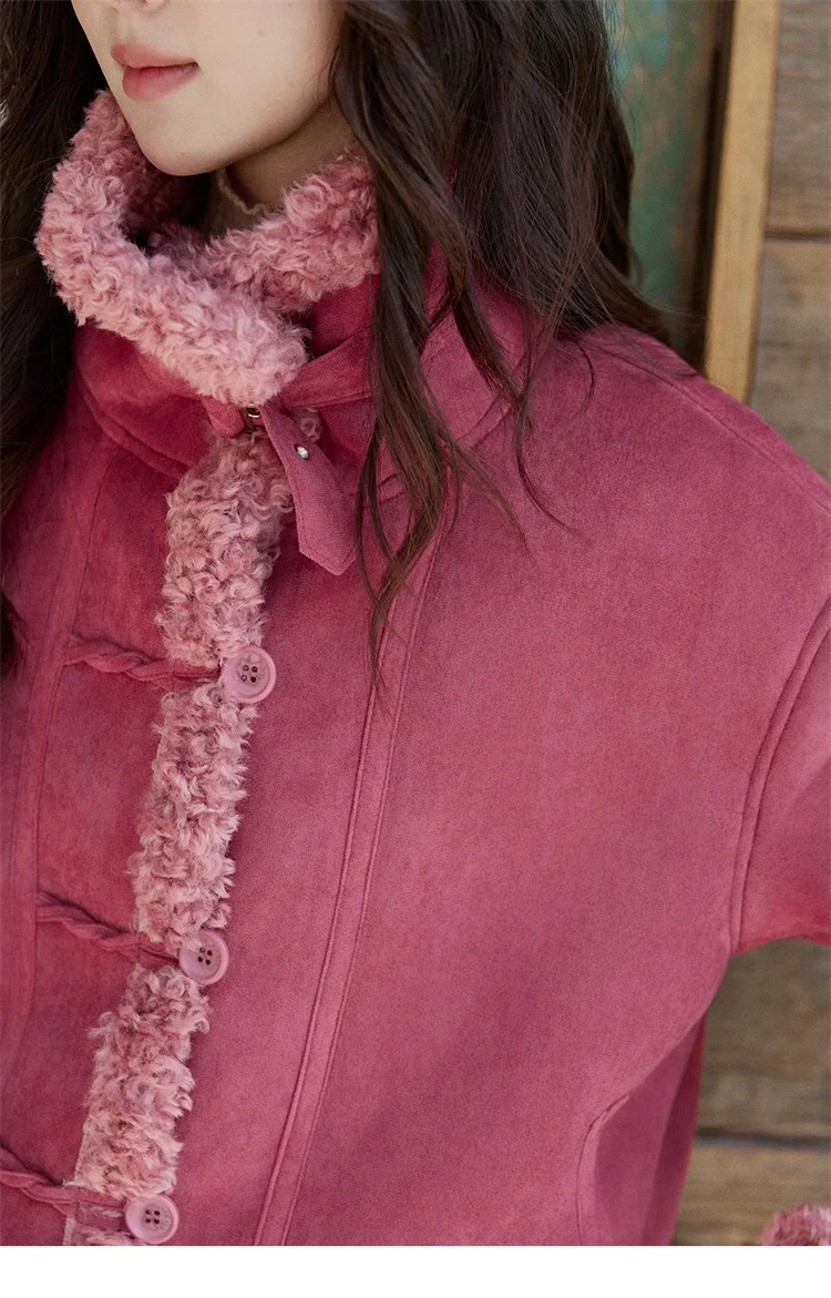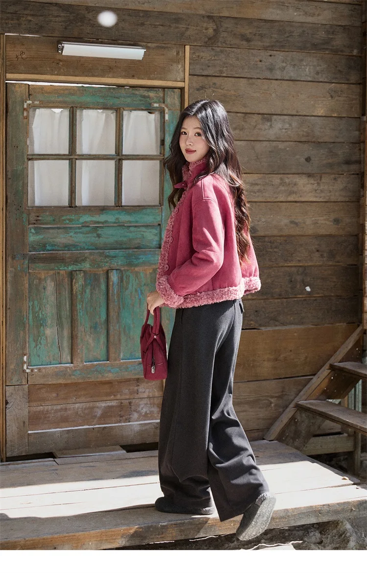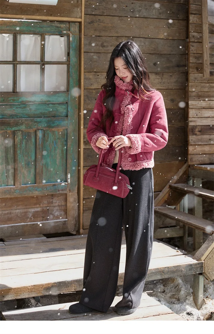 MISHOW Women's Dragon Fruit Red Suede Patchwork Coat 2025 Winter Color Block Stand Collar Thickened Short Outerwear MXE87W0942