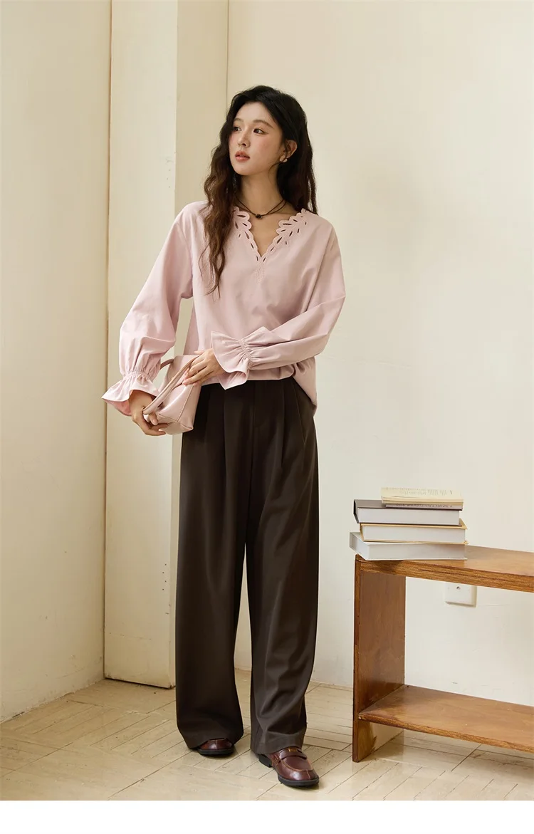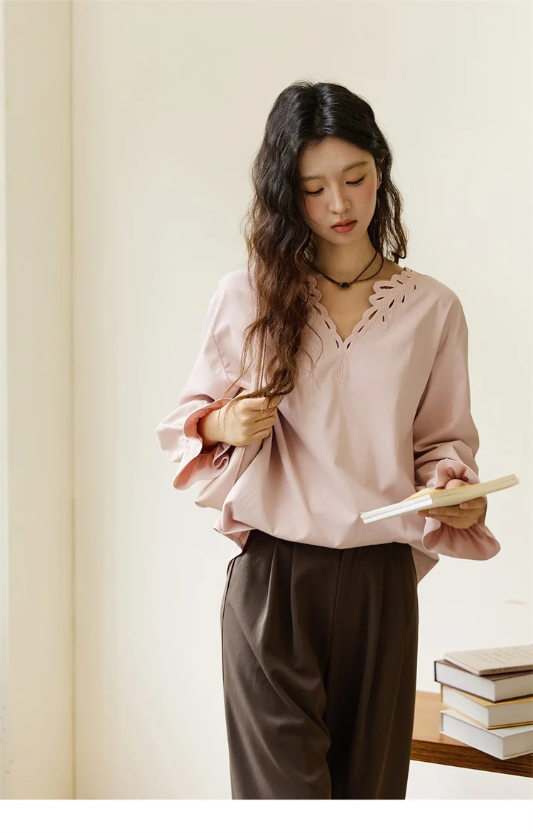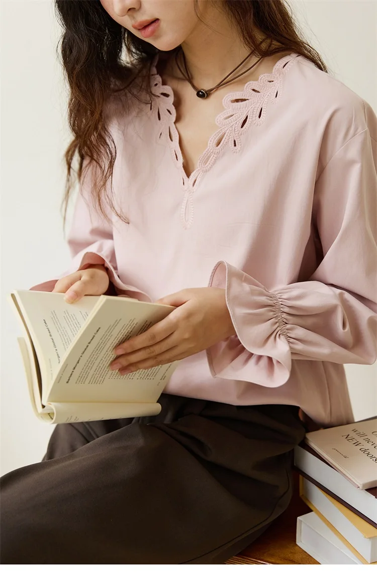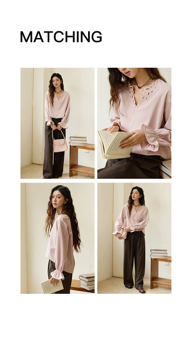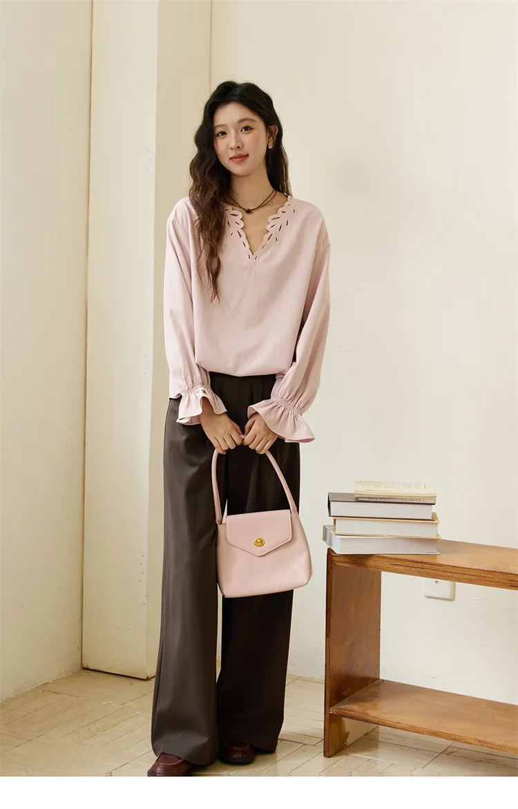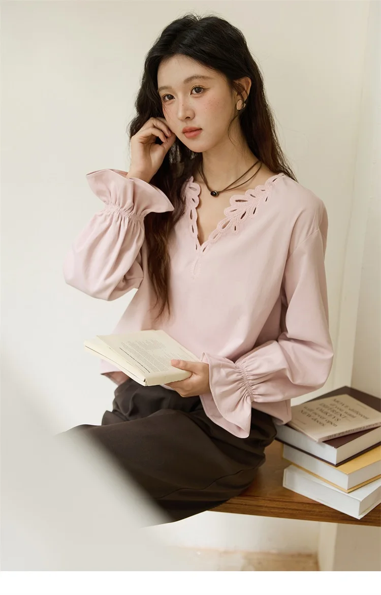 MISHOW Women's Elegant Blouse 2025 Autumn French Style Hollow Out V Neck Pink Blouse Loose Commute Long Sleeves Top MXE48X2502