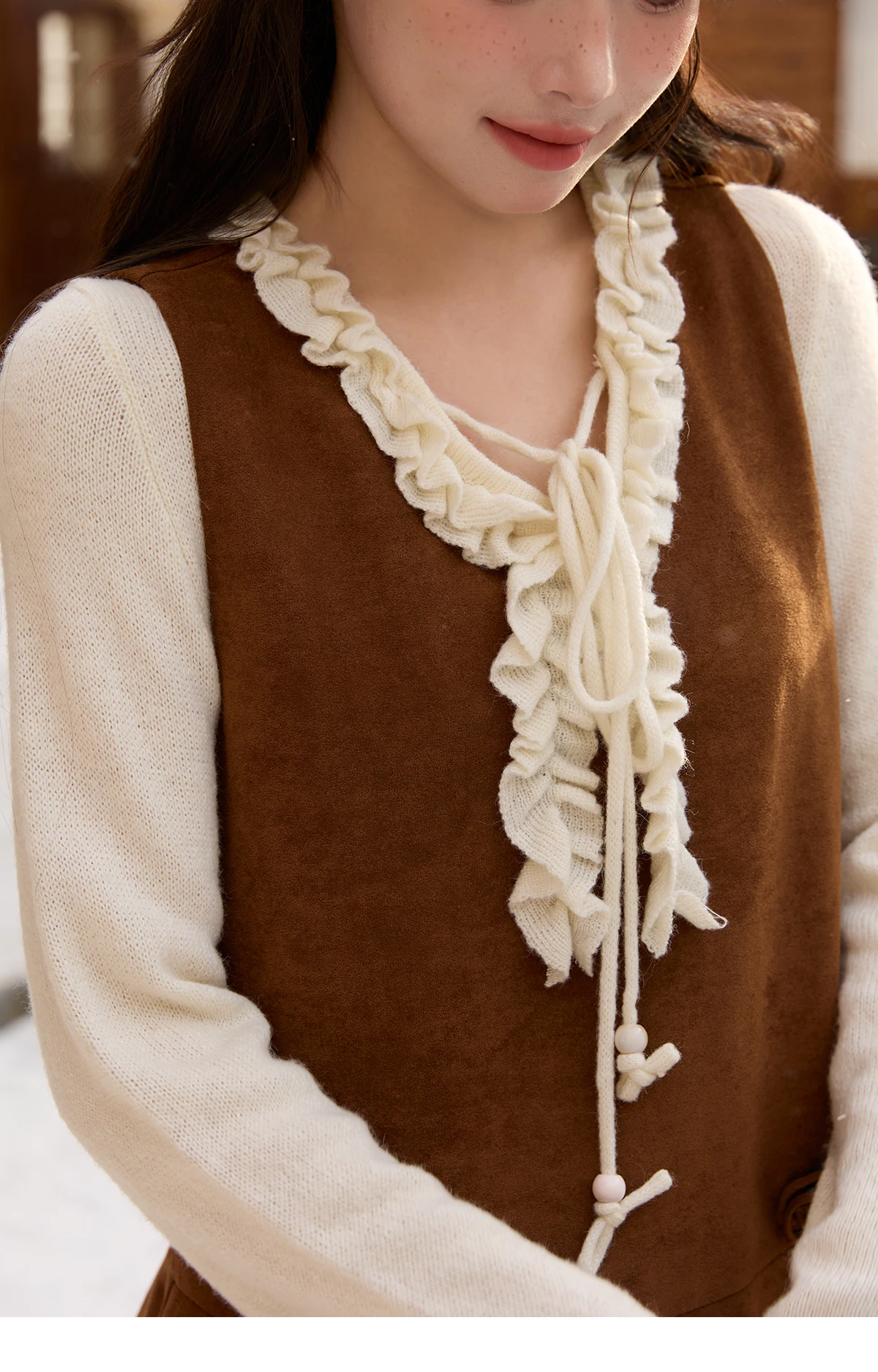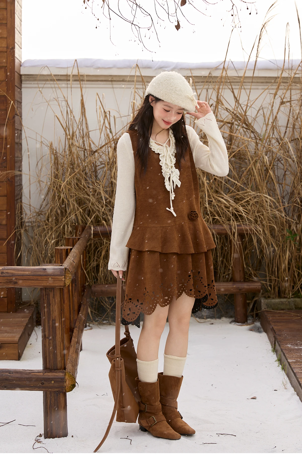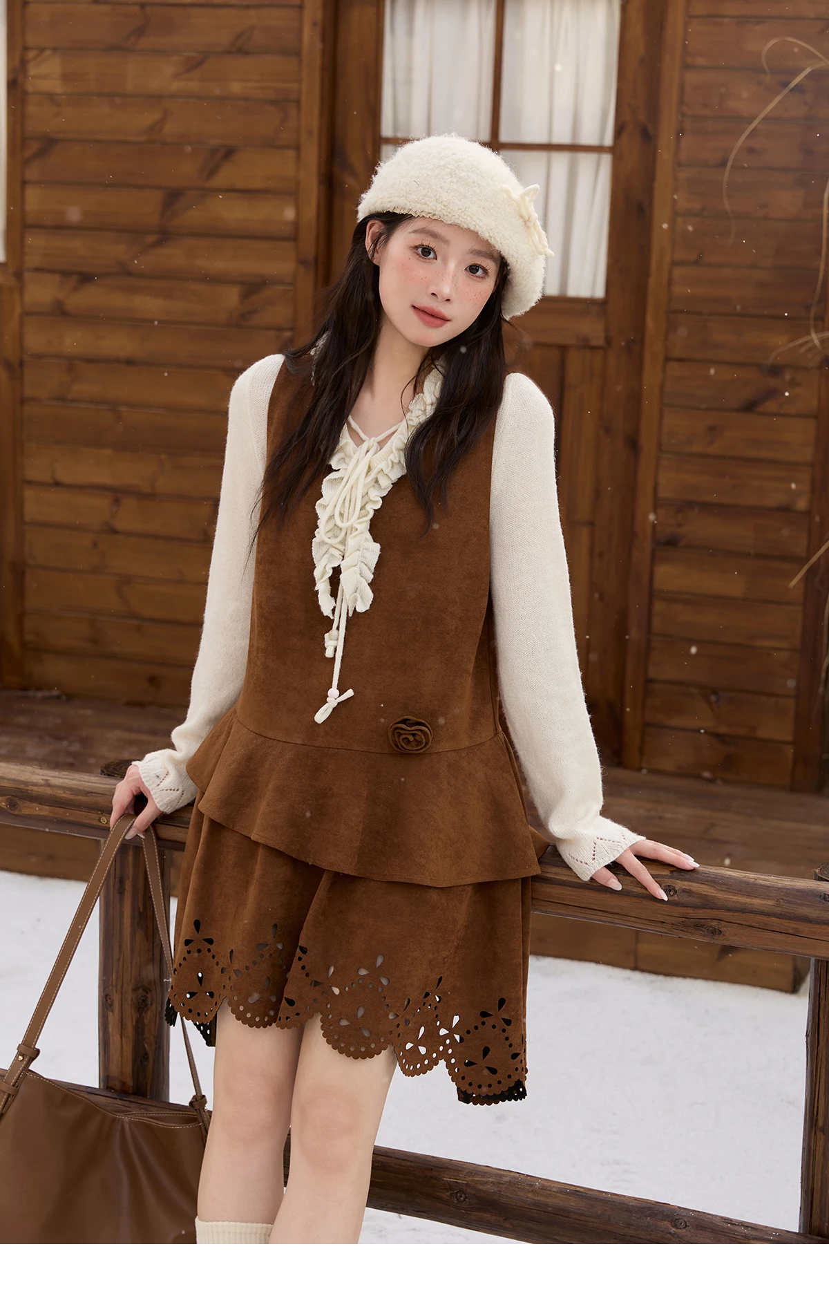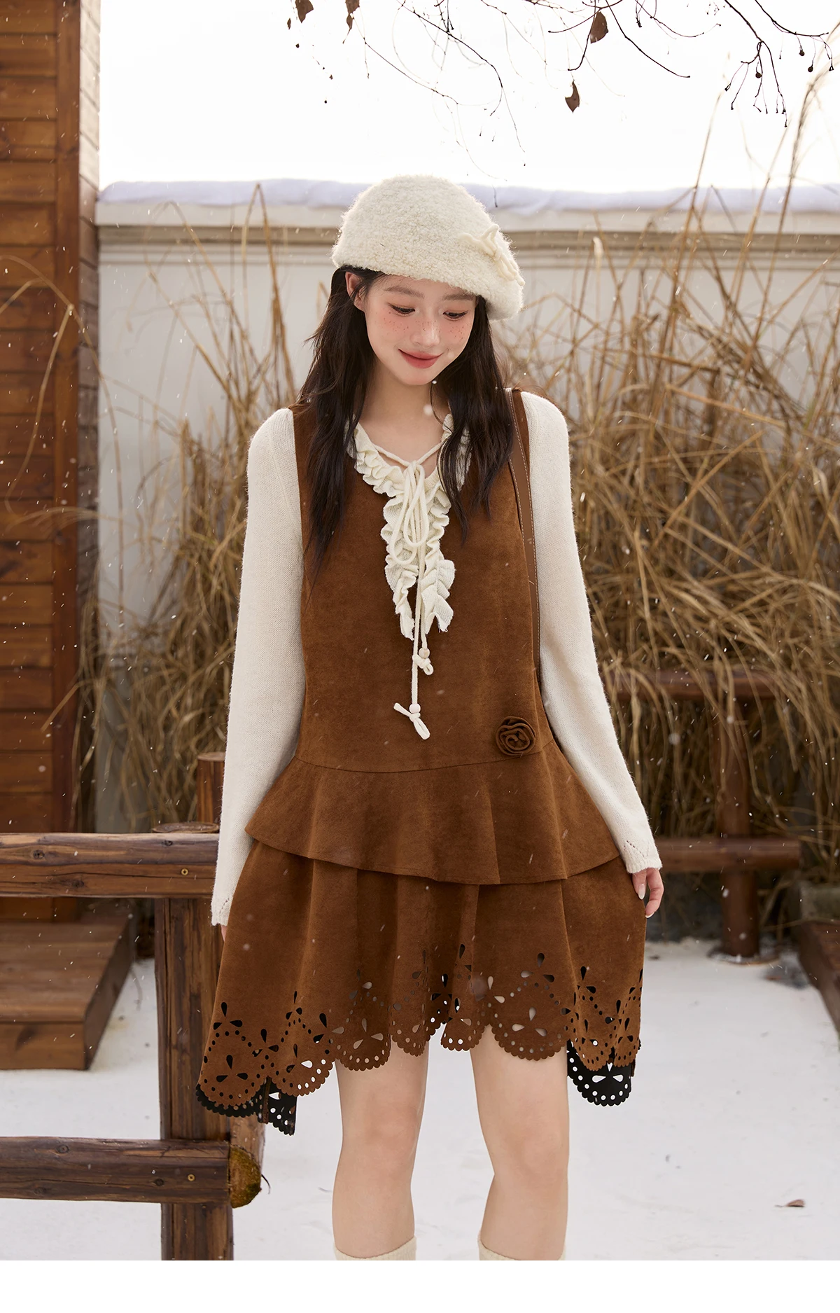 MISHOW Women's Elegant Brown Retro Suede Vest Dress 2025 Autumn Winter Hollow Out V-Neck Tank Dress Sleeveless Dress MXE51L2524