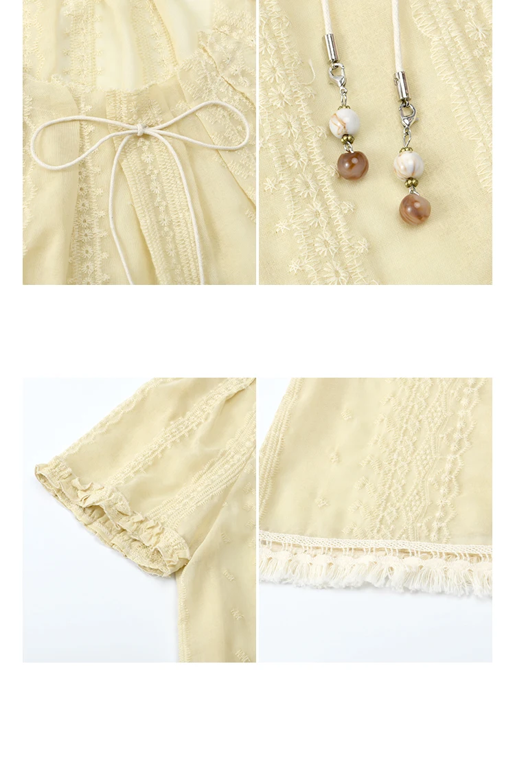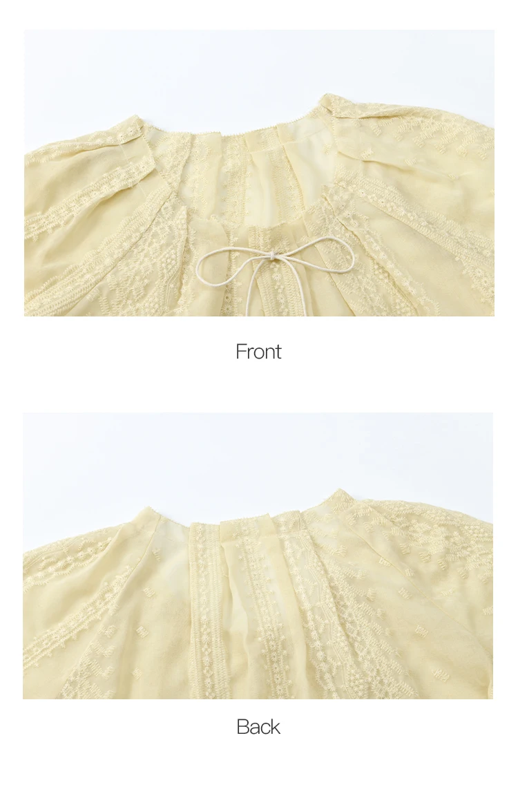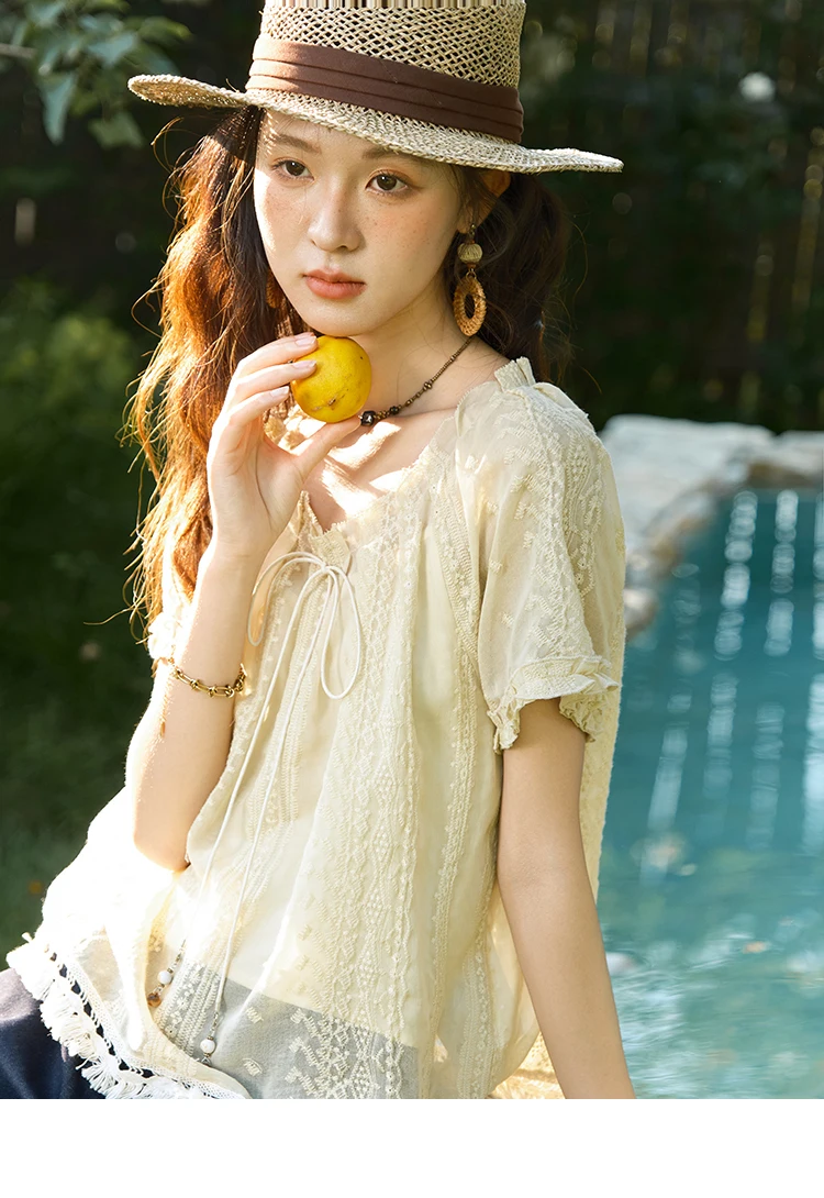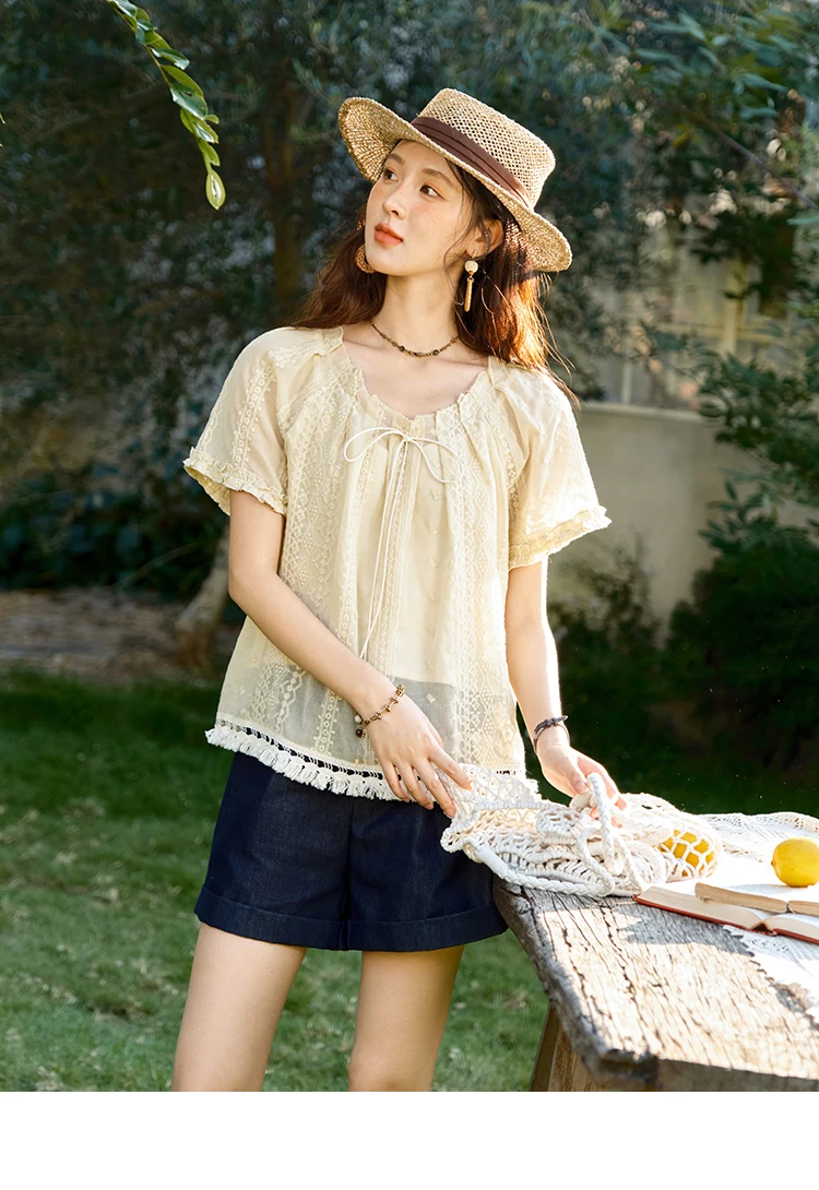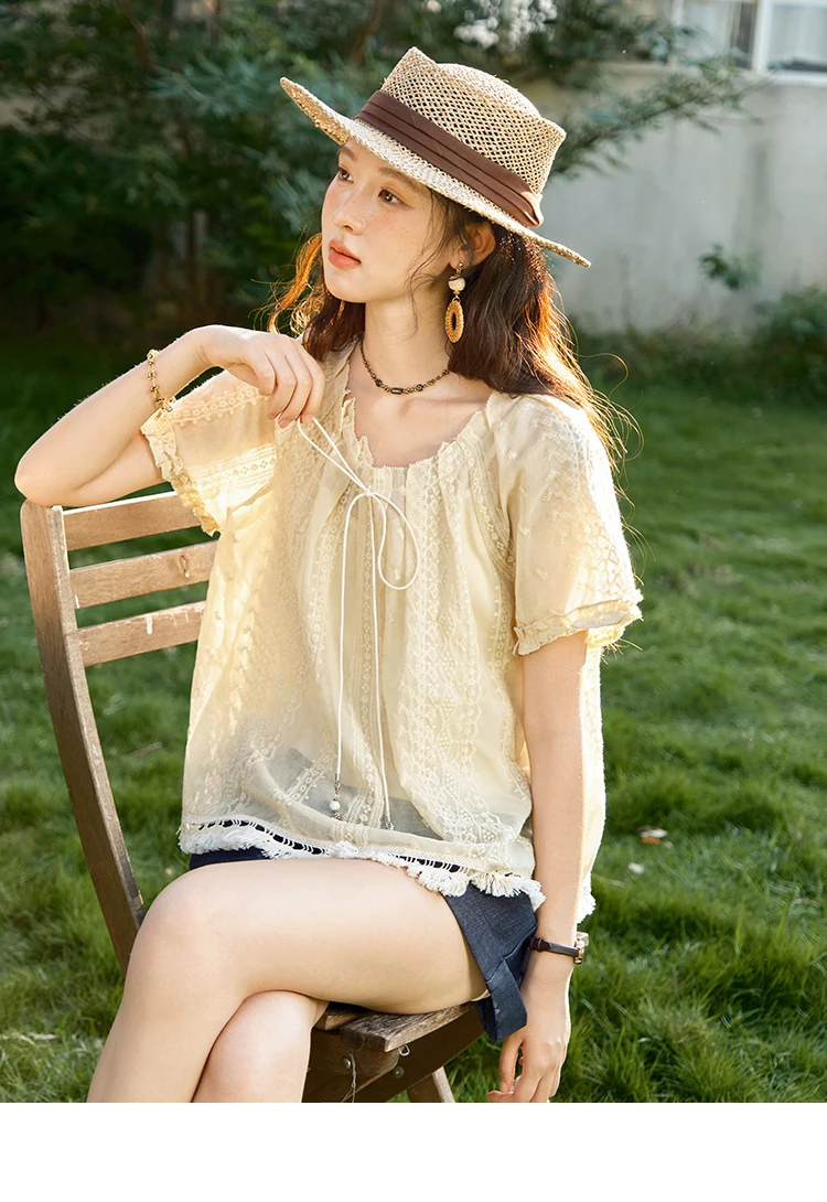 MISHOW Women's Embroidery Jacquard Blouse 2025 Summer New Fashion O-Neck Lace Up Short Sleeve Blouse Female Clothing MXE37X1861