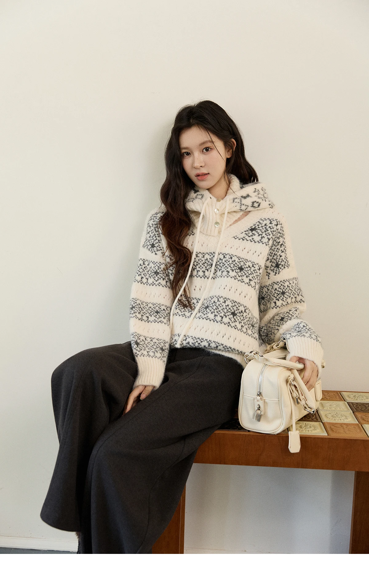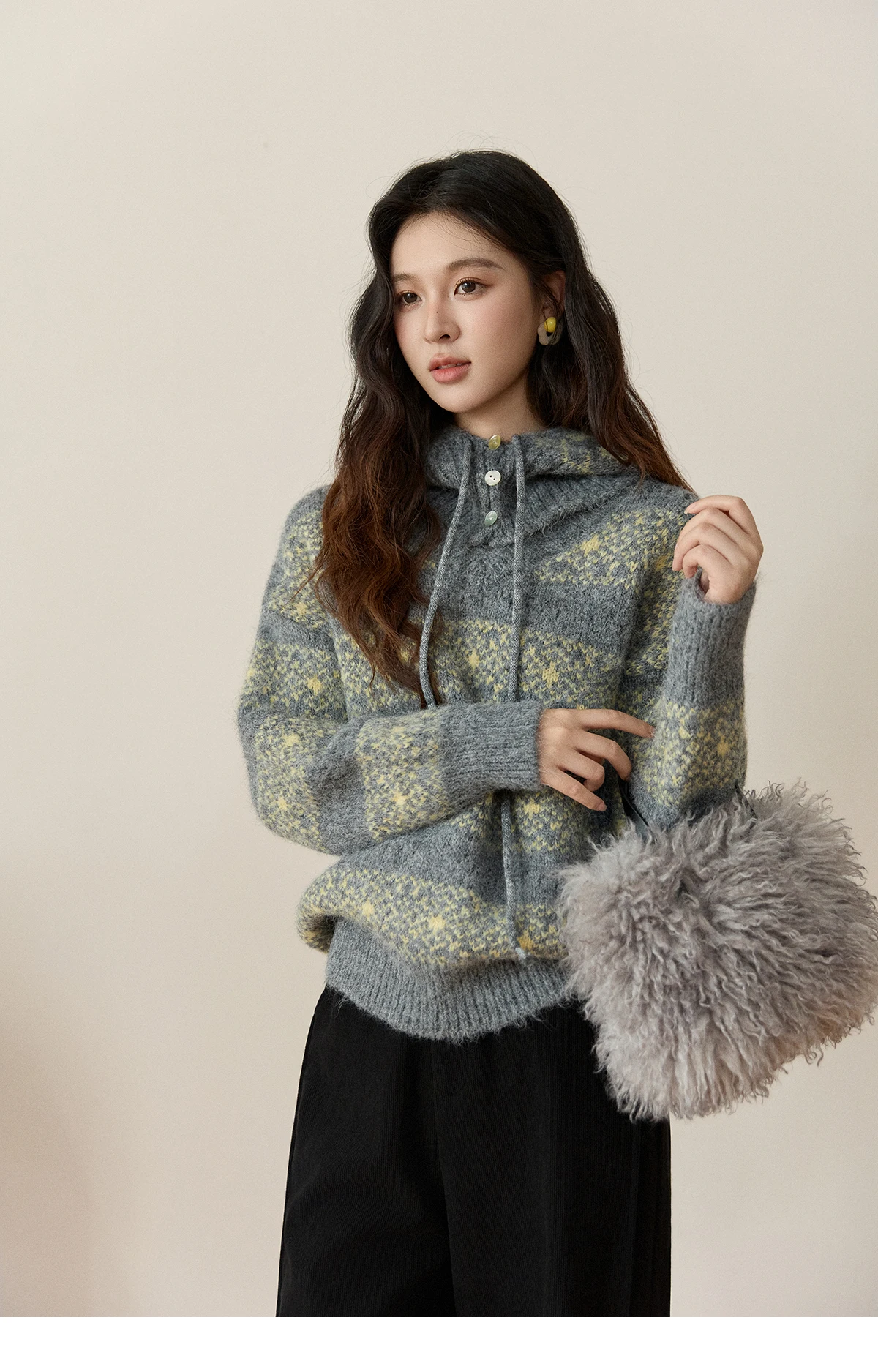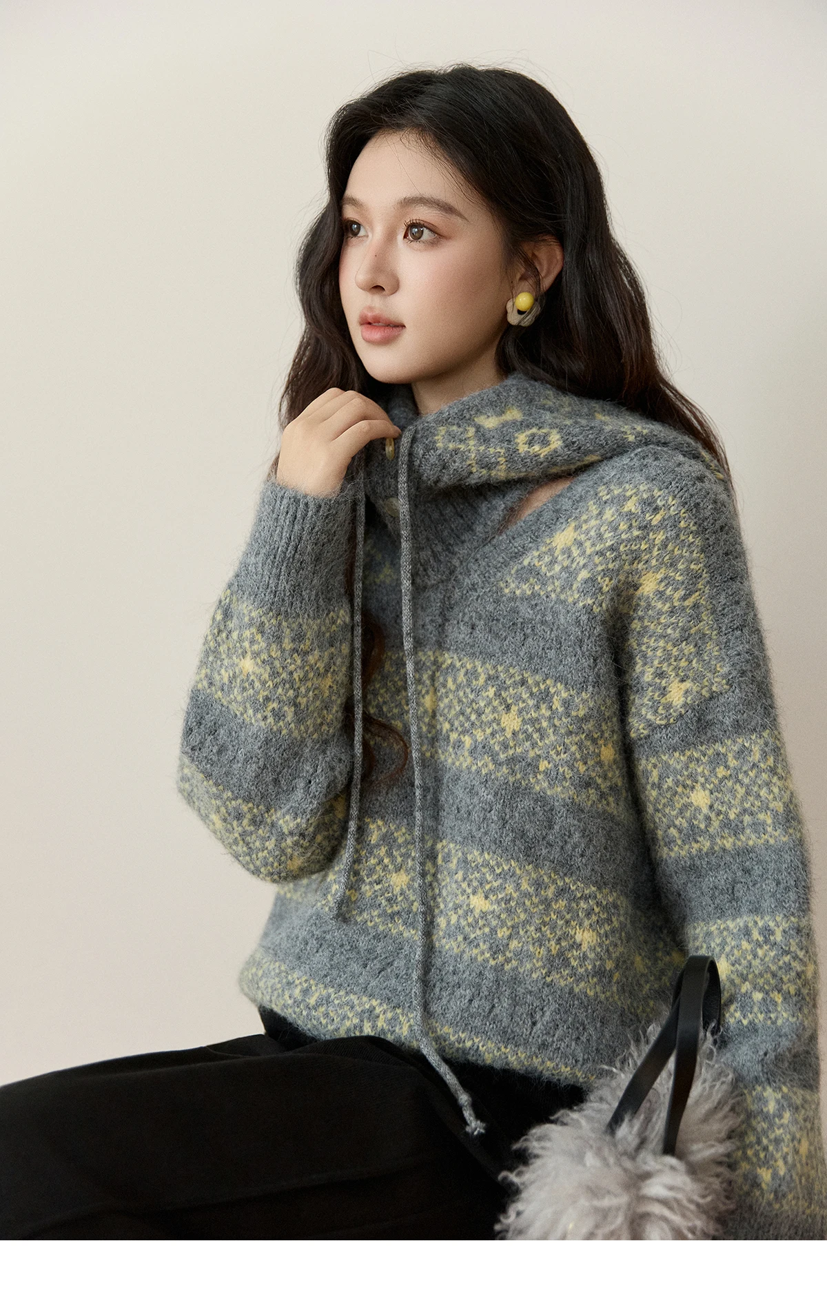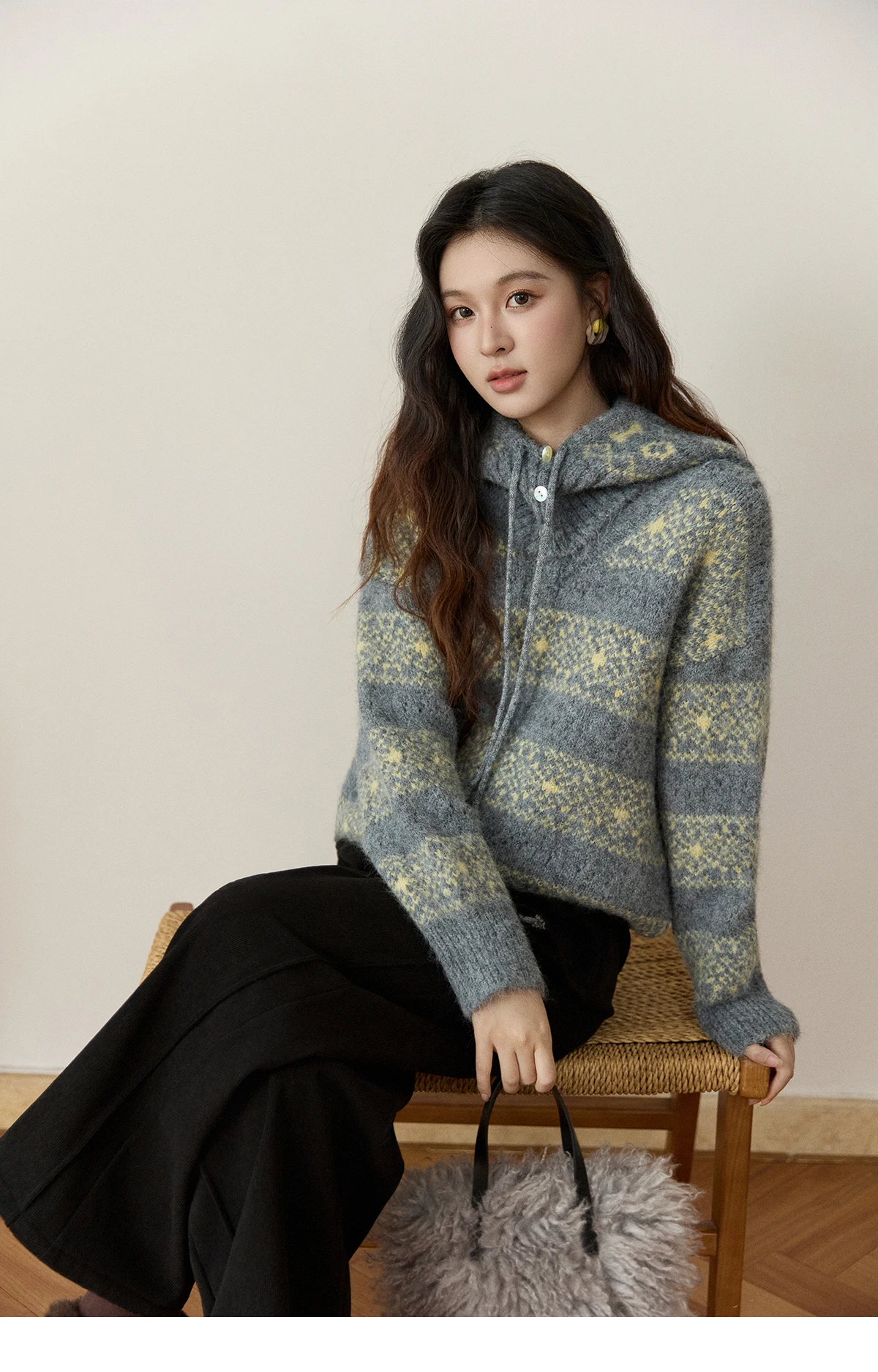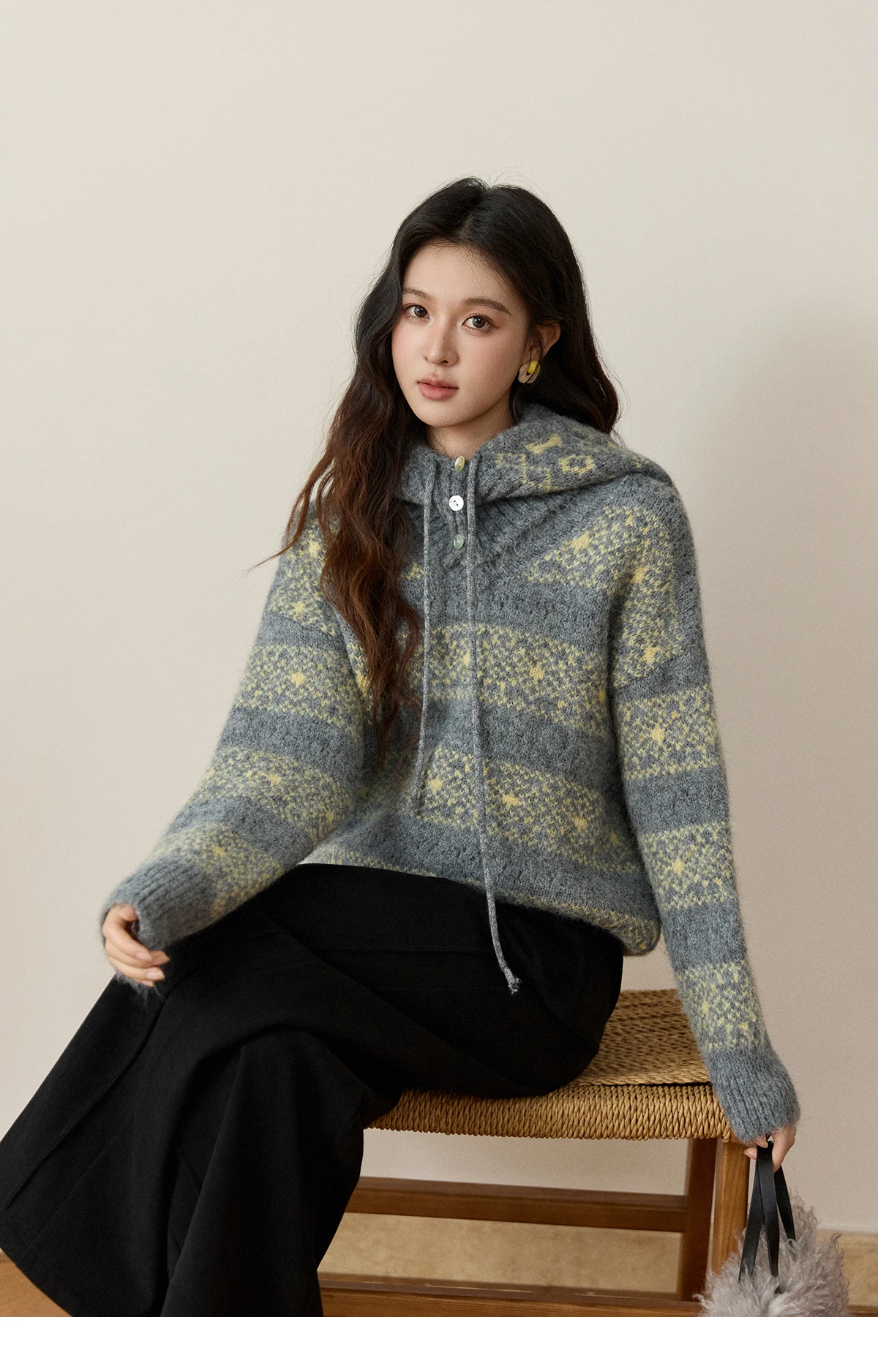MISHOW Women's Fair Isle Knitted Sweater 2025 Winter V-neck Wool Blend Casual Tops Removable Hood Warm Loose Sweaters MXE94Z2979