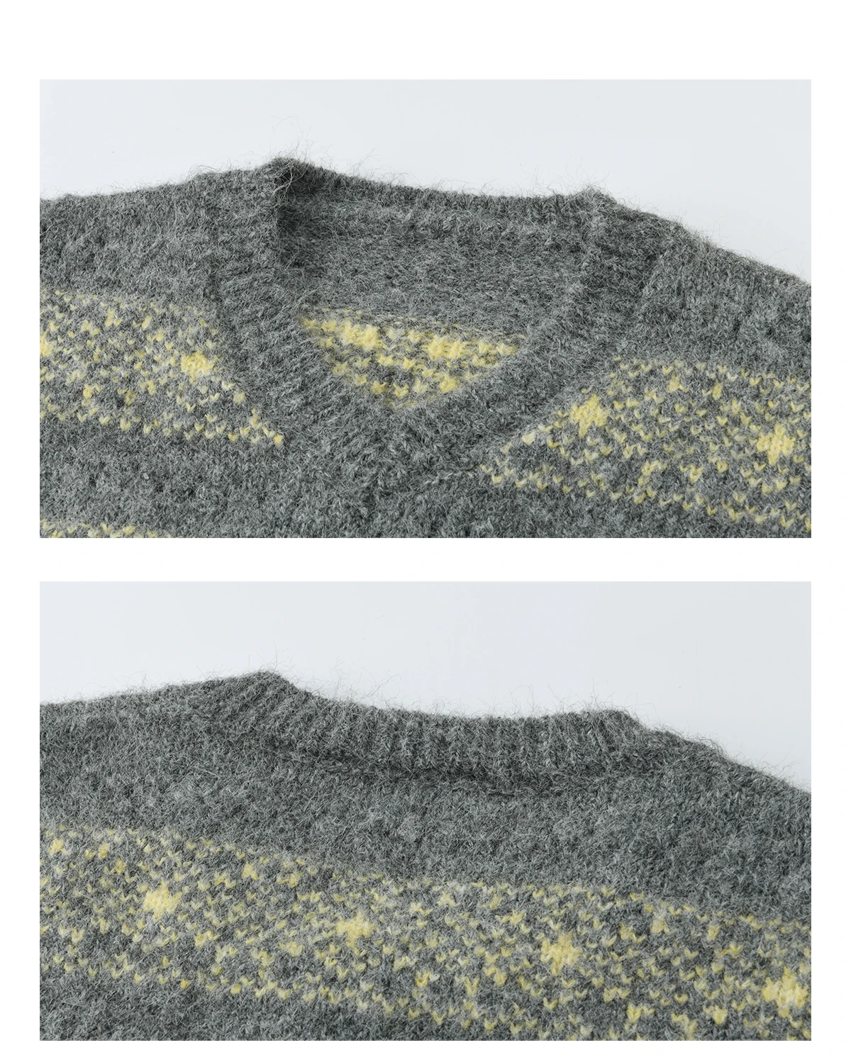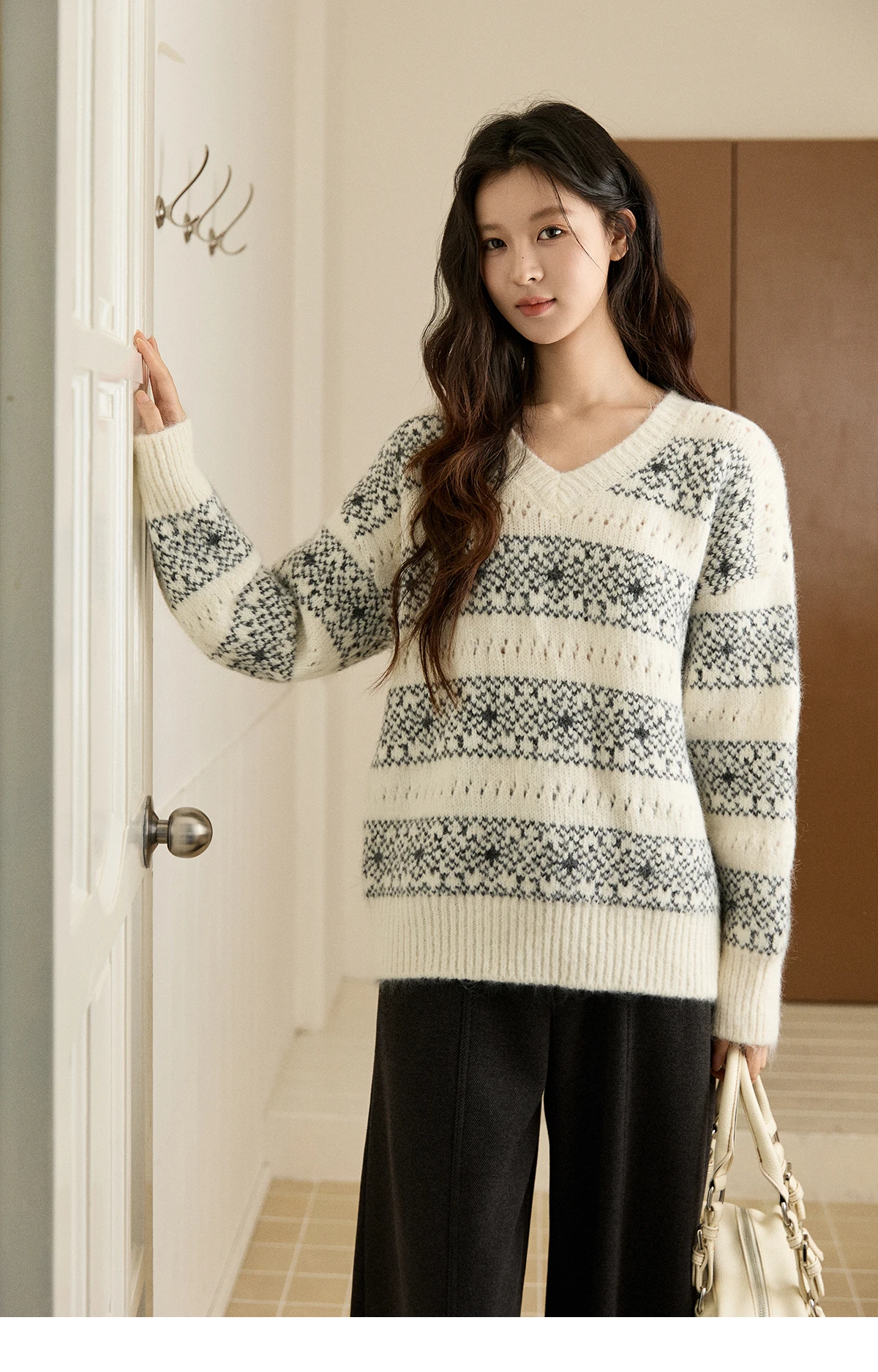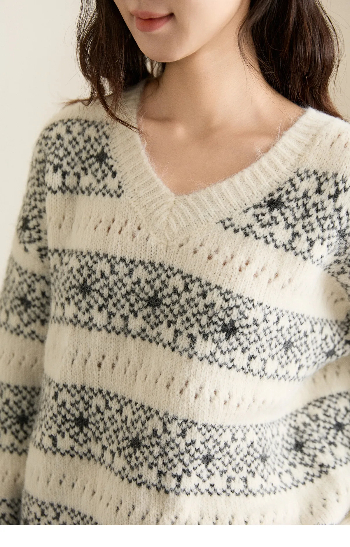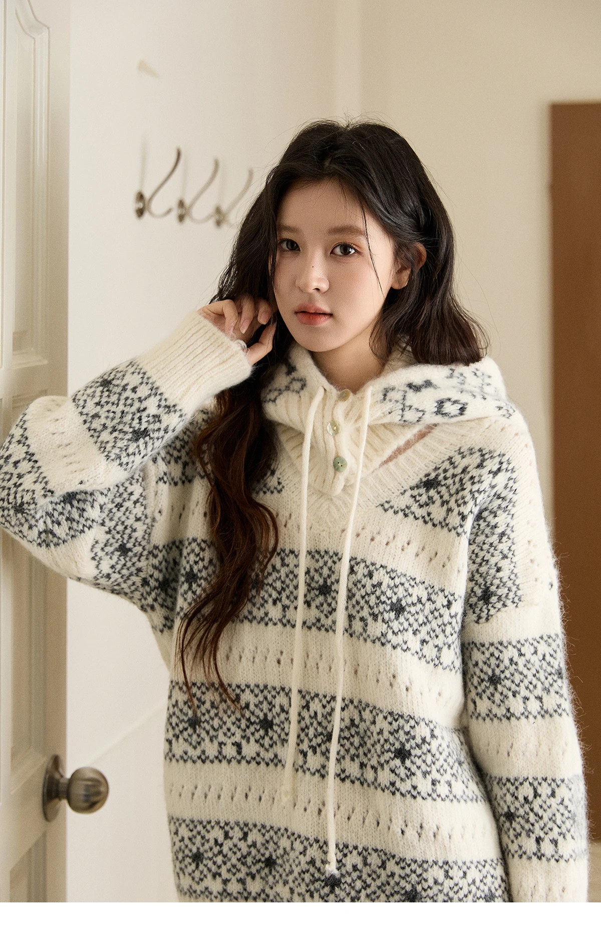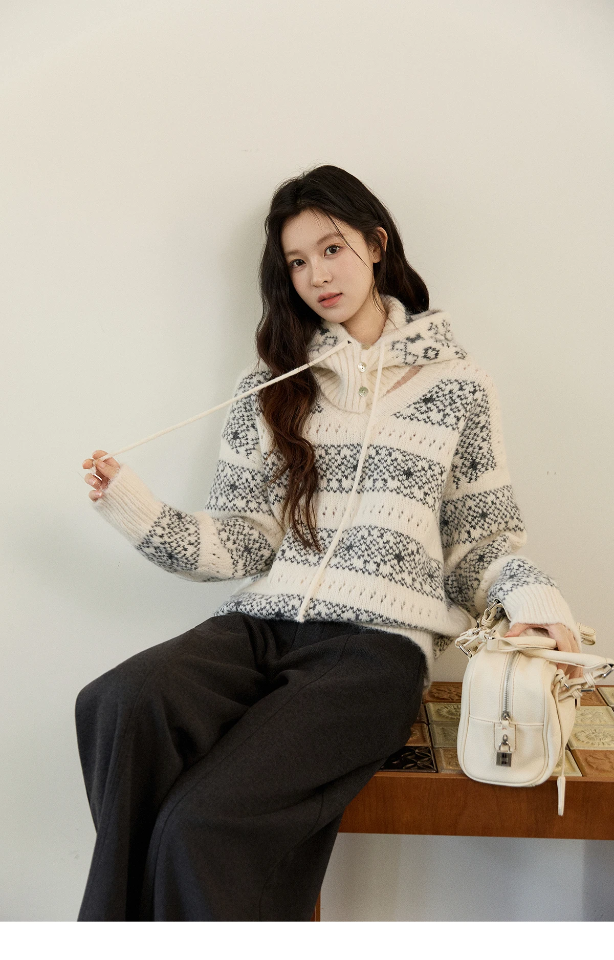 MISHOW Women's Fair Isle Knitted Sweater 2025 Winter V-neck Wool Blend Casual Tops Removable Hood Warm Loose Sweaters MXE94Z2979