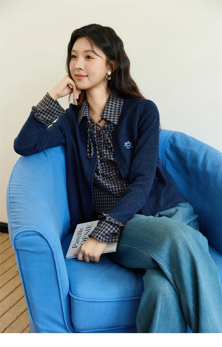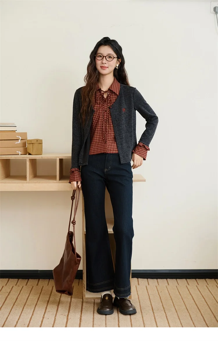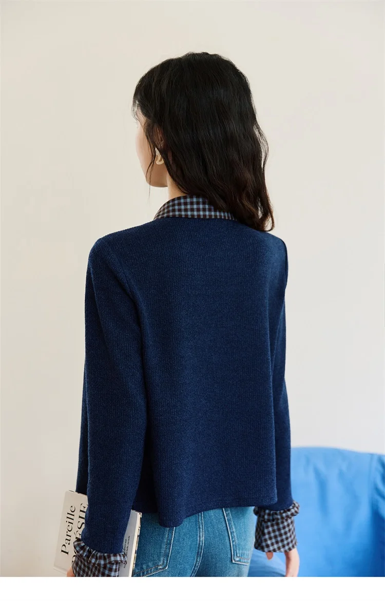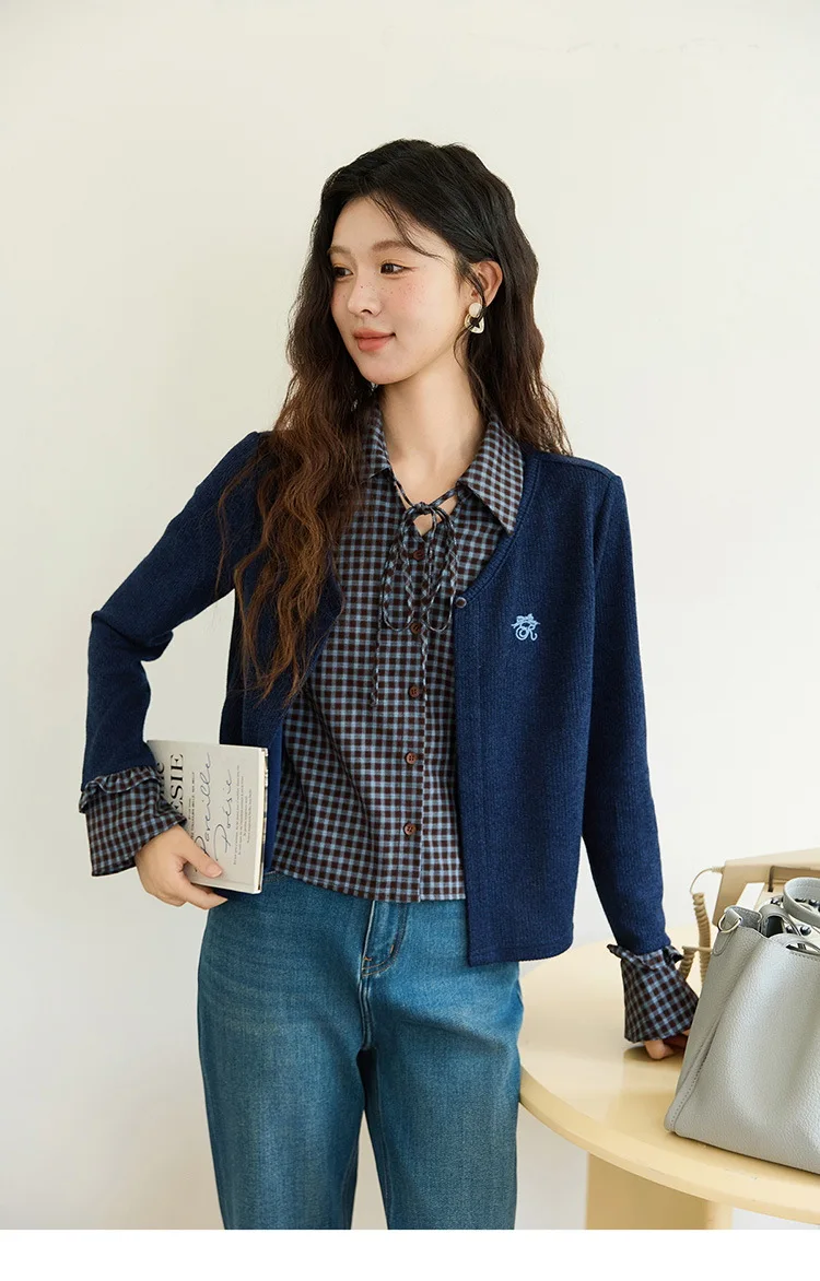MISHOW Women's Fake Two Knitted Sweaters 2025 Autumn Plaid Splicing Embroidered Tops Retro Lapel Flare Sleeve Tops MXE45Z1401