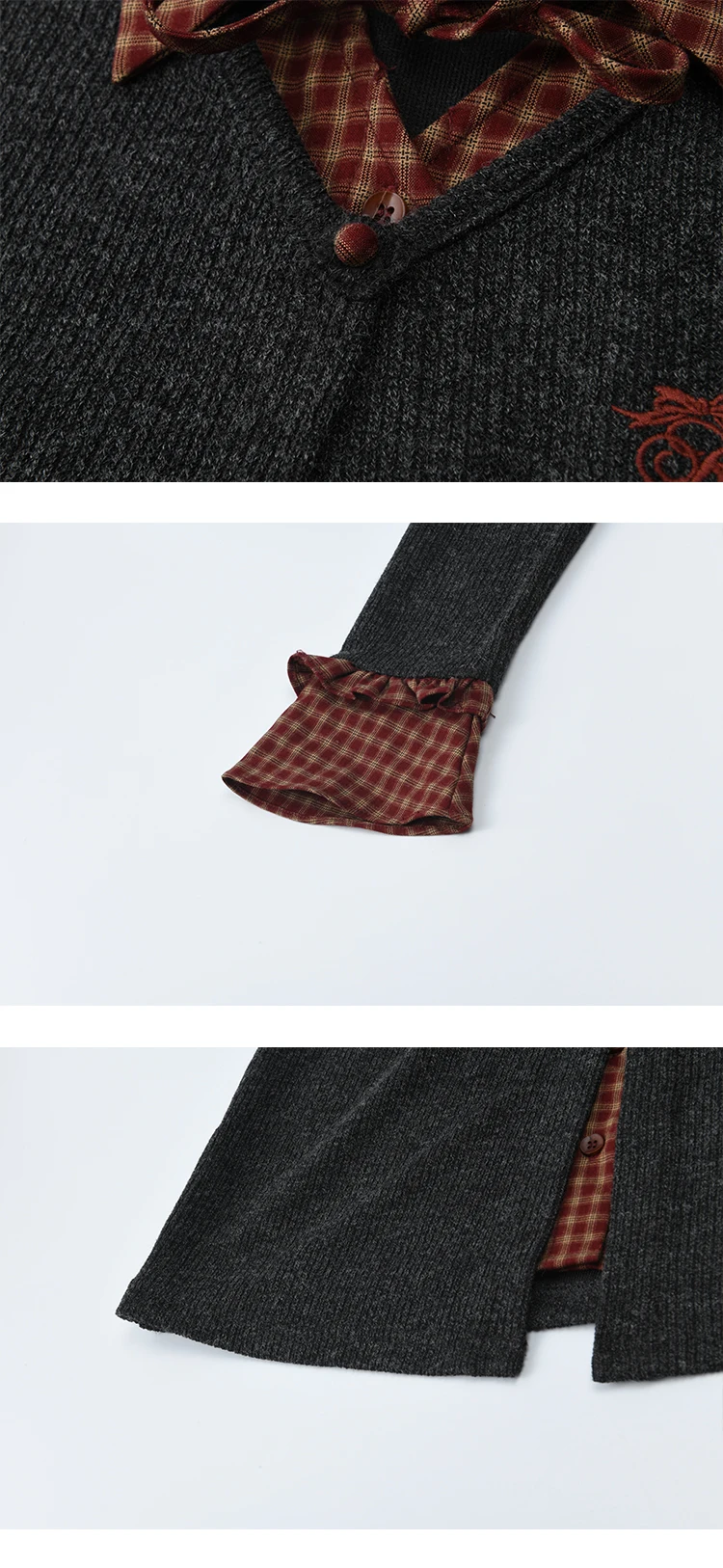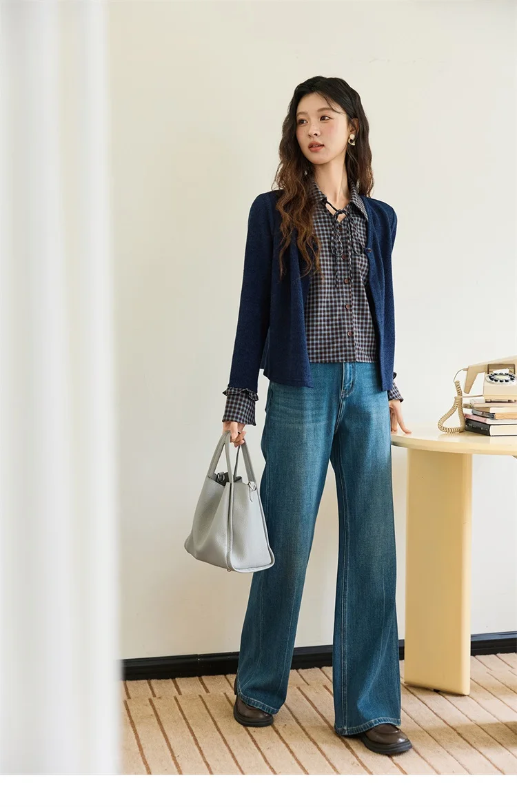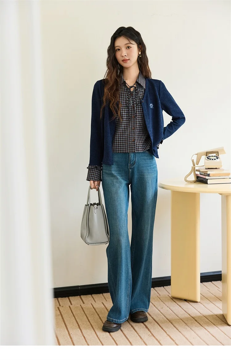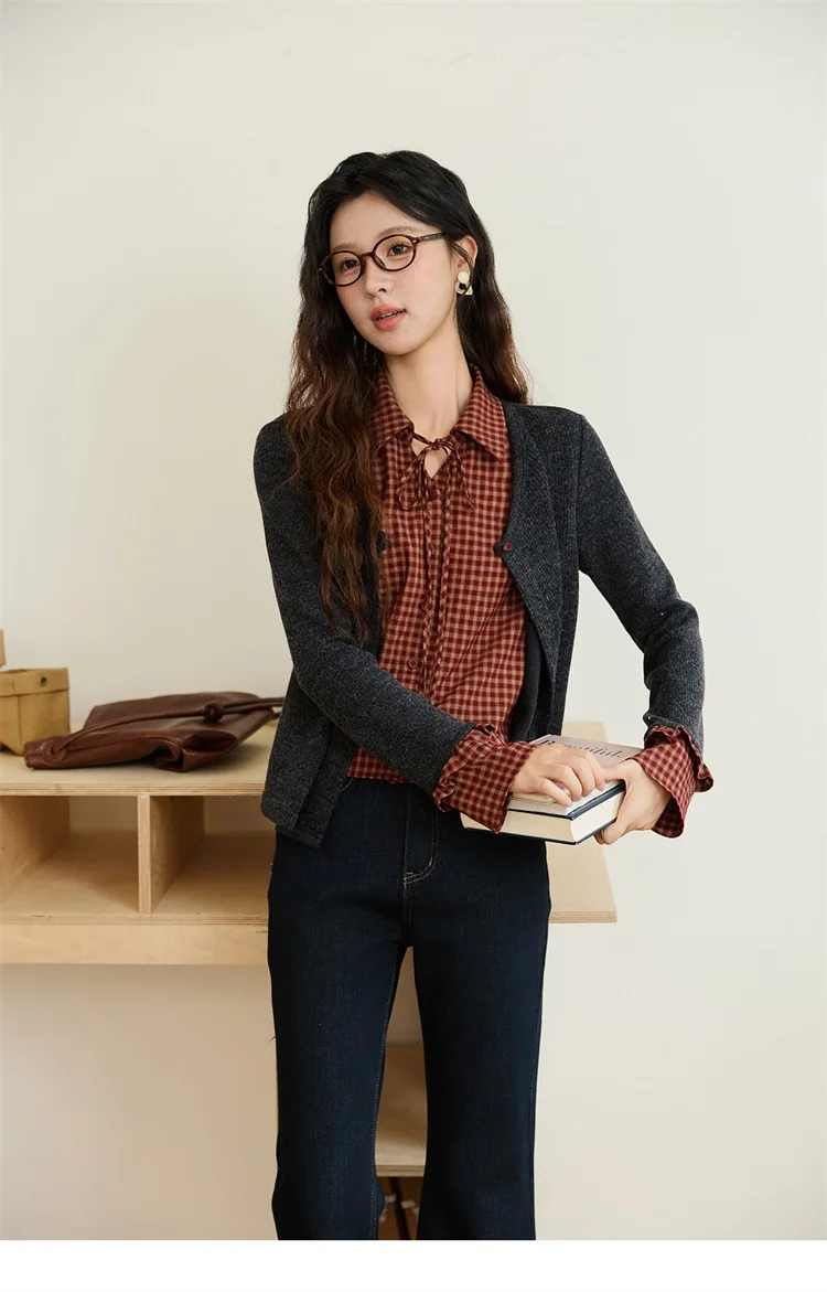 MISHOW Women's Fake Two Knitted Sweaters 2025 Autumn Plaid Splicing Embroidered Tops Retro Lapel Flare Sleeve Tops MXE45Z1401