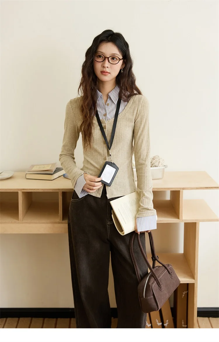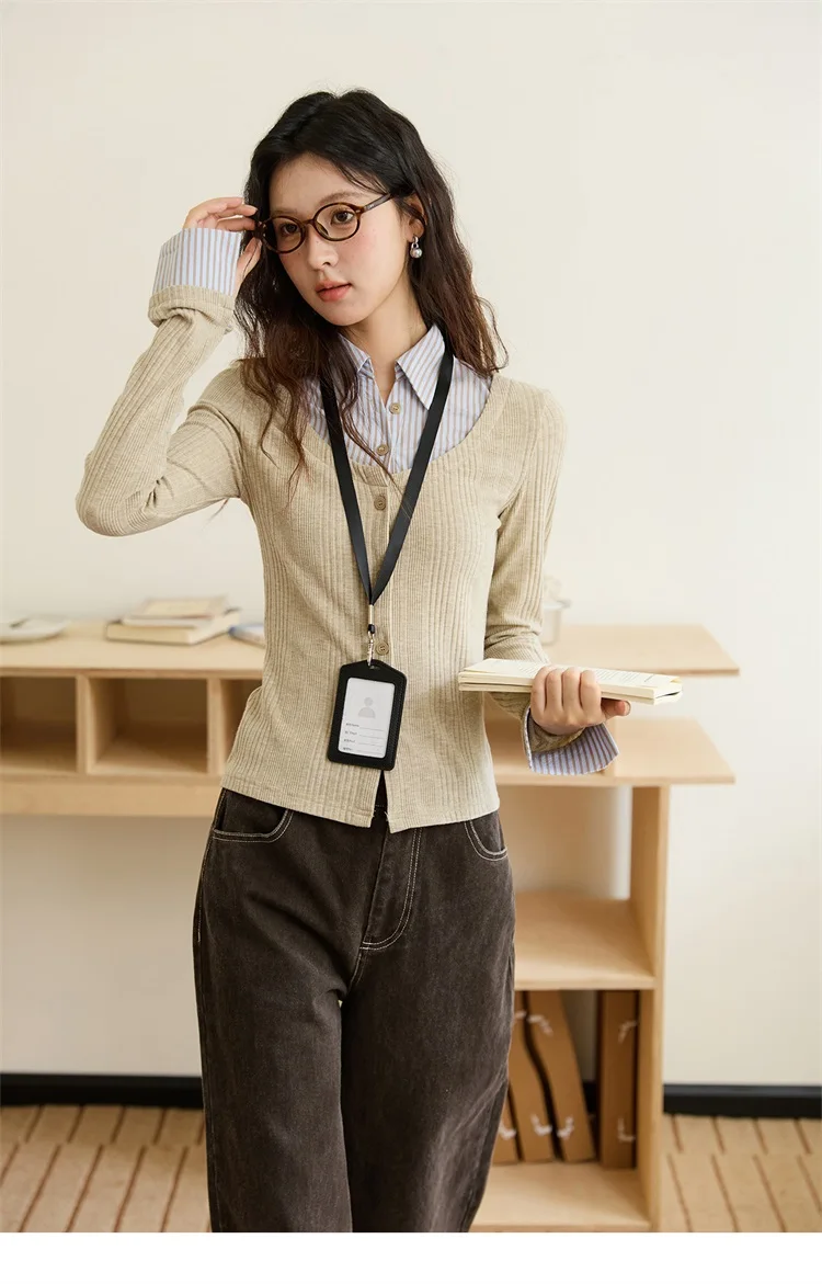 MISHOW Women's Fake Two Knitted Top 2025 Autumn Oat Shirt Collar Splicing Striped Cuffs Thin Sweaters Office Lady MXE46Z2535