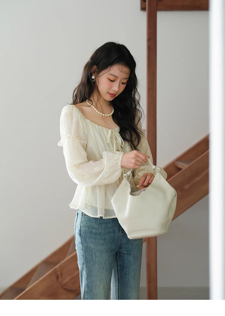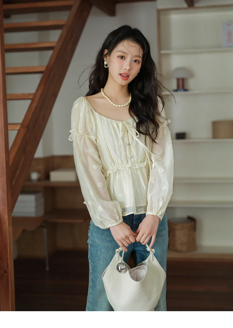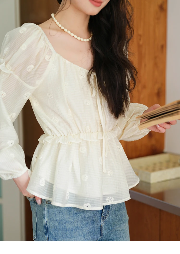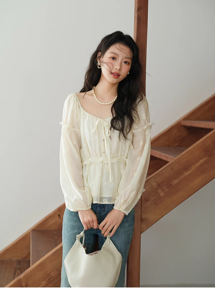 MISHOW Women's Fashion Cashew Flower Embroidered Blouse 2025 Autumn V-neck Lace Up Puff Sleeve Ladies Elegant Top MXE41X1945