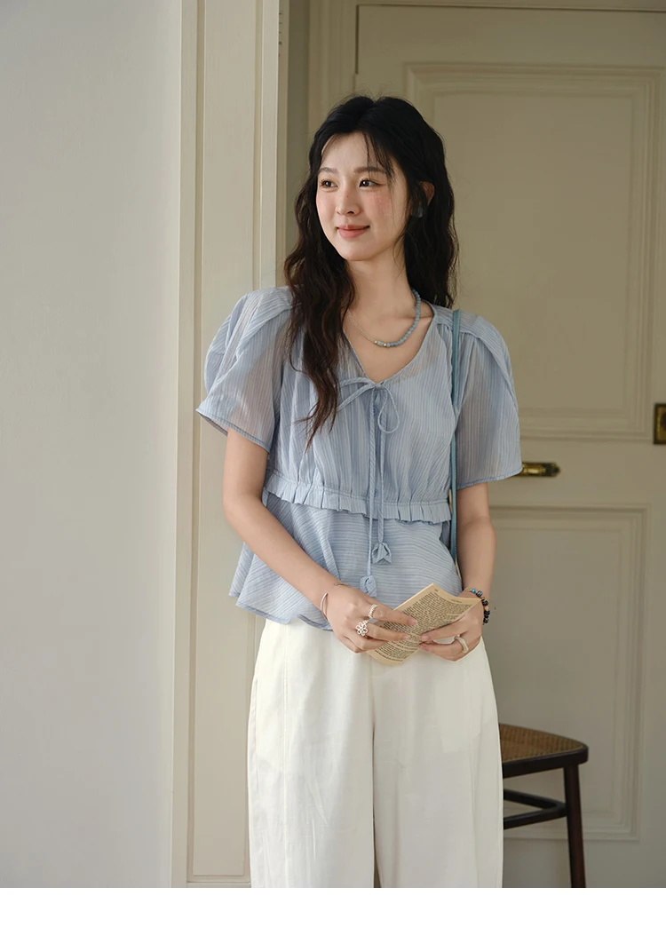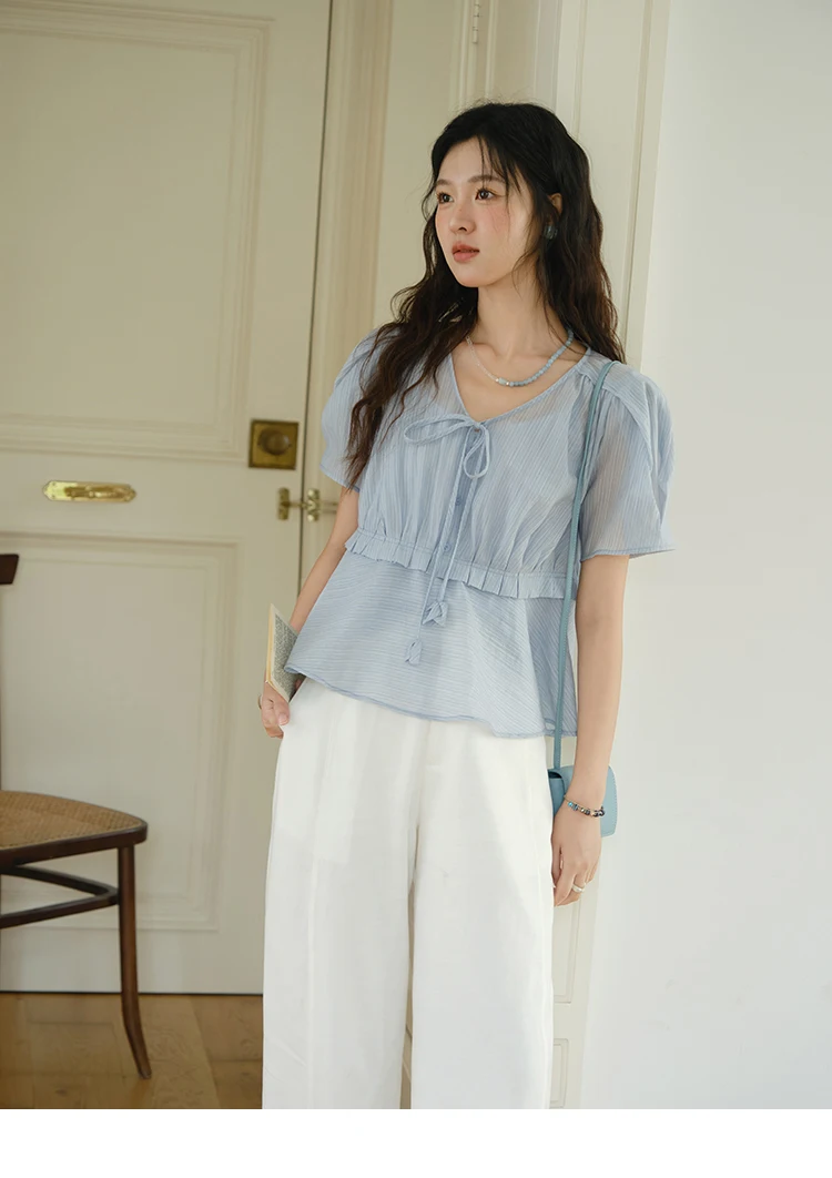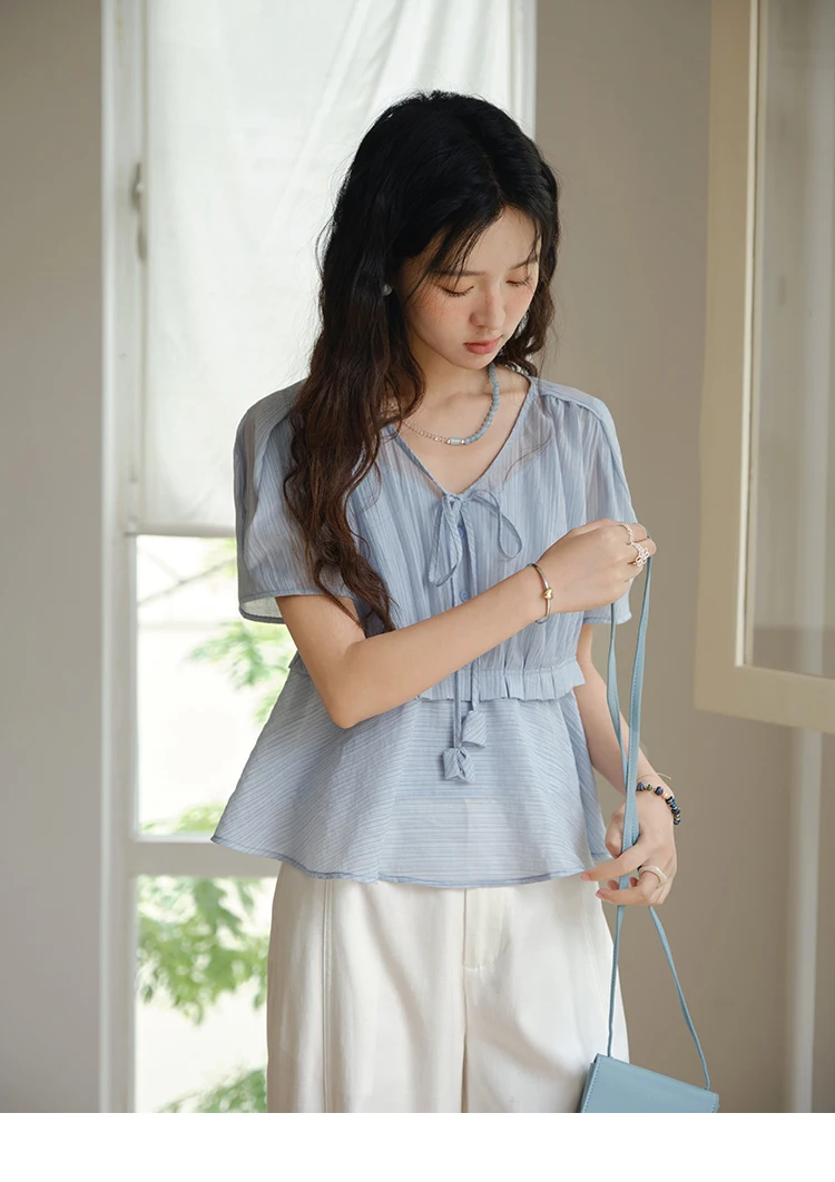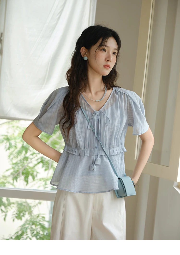 MISHOW Women's Fashion V-neck Blouse Summer 2025 New Splicing Button Commut Ladies Lace Up Casual Short Sleeve Top MXE34X1821