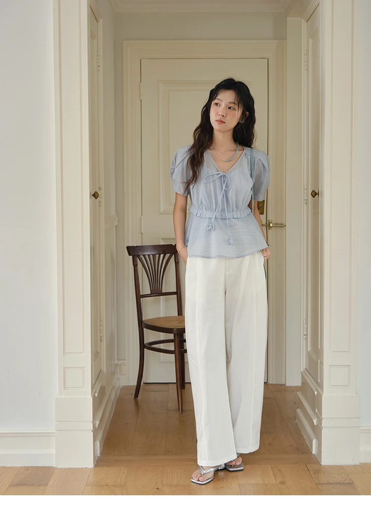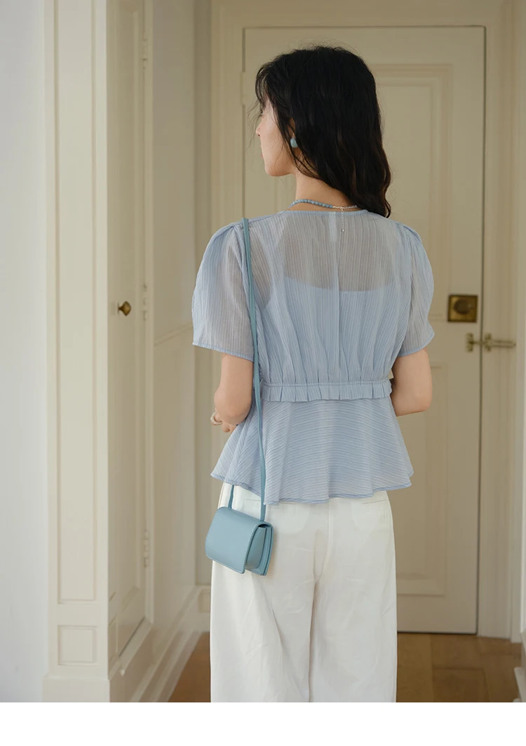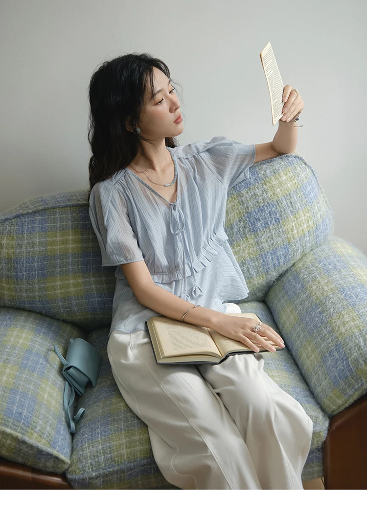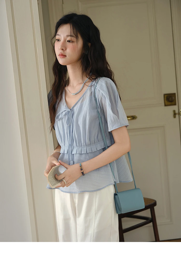 MISHOW Women's Fashion V-neck Blouse Summer 2025 New Splicing Button Commut Ladies Lace Up Casual Short Sleeve Top MXE34X1821