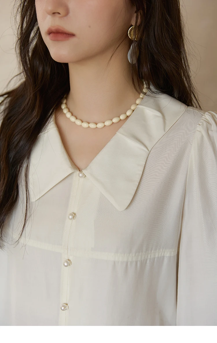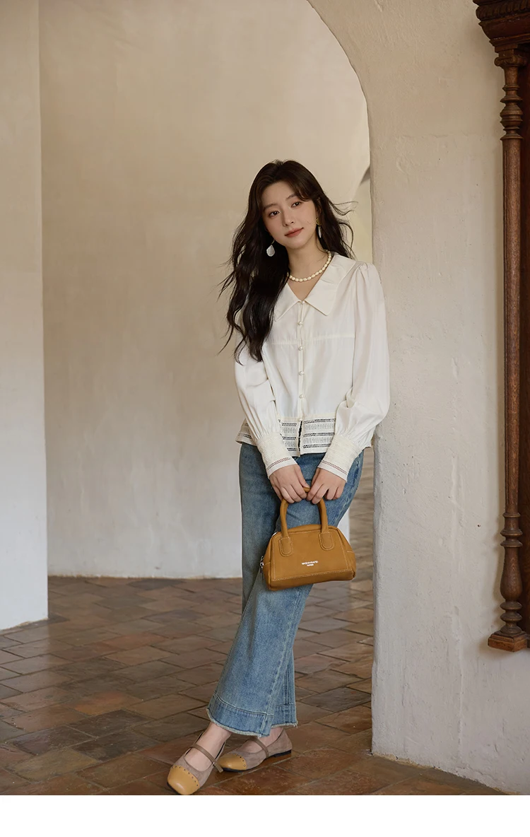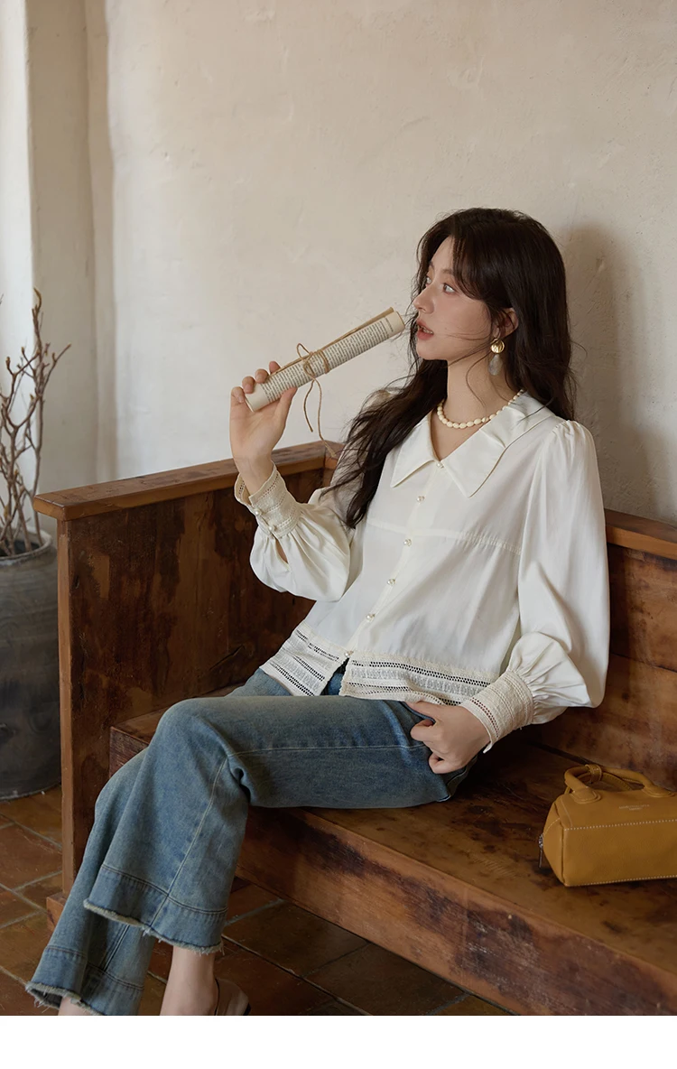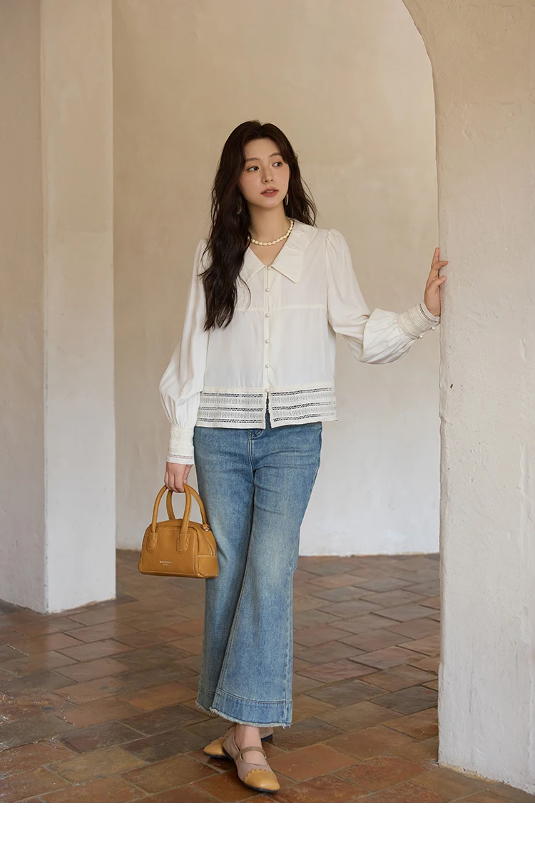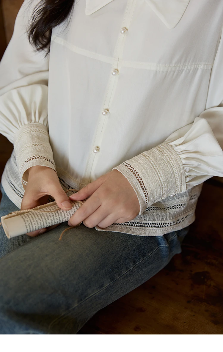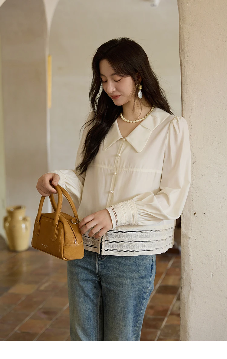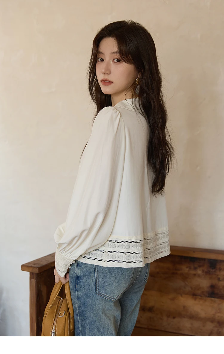 MISHOW Women's French Lace Patchwork Shirt 2025 Autumn Butterfly Collar Lantern Sleeves Apricot Elegant Commuting Top MXE41C2357