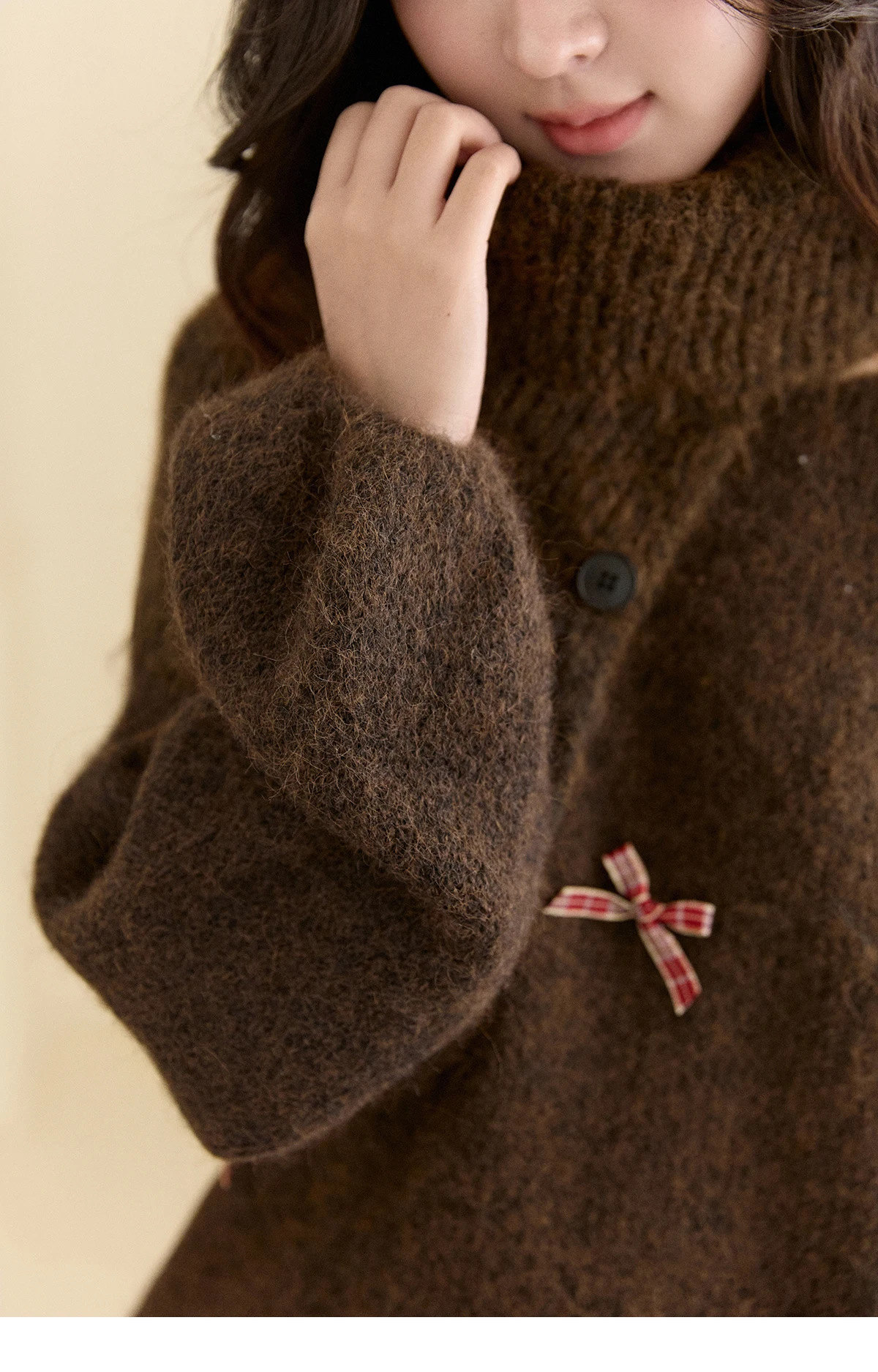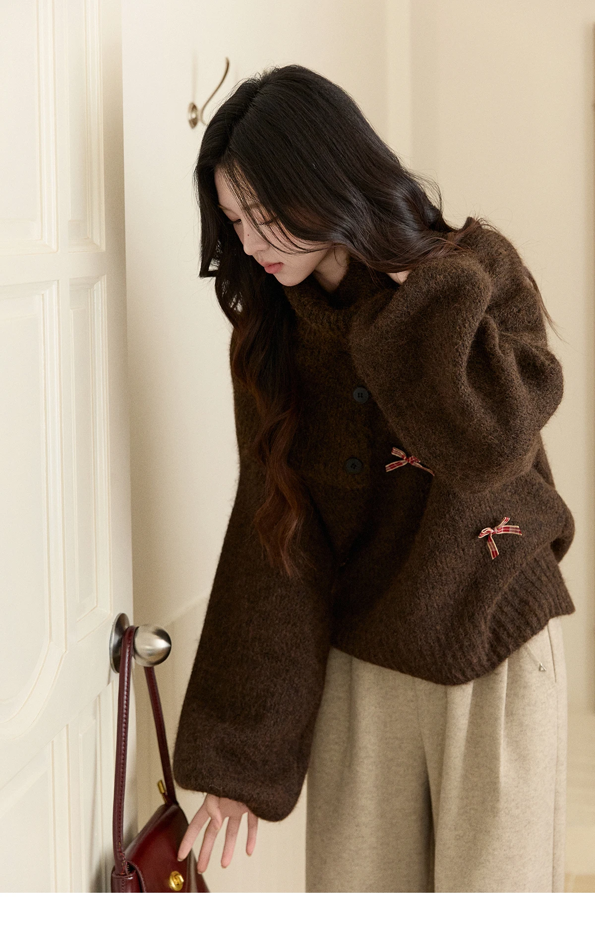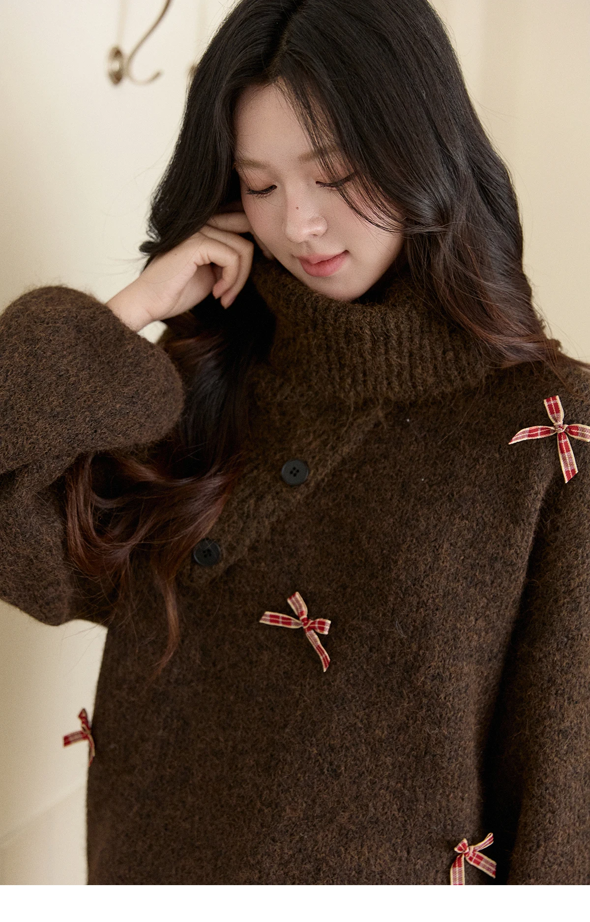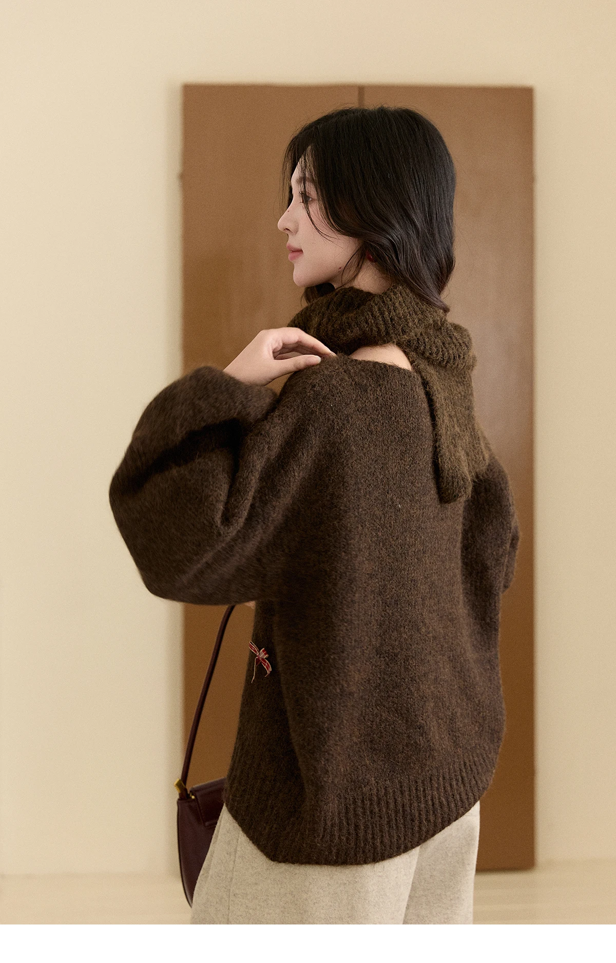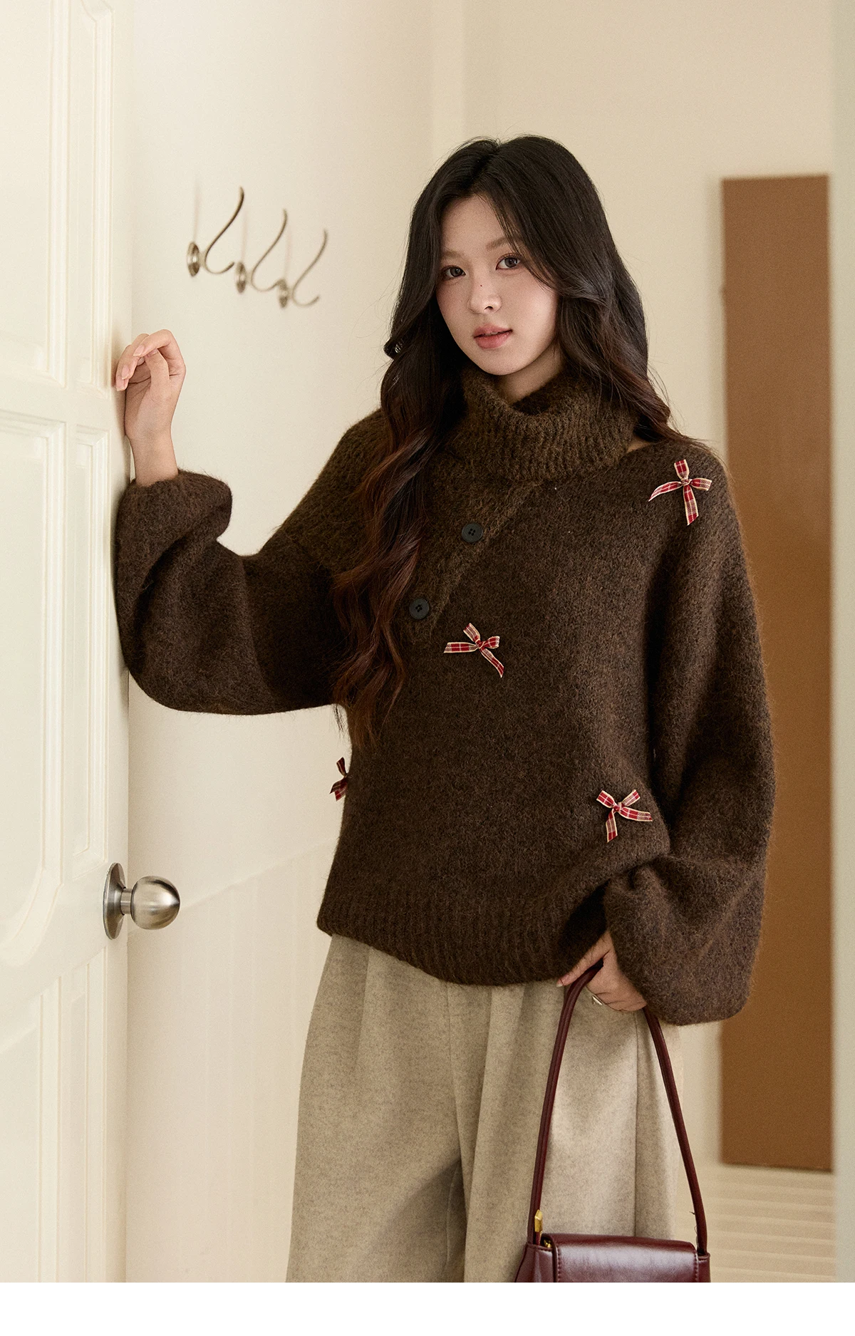 MISHOW Women's French Retro Plaid Bow Sweater 2025 Winter Detachable Shawl Collar Thick Lantern Sleeve Knitted Tops MXE93Z2946
