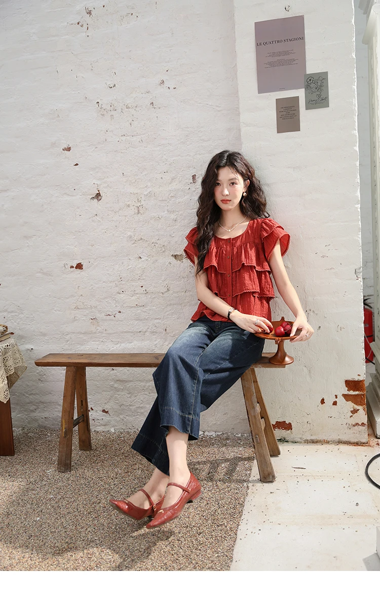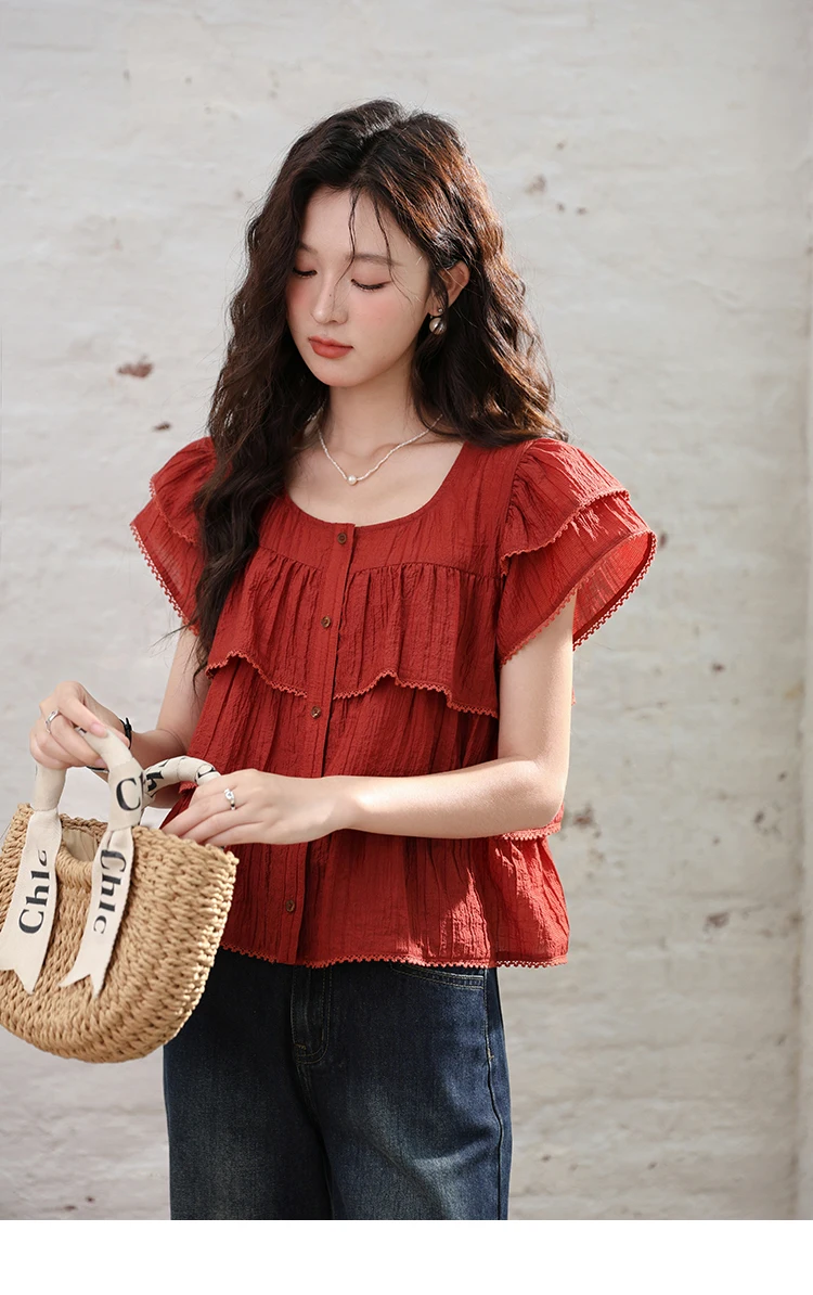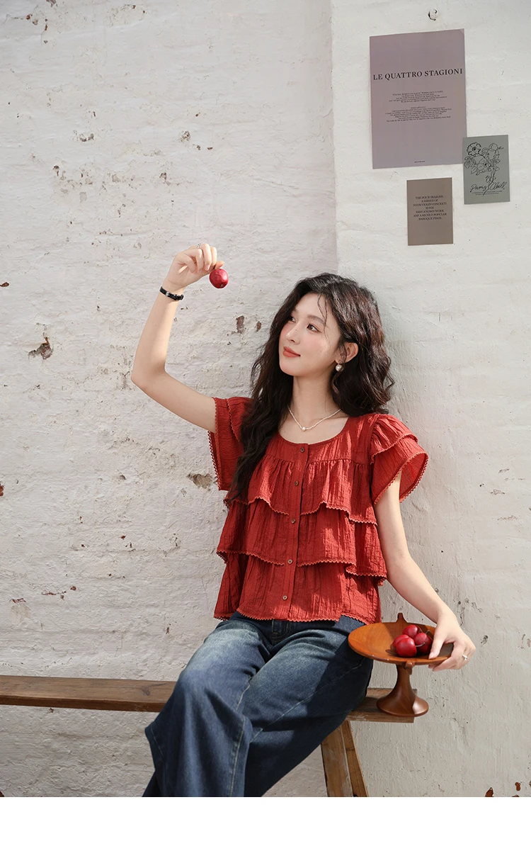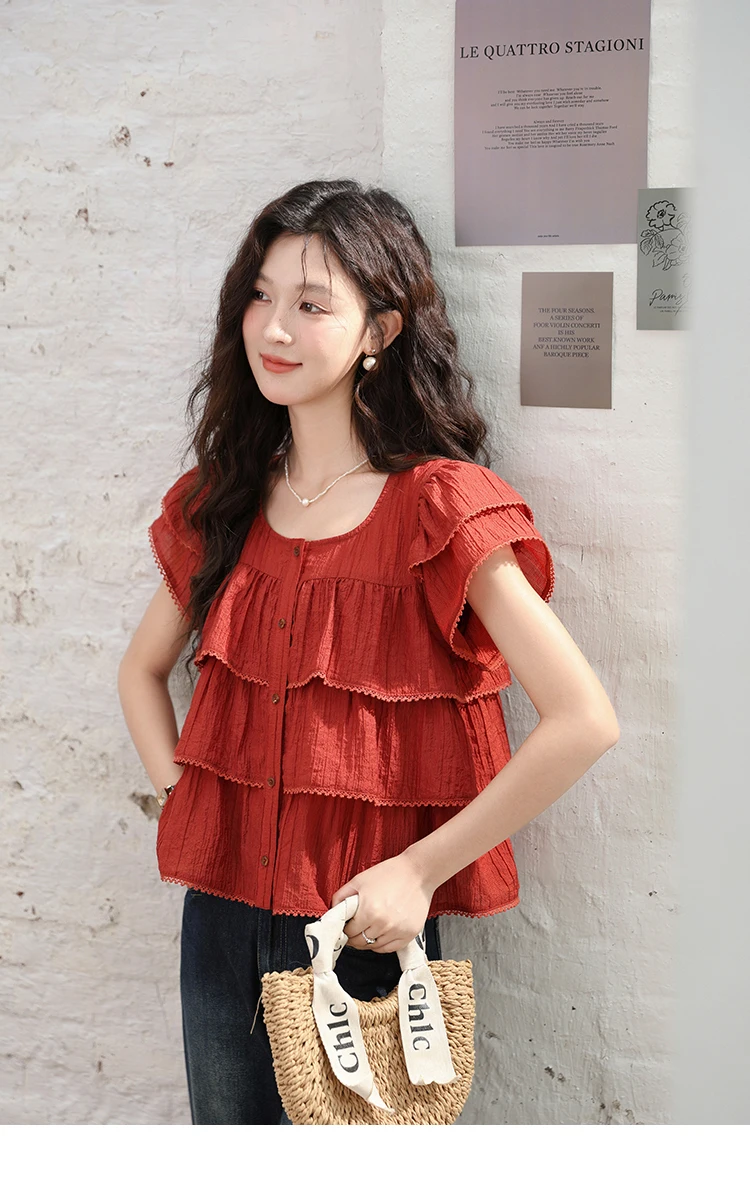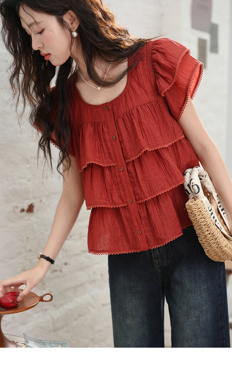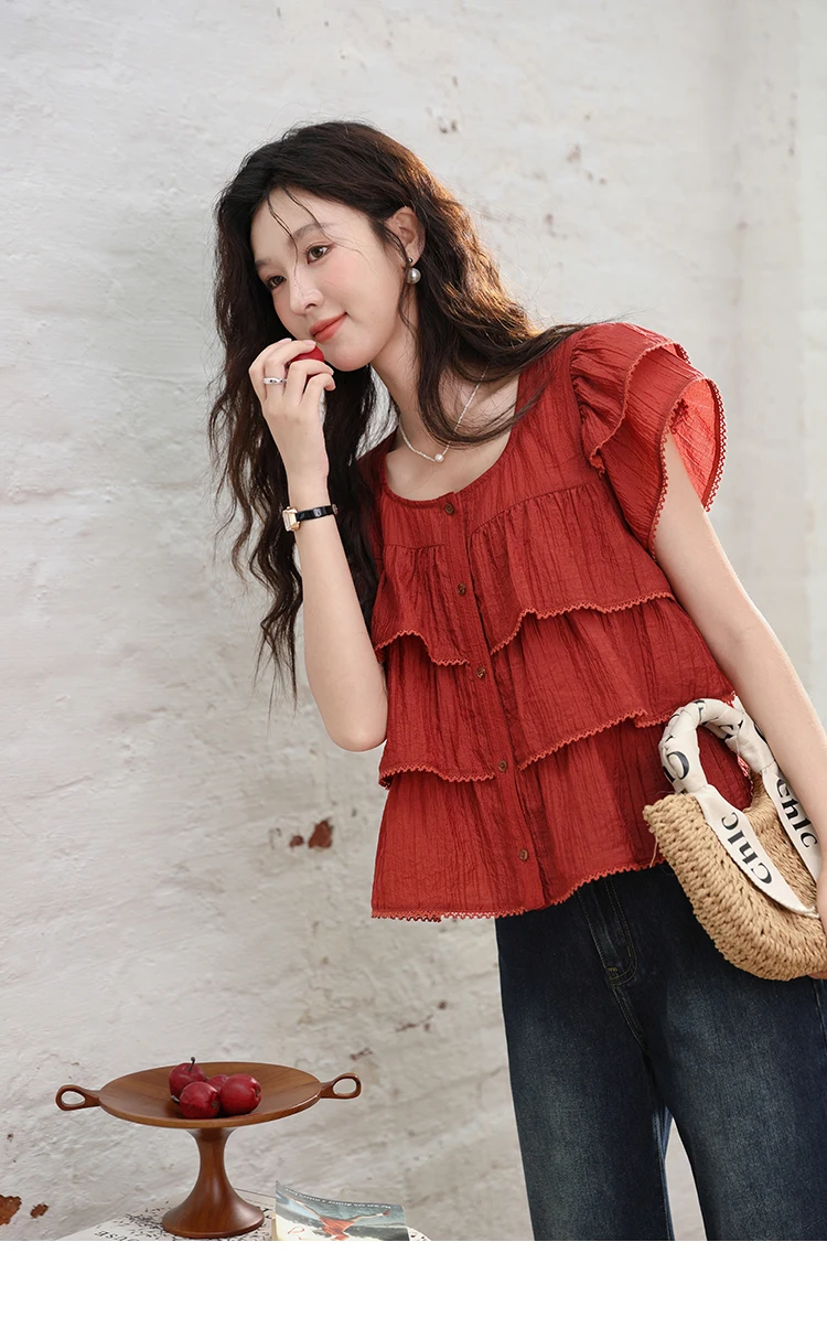 MISHOW Women's French Square Collar Blouses 2024 Summer Retro Red Ruffle Lace Cake Top Puff Sleeve Solid Sweet Blouse MXD30X1488