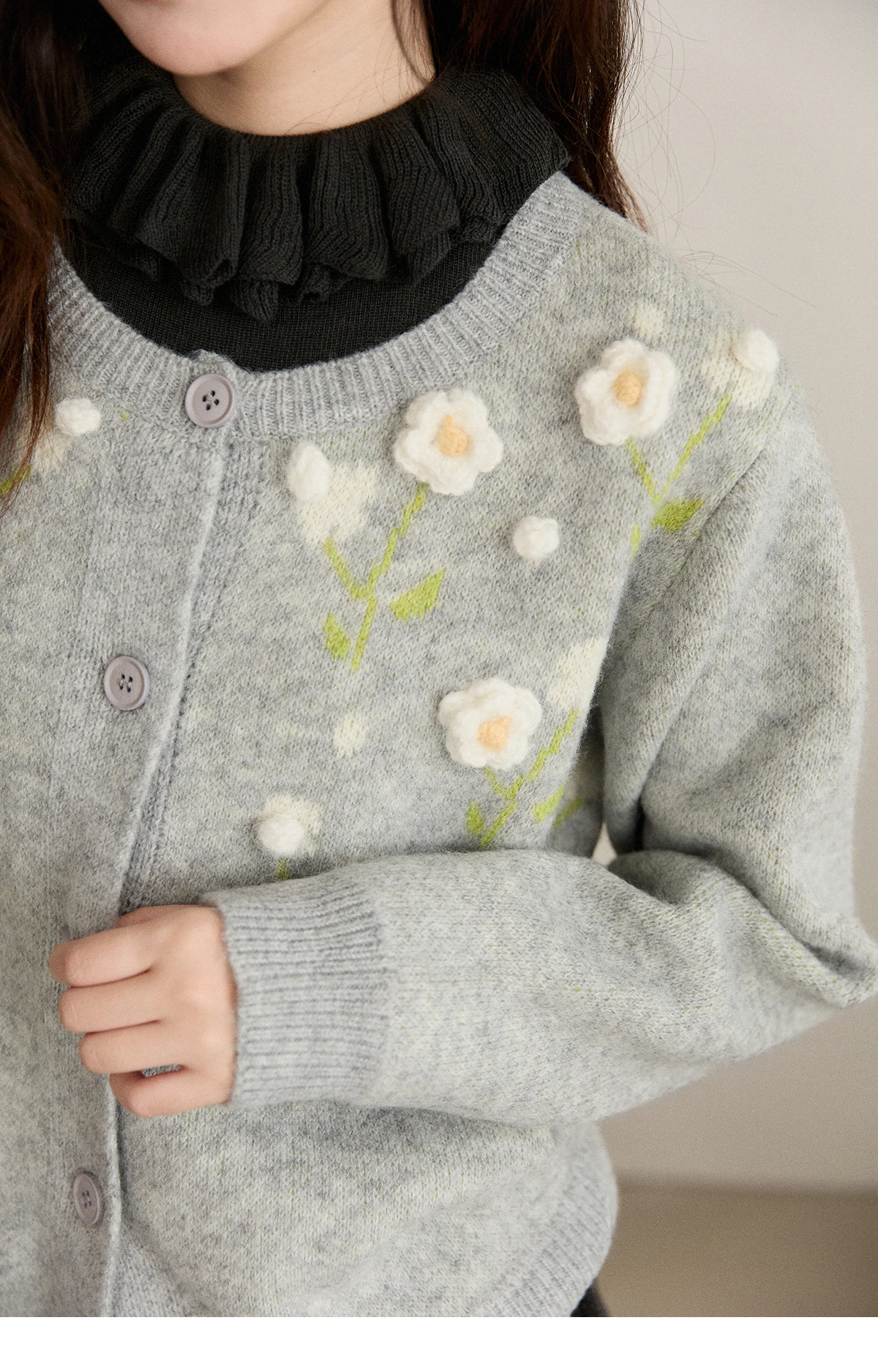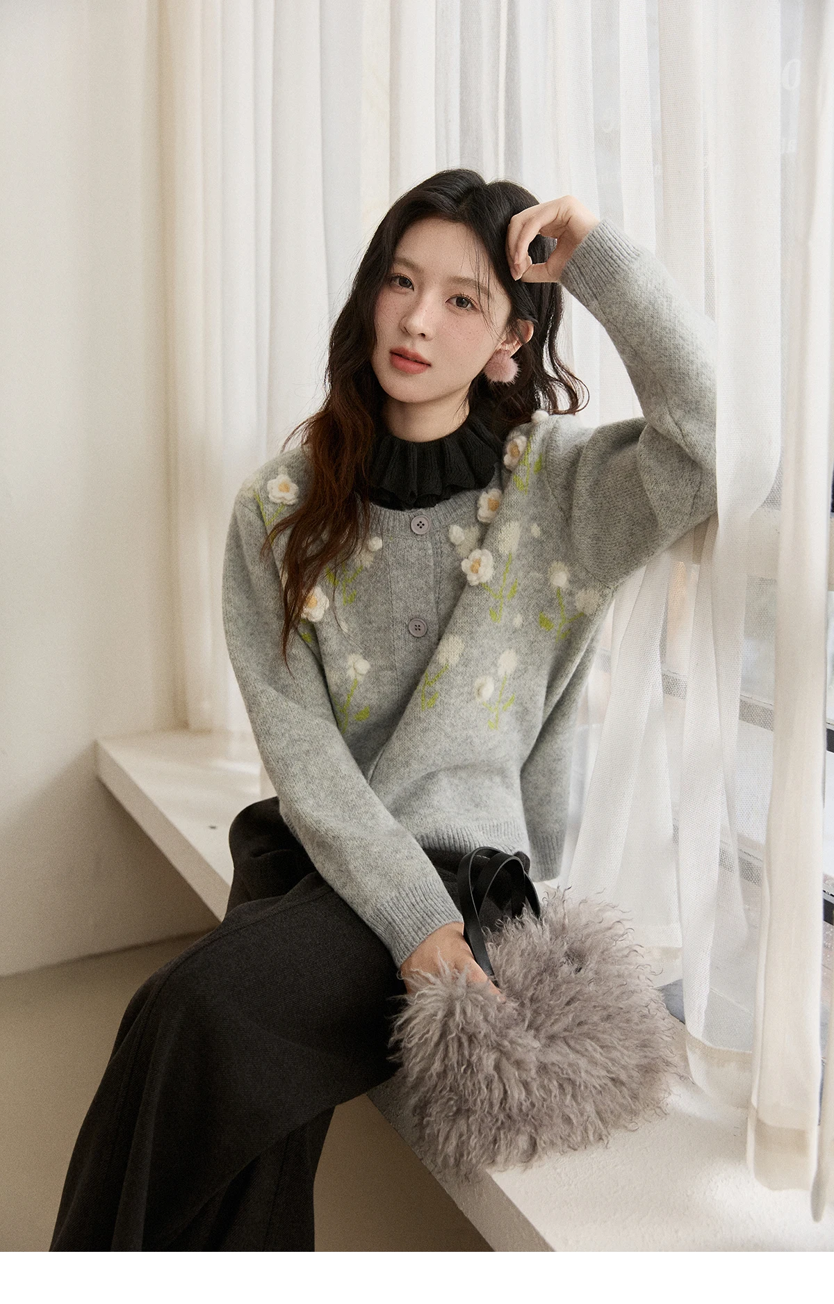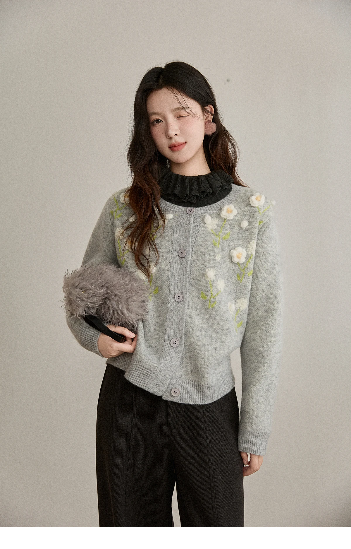 MISHOW Women's Gray Knitted Cardigan 2025 Winter Flower Embroidery Round Collar Single-breasted Warm Slim Sweaters MXE91Z2836