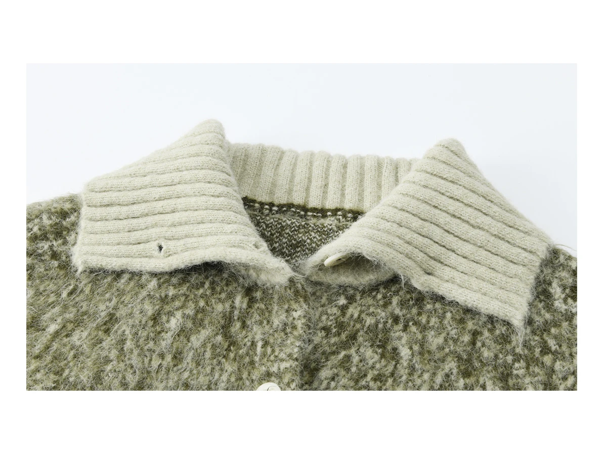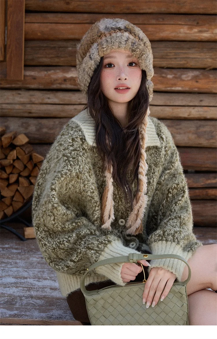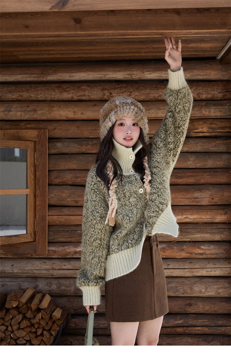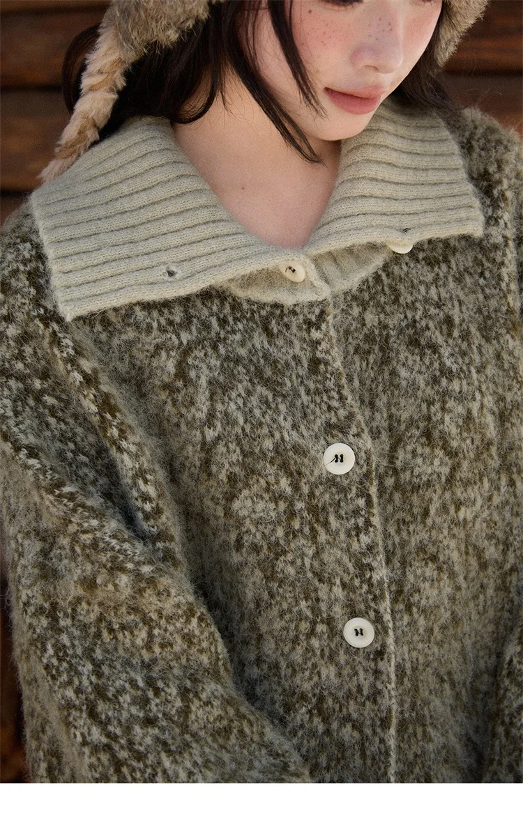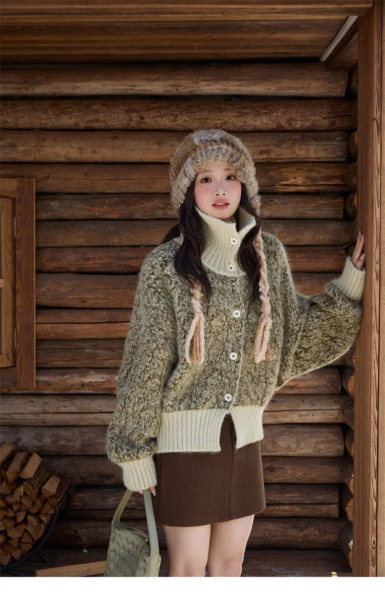 MISHOW Women's Green Retro Mottled Sweater Winter 2025 Casual Stand-up Collar Batwing Sleeves Knitted Cardigan tops MXE90Z2787